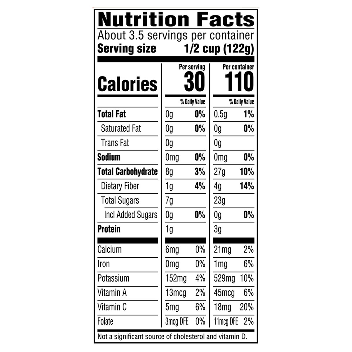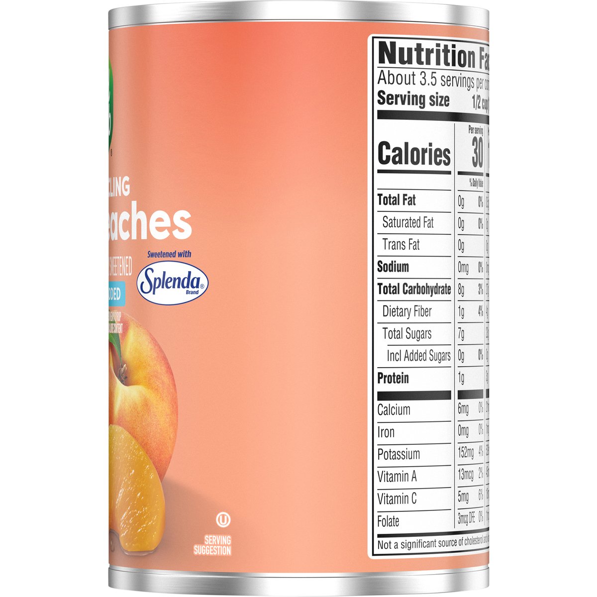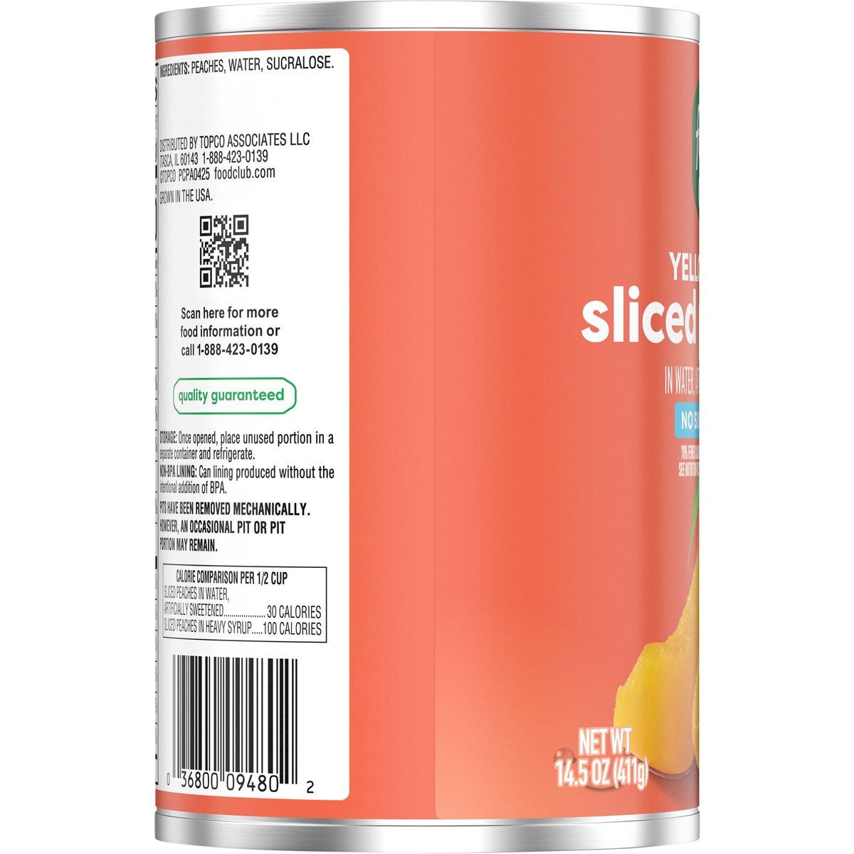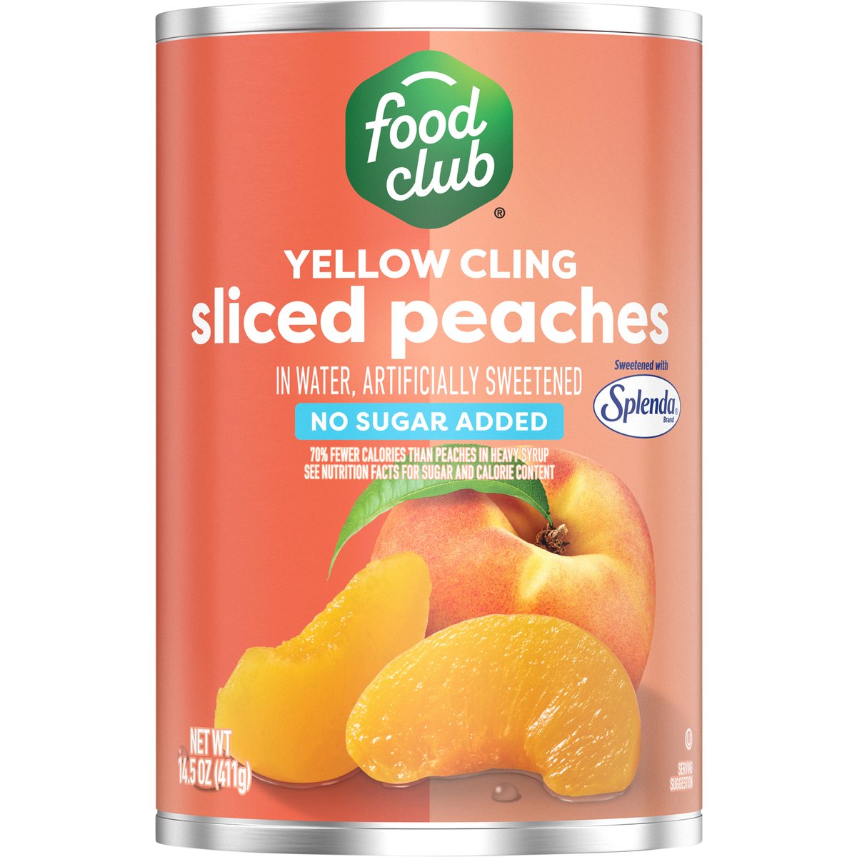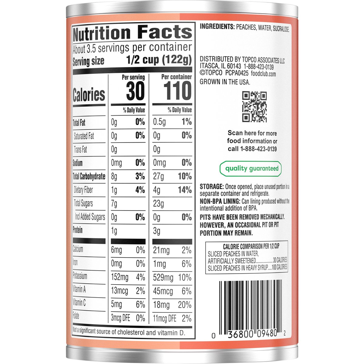 Sliced peaches in water, artificially sweetened. No sugar added. 70% fewer calories than peaches in heavy syrup. See nutrition facts for sugar and calorie content. Calorie Comparison per 1/2 Cup: Sliced peaches in water, artificial sweetened - 30 calories. Sliced peaches in heavy syrup - 100 calories. Sweetened with Splenda brand. Quality guaranteed. foodclub.com. Scan for more food information or call 1-888-423-0139. Non-BPA Lining: Can lining produced without the intentional addition of BPA. Grown in the USA.