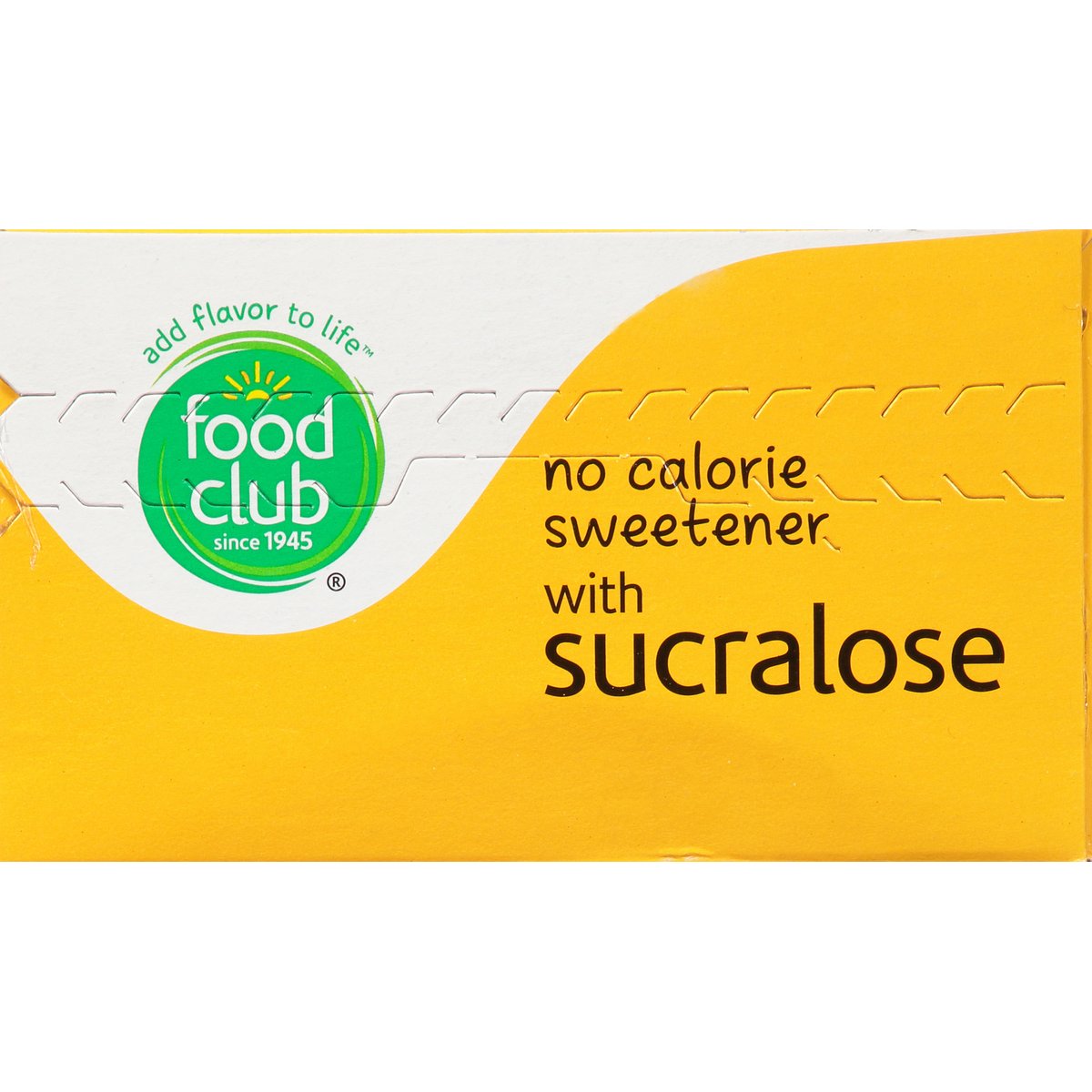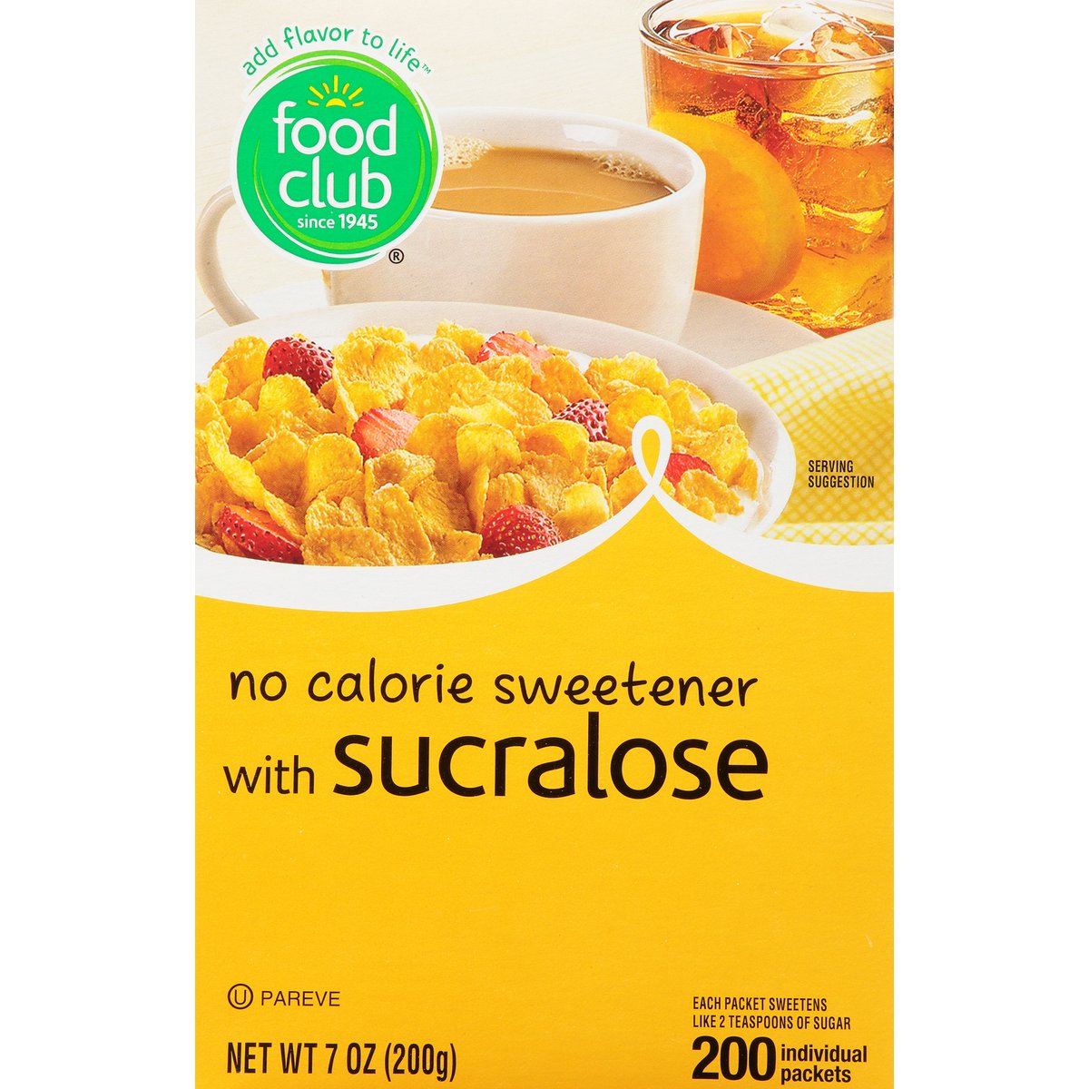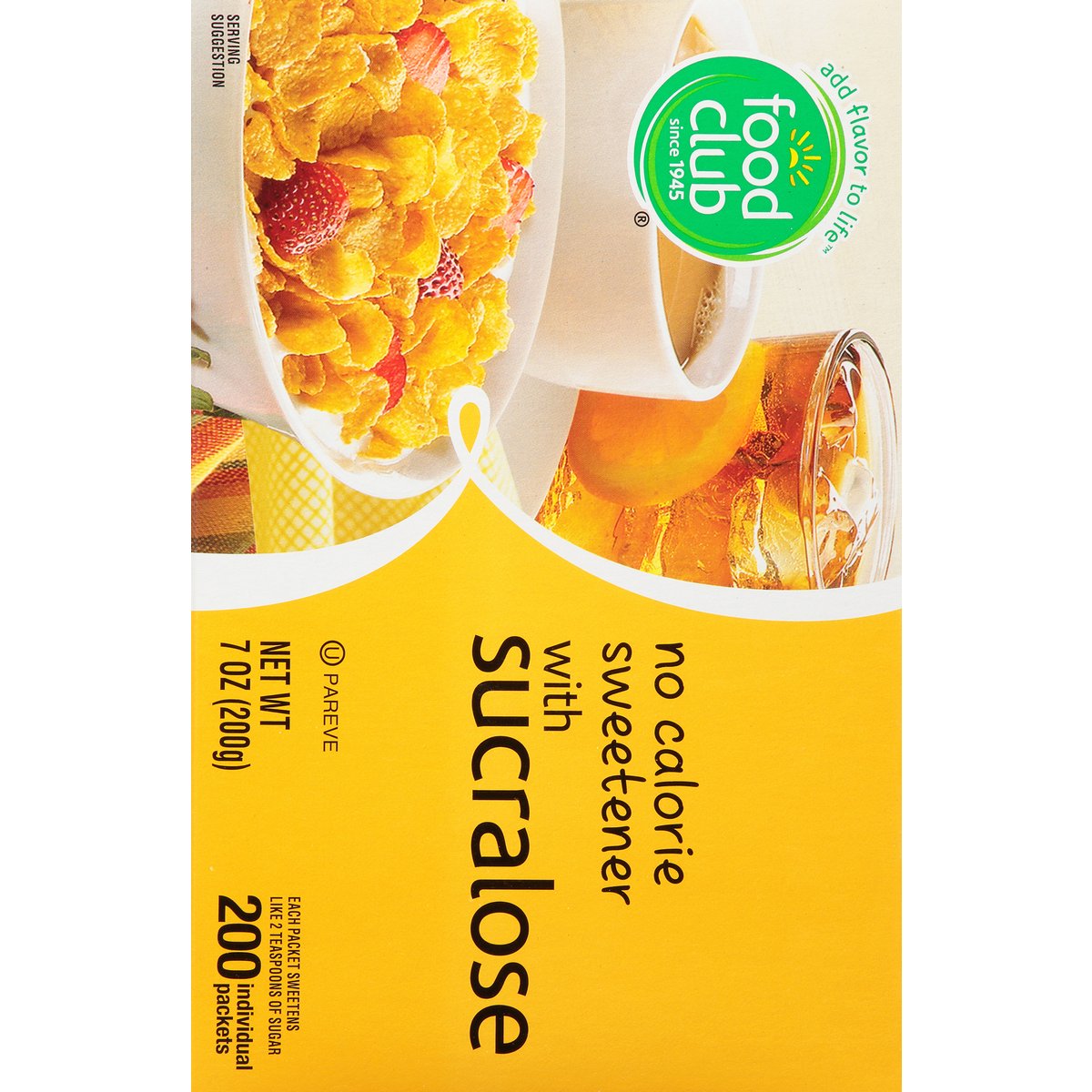 No calorie. 200 individual packets. Add flavor to life. Since 1945. Each packet sweetens like 2 teaspoons of sugar. Suitable for individuals with diabetes. Sold by packet count and total carton weight. Some settling of carton contents may have occurred during shipment. Quality Guaranteed: 100% satisfaction or double your money back. www.foodclubbrand.com. Scan for more food information or call 1-888-423-0139. Please recycle. Carton 100% recyclable. Printed on 100% recycled material.