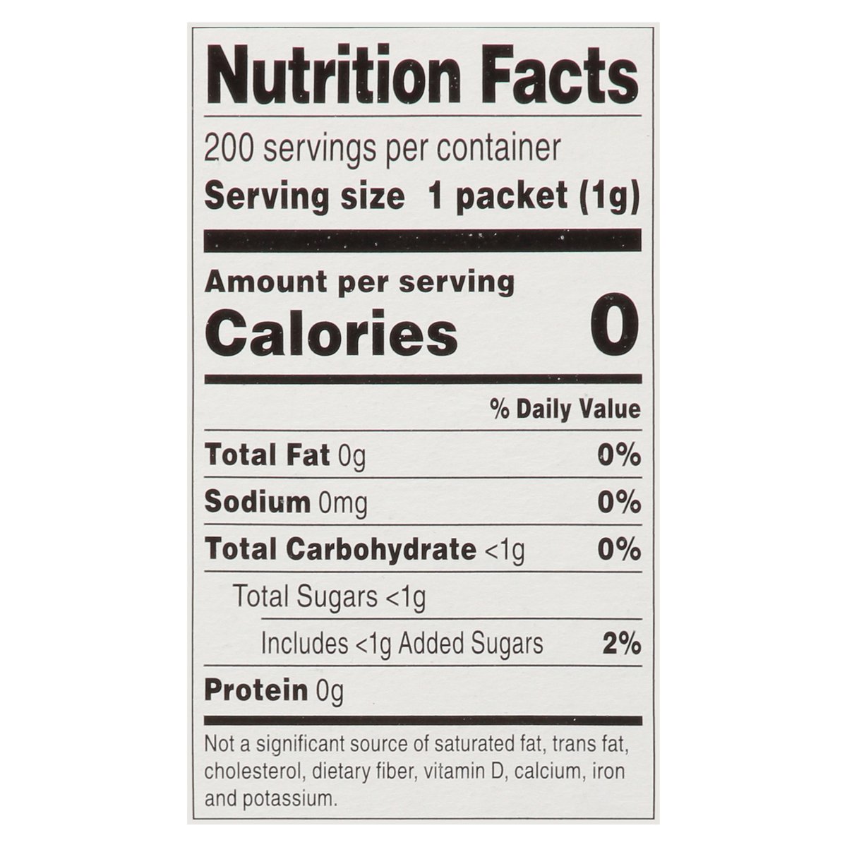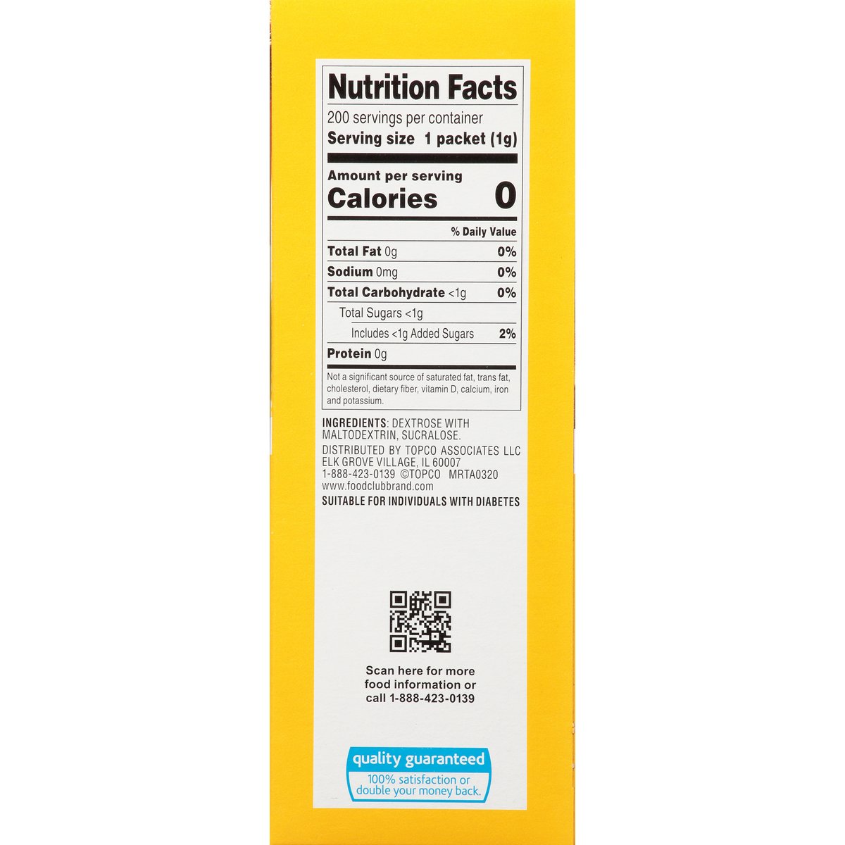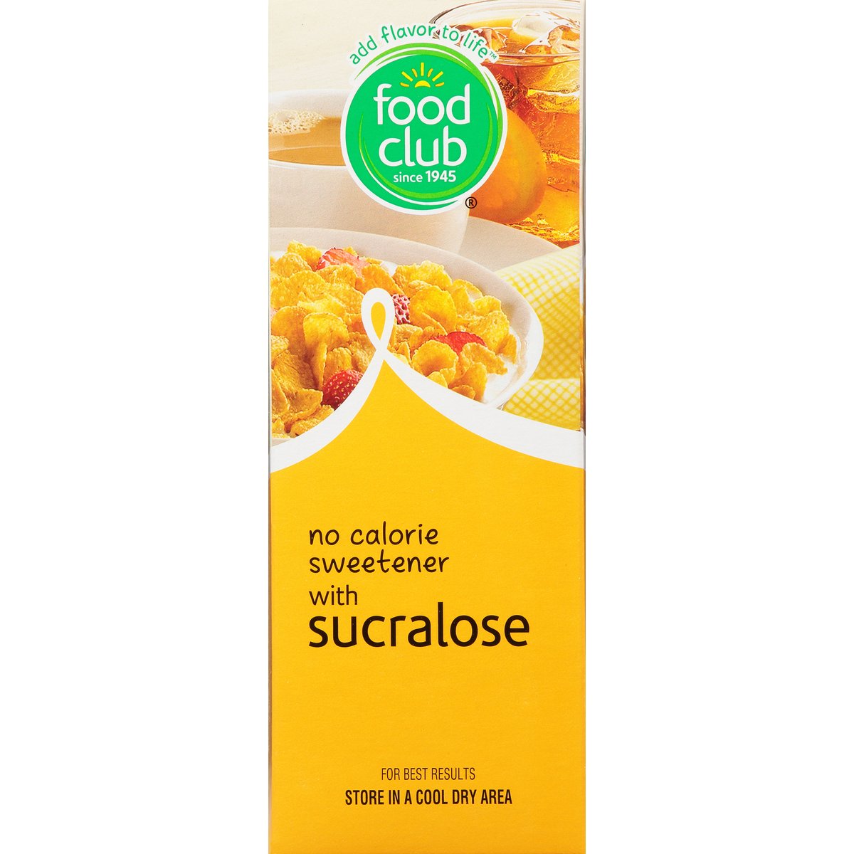 No calorie. 200 individual packets. Add flavor to life. Since 1945. Each packet sweetens like 2 teaspoons of sugar. Suitable for individuals with diabetes. Sold by packet count and total carton weight. Some settling of carton contents may have occurred during shipment. Quality Guaranteed: 100% satisfaction or double your money back. www.foodclubbrand.com. Scan for more food information or call 1-888-423-0139. Please recycle. Carton 100% recyclable. Printed on 100% recycled material.