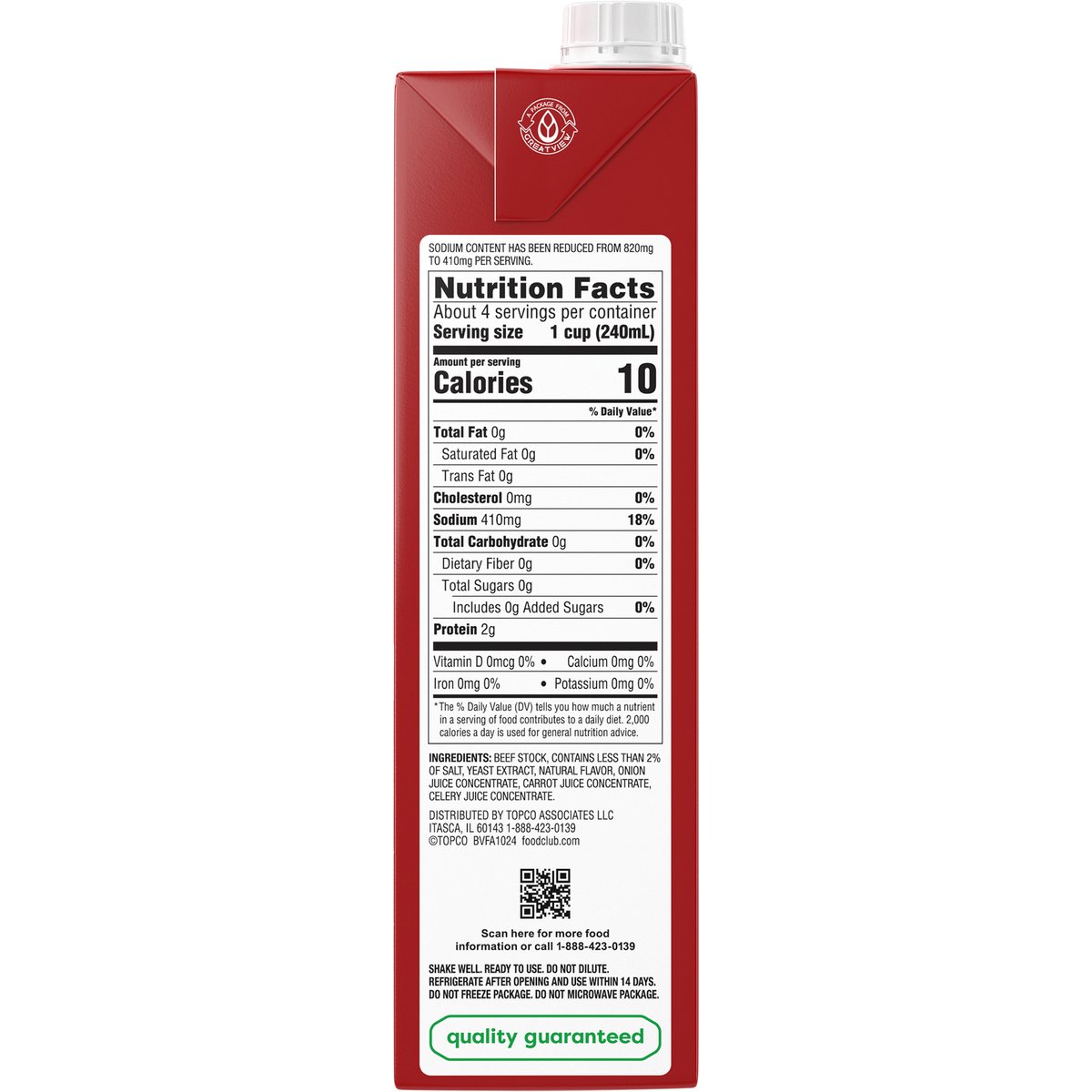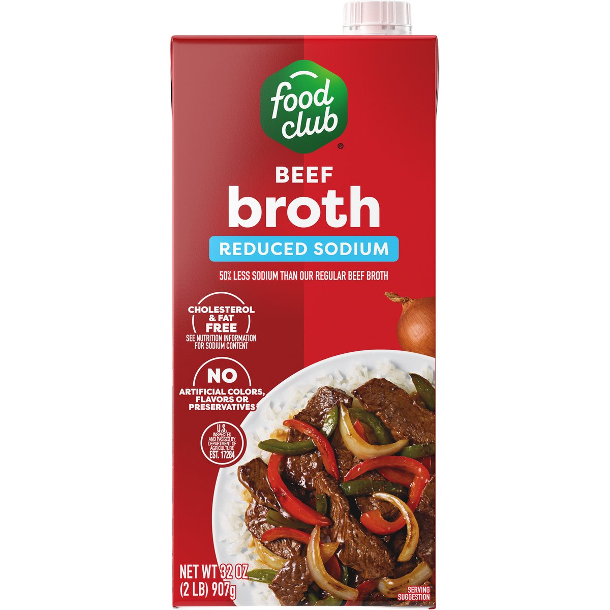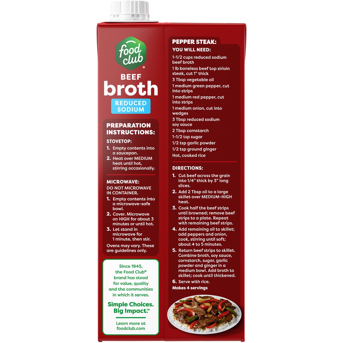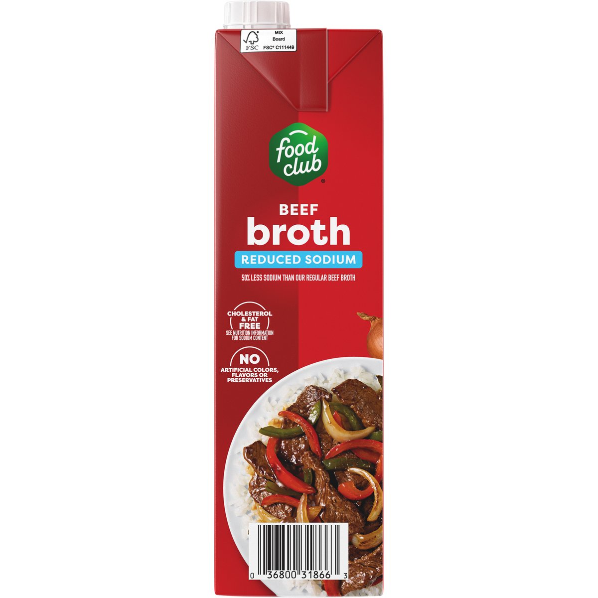 No artificial colors, flavors or preservatives. Reduced sodium. 50% less sodium than our regular beef broth. Cholesterol & fat free. See nutrition information for sodium content. Sodium content has been reduced from 830 mg to 410 mg per serving. Since 1945, the Food Club brand has stood for value, quality and the communities in which it serves. Simple Choices. Big Impact. Ready to use. Quality guaranteed. U.S. inspected and passed by Department of Agriculture. foodclub.com. Scan for more food information or call 1-888-423-0139. Learn more at foodclub.com. 1-888-423-0139. A package from Greatview. FSC: Mix - Board.