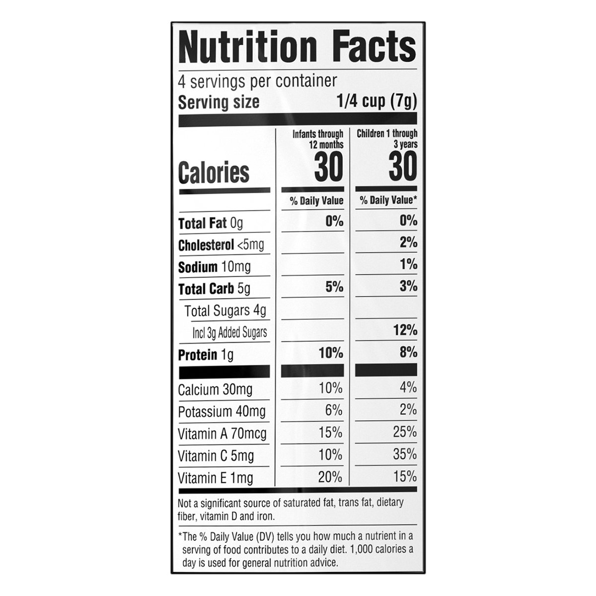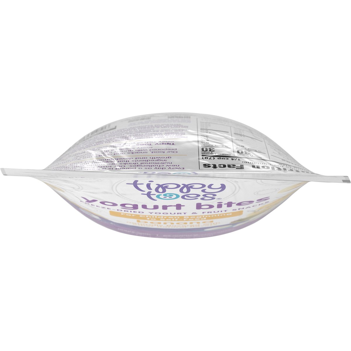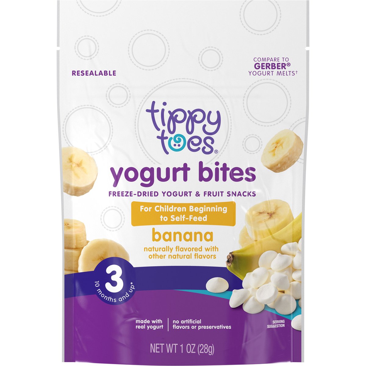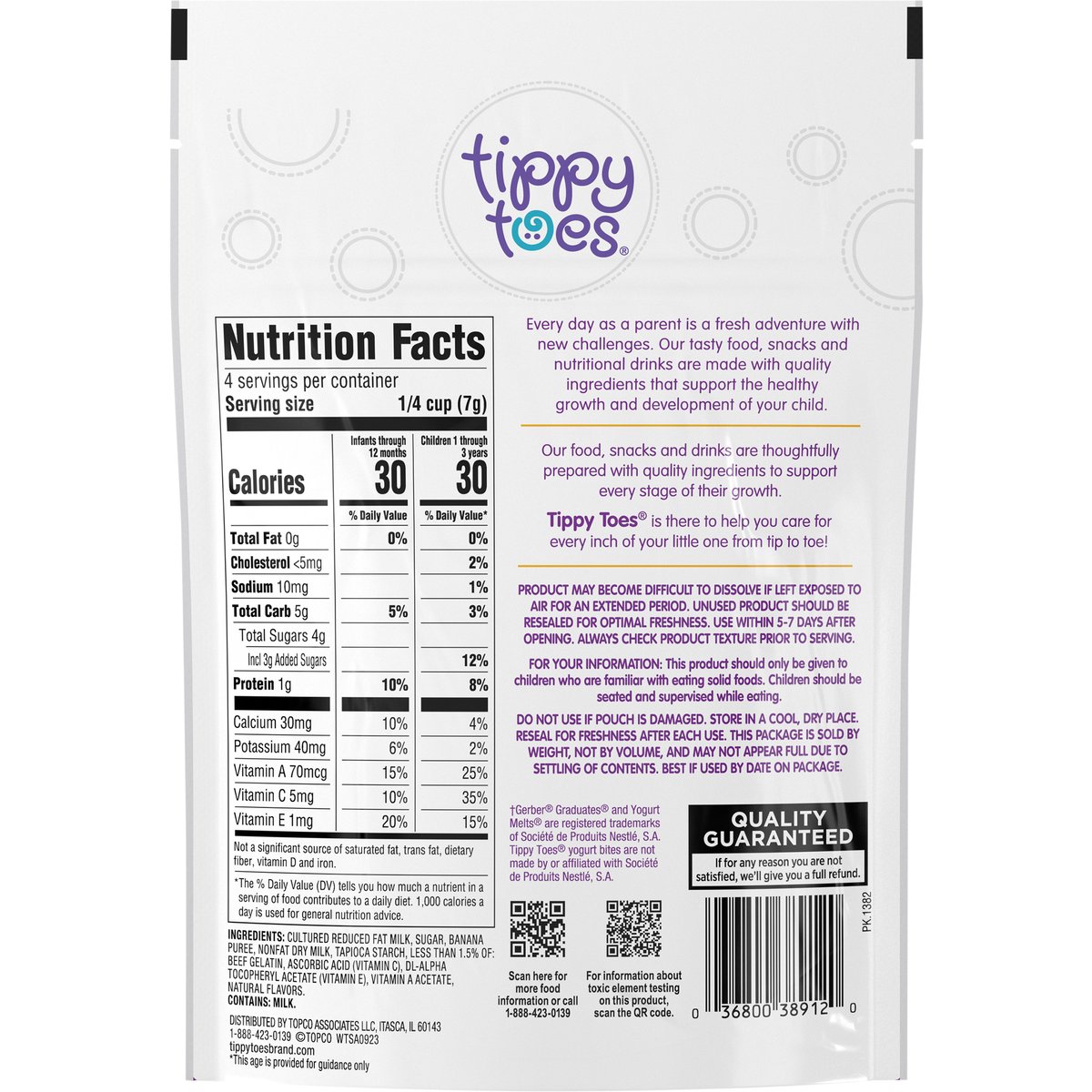 10 months and up*. *This age is provided for guidance only. Freeze-dried yogurt & fruit snacks. Naturally flavored with other natural flavors. No artificial flavors or preservatives. Compare to Gerber yogurt melts(a). For children beginning to self-feed. Every day as a parent is a fresh adventure with new challenges. Our tasty food, snacks and nutritional drinks are made with quality ingredients that support the healthy growth and development of your child. Our food, snacks and drinks are thoughtfully prepared with quality ingredients to support every stage of their growth. Tippy Toes is there to help you care for every inch of your little one from tip to toe! This package is sold by weight, not by volume, and may not appear full due to settling of contents. (a) Gerber Graduates and Yogurt Melts are registered trademarks of Societe de Produits Nestle, S.A. Tippy Toes yogurt bites are not made by or affiliated with Societe de Produits Nestle, S.A. Quality Guaranteed: If for any reason you are not satisfied, we'll give you a full refund. tippytoesbrand.com. Scan for more food information or call 1-888-423-0139. For information about toxic element testing on this product, scan the QR code. 1-888-423-0139. Resealable.
