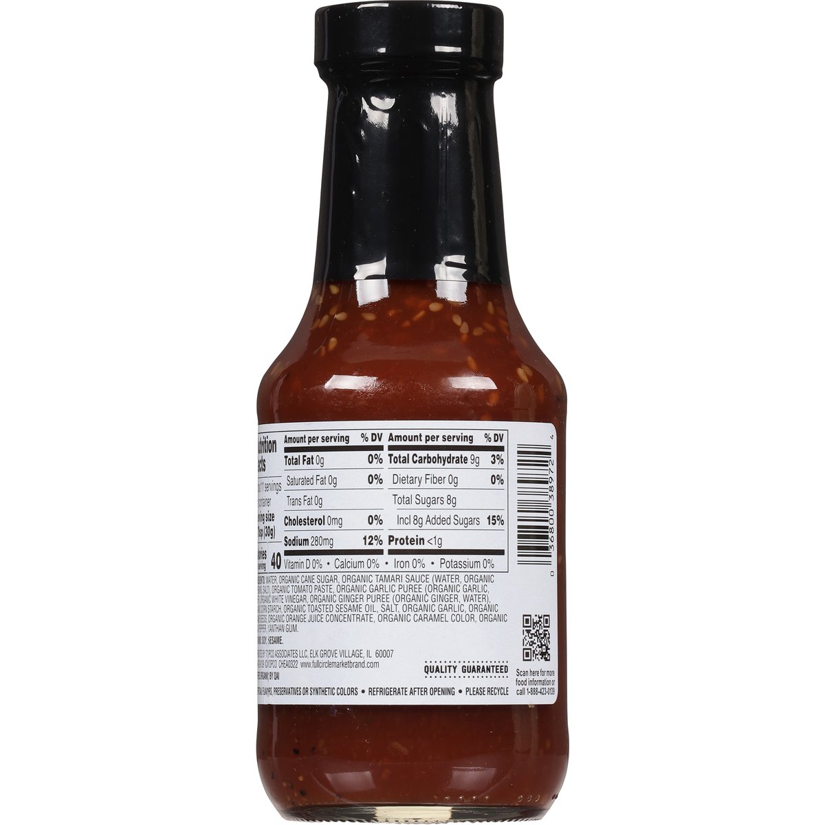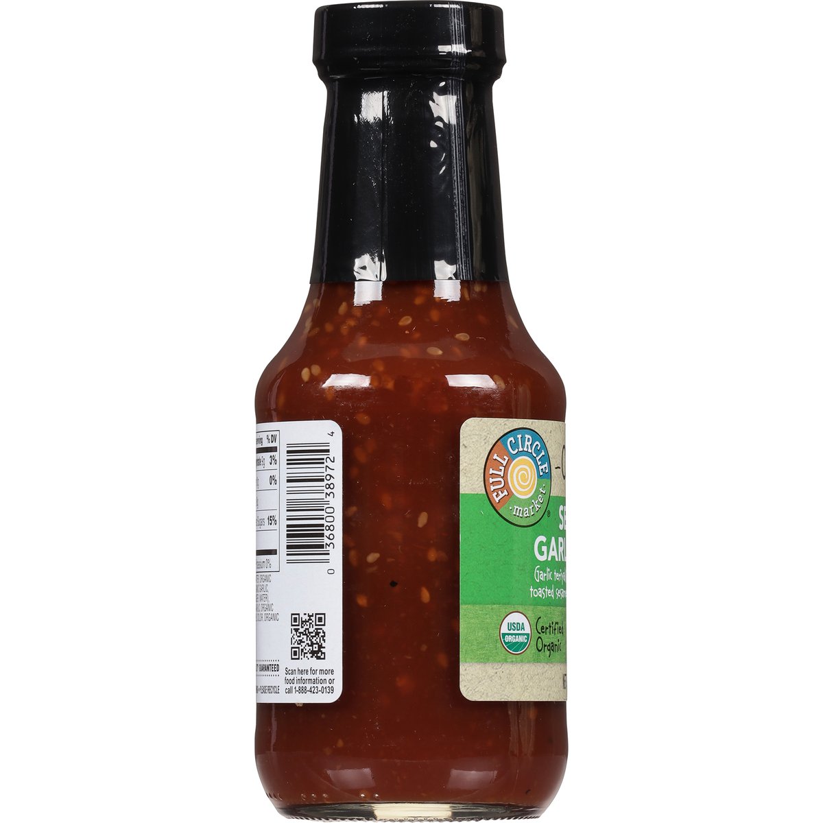 Garlic teriyaki sauce with sesame seeds, toasted sesame oil and a touch of orange. No artificial flavors, preservatives or synthetic colors. USDA Organic. Certified Organic. Gluten free. Certified Organic by QAI. Non GMO. Quality guaranteed. www.fullcirclemarketbrand.com. Scan for more food information or call 1-888-423-0139. 1-888-423-0139. Please recycle.
