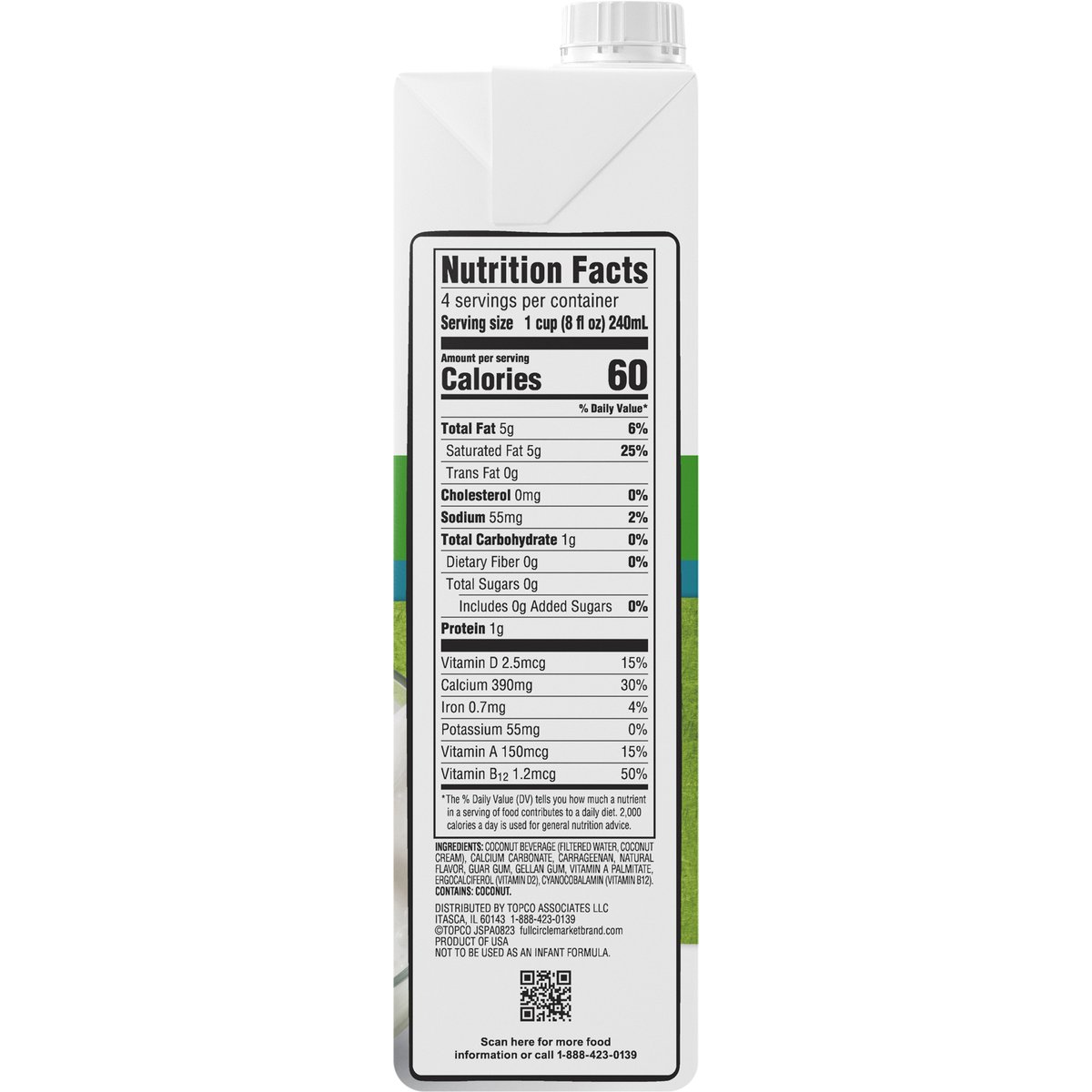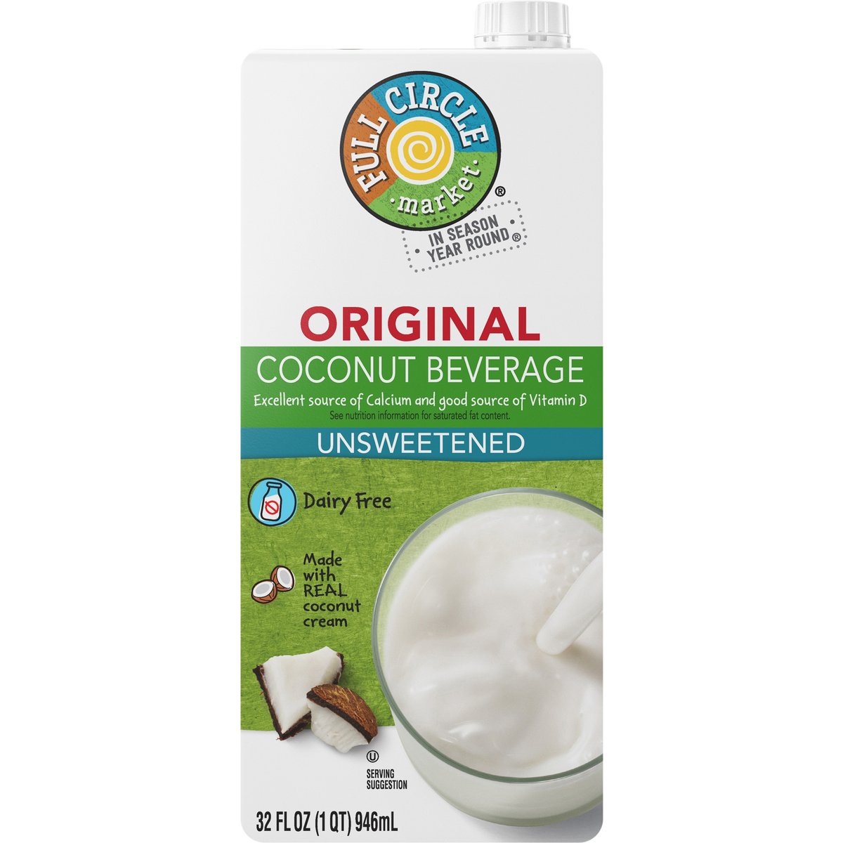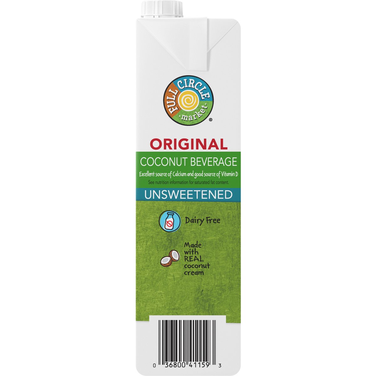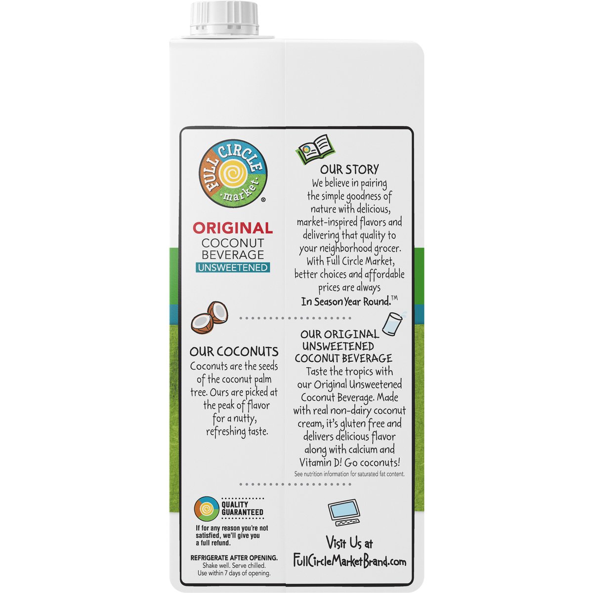 Dairy free. Excellent source of calcium and good source of vitamin D. See nutrition information for saturated fat content. Our Coconuts: Coconuts are the seeds of the coconut palm tree. Ours are picked at the peak of flavor for a nutty, refreshing taste. Our Story: We believe in pairing the simple goodness of nature with delicious, market-inspired flavors and delivering that quality to your neighborhood grocer. With Full Circle Market, better choices and affordable prices are always In Season Year Round. Our Original Unsweetened Coconut Beverage: Taste the tropics with our Original Unsweetened Coconut Beverage. Made with real non-dairy coconut cream, it's gluten free and delivers delicious flavor along with calcium and Vitamin D! Go coconuts! Quality Guaranteed: If for any reason you're not satisfied, we'll give you a full refund. fullcirclemarketbrand.com. Scan for more food information or call 1-888-423-0139. Visit us at FullCircleMarketBrand.com. 1-888-423-0139. Product of USA.