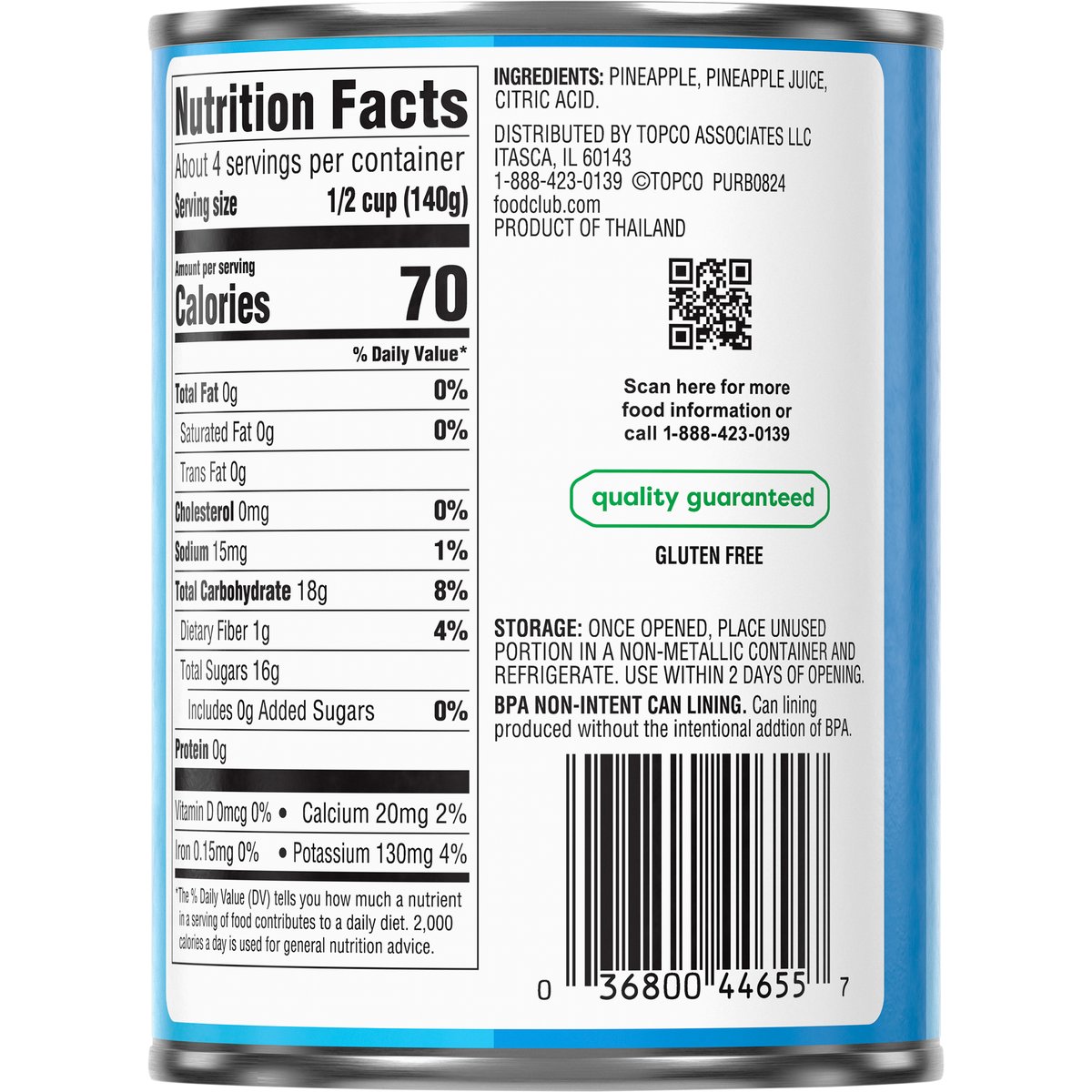 No artificial colors or flavors. Gluten free. Quality guaranteed. foodclub.com. Scan for more food information or call 1-888-423-0139. 1-888-423-0139. BPA non-intent can lining. Can lining produced without the intentional addition of BPA. Product of Thailand.