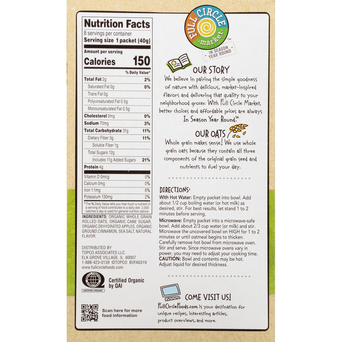 Organic whole grain oats, apples and a touch of cinnamon starts the day right! Naturally flavored with other natural flavors. USDA Organic: Certified organic. 100% Whole Grain: 26 g or more per serving. WholeGrainsCouncil.org. Certified Organic by QAI. Good source of fiber. In season year round. 8 packets. Our Story: We believe in pairing the simple goodness of nature with delicious, market-inspired flavors and delivering that quality to your neighborhood grocer. With Full Circle Market, better choices and affordable prices are always in season year round. Our Oats: Whole grain makes sense! We use whole grain oats because they contain all three components of the original grain seed and nutrients to fuel your day. Quality Guaranteed: If for any reason you're not satisfied, we'll give you a full refund. www.fullcirclefoods.com. Scan for more food information. Come visit us! FullCircleFoods.com is your destination for unique recipes, interesting articles, product overviews, and more. 70% virgin material. 30% post-consumer waste.