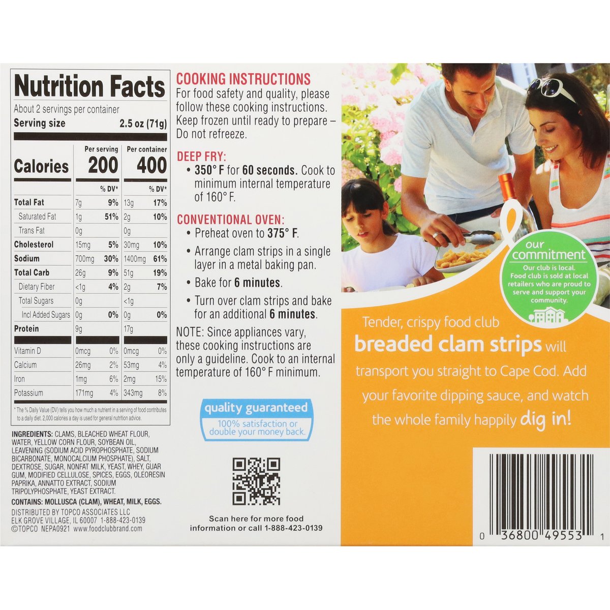 No artificial flavors or preservatives. Add flavor to life. Since 1945. Tender, crispy Food Club Breaded Clam Strips will transport you straight to cape cod. Add your favorite dipping sauce, and watch the whole family happily dig in! Quality Guaranteed: 100% satisfaction or double your money back. www.foodclubbrand.com. Scan for more food information or call 1-888-423-0139. 1-888-423-0139.