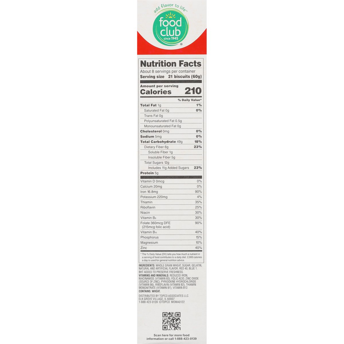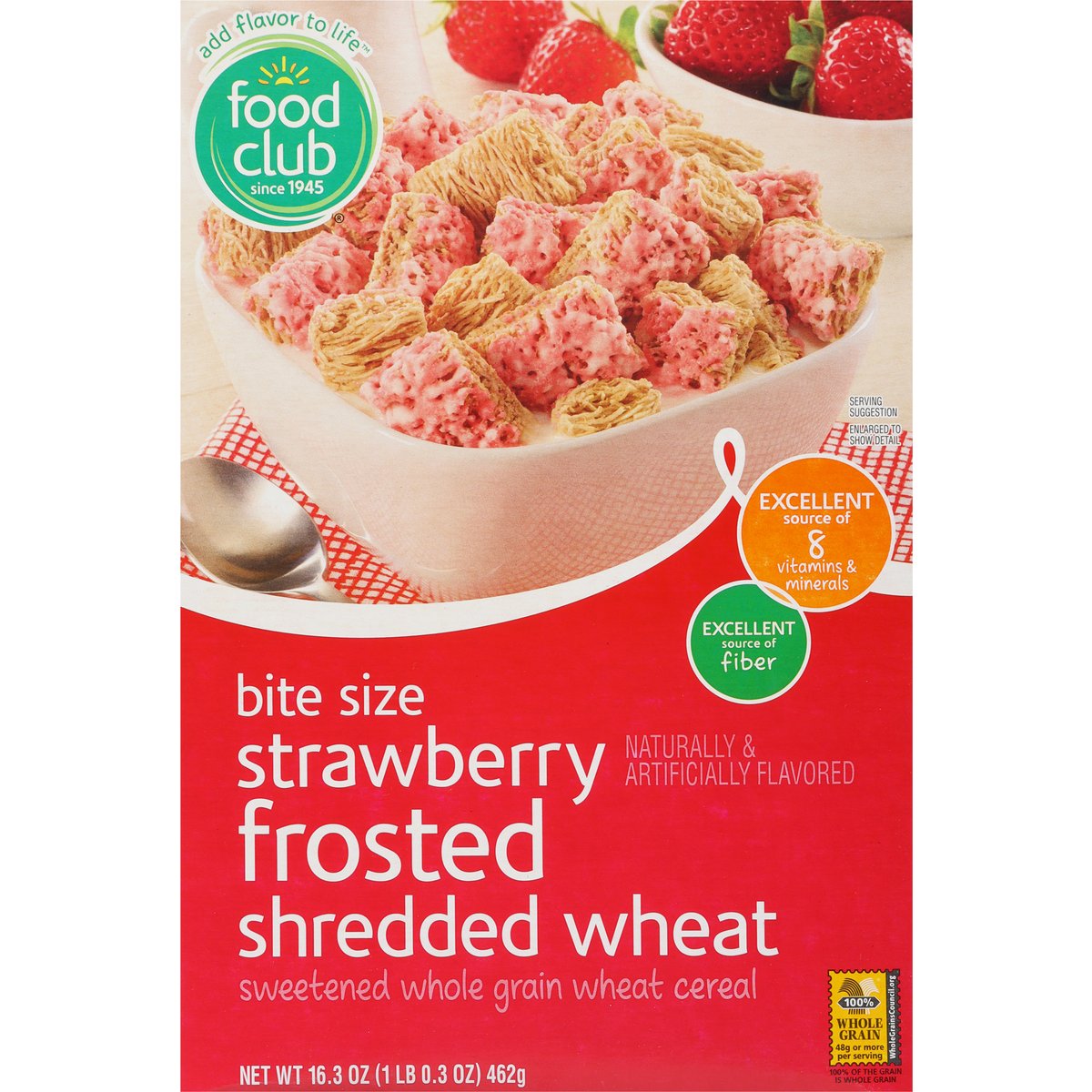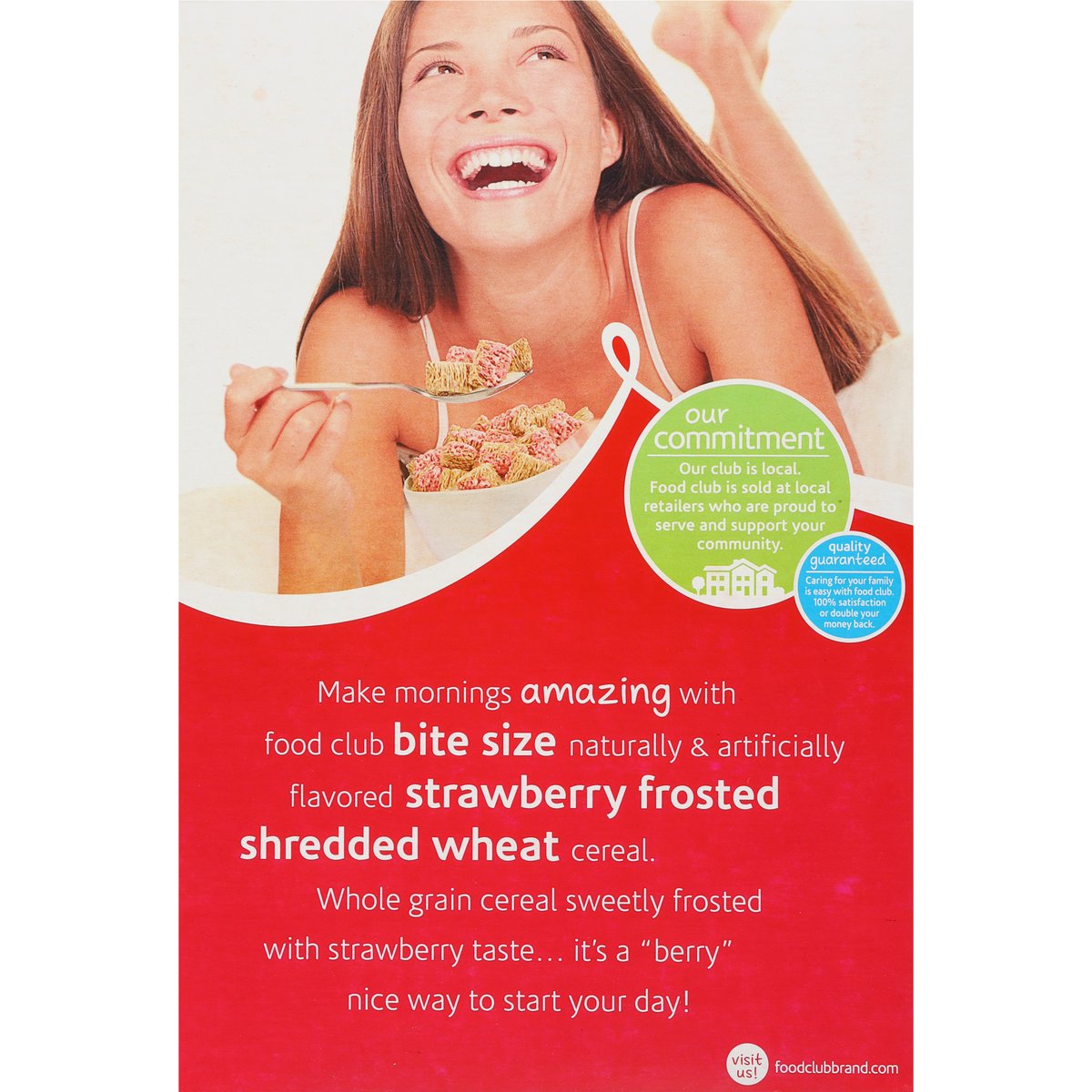 Sweetened whole grain wheat cereal. Naturally & artificially flavored. 100% Whole Grain: 48 g or more per serving. 100% of the grain is whole grain. WholeGrainsCouncil.org. Excellent source of 8 vitamins & minerals. Excellent source of fiber. Add flavor to life. Since 1945. Make mornings amazing with Food Club bite size naturally & artificially flavored strawberry frosted shredded wheat cereal. Whole grain cereal sweetly frosted with strawberry taste - it's a berry nice way to start your day! Our Commitment: Our club is local. Food Club is sold at local retailers who are proud to serve and support your community. Quality Guaranteed: Caring for your family is easy with Food Club. 100% satisfaction or double your money back. foodclubbrand.com. Scan for more food information or call 1-888-423-0139. Visit us! foodclubbrand.com. Please recycle outer container.