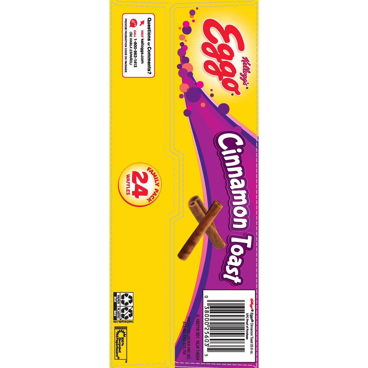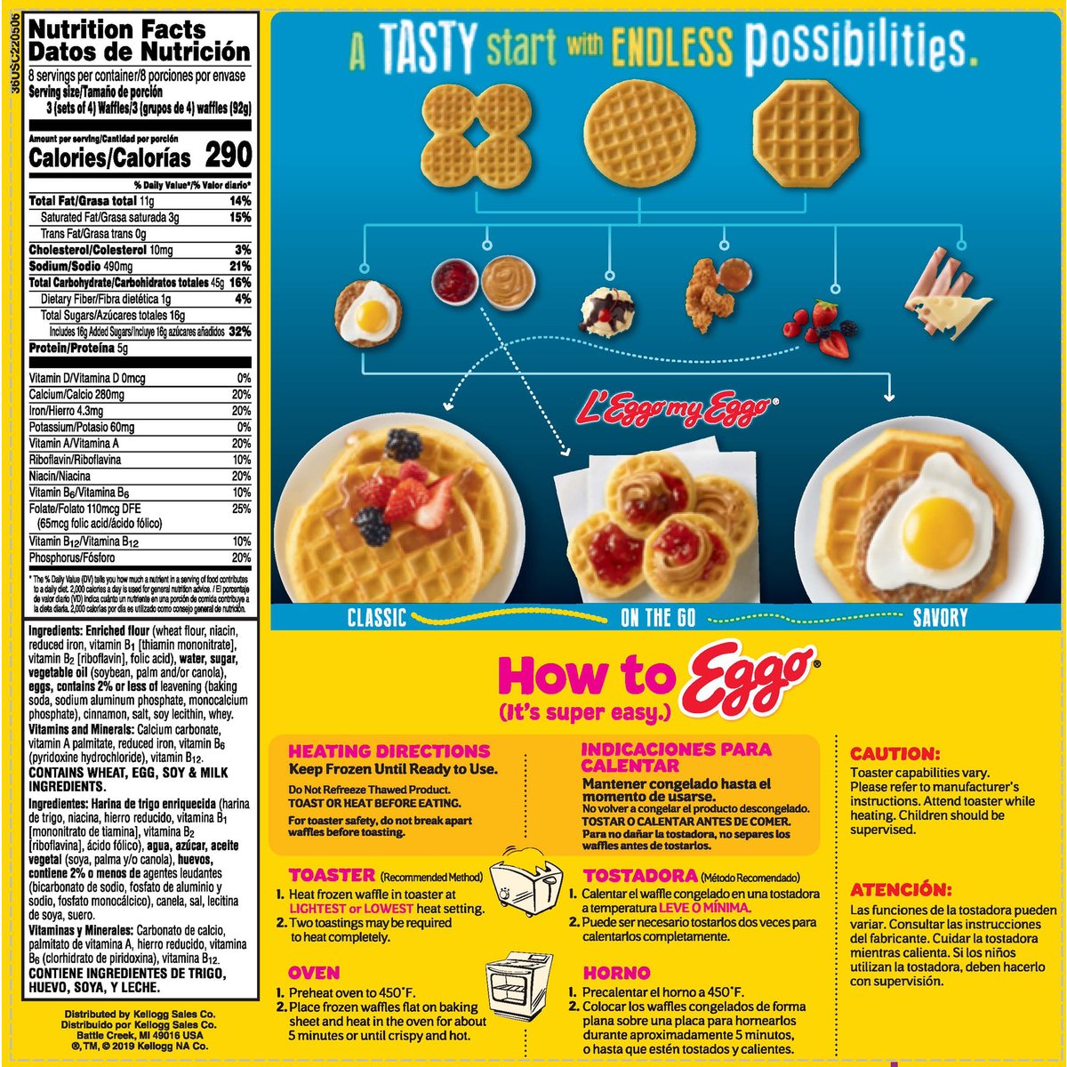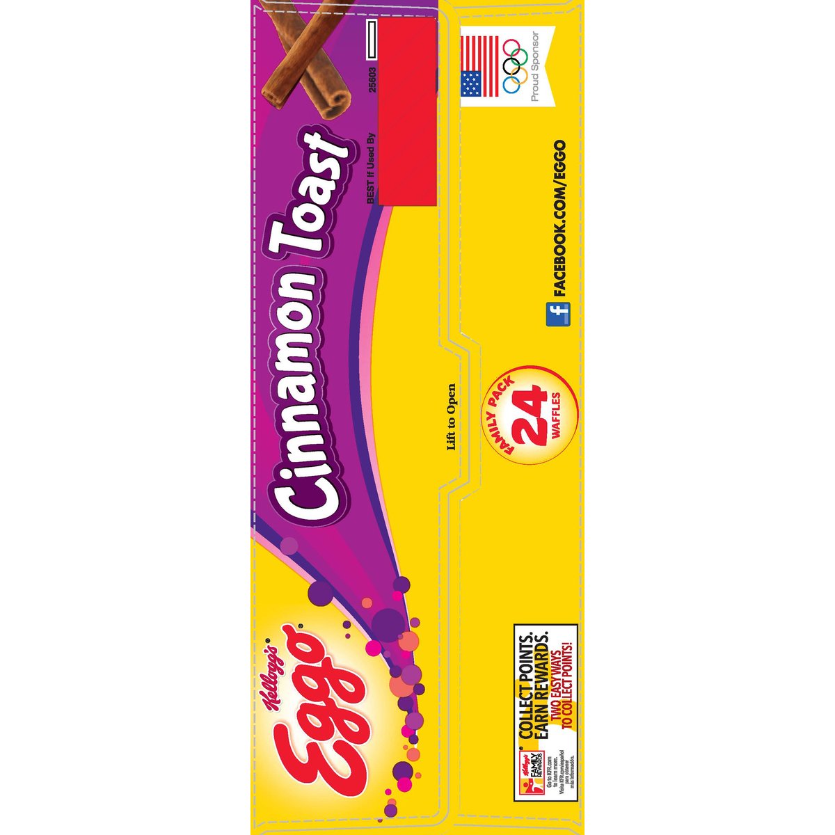 24 sets of 4 waffles. 10 vitamin & minerals. Excellent source of calcium. Please recycle. kelloggs.com/ourfuture. 100% recycled paperboard. Kellogg's Family Rewards. KelloggsFamilyRewards.com. USA Proud Sponsor. Warming label! Your child may wake you up for breakfast. L'Eggo my Eggo. Facebook.com/Eggo. Visit: kelloggs.com.