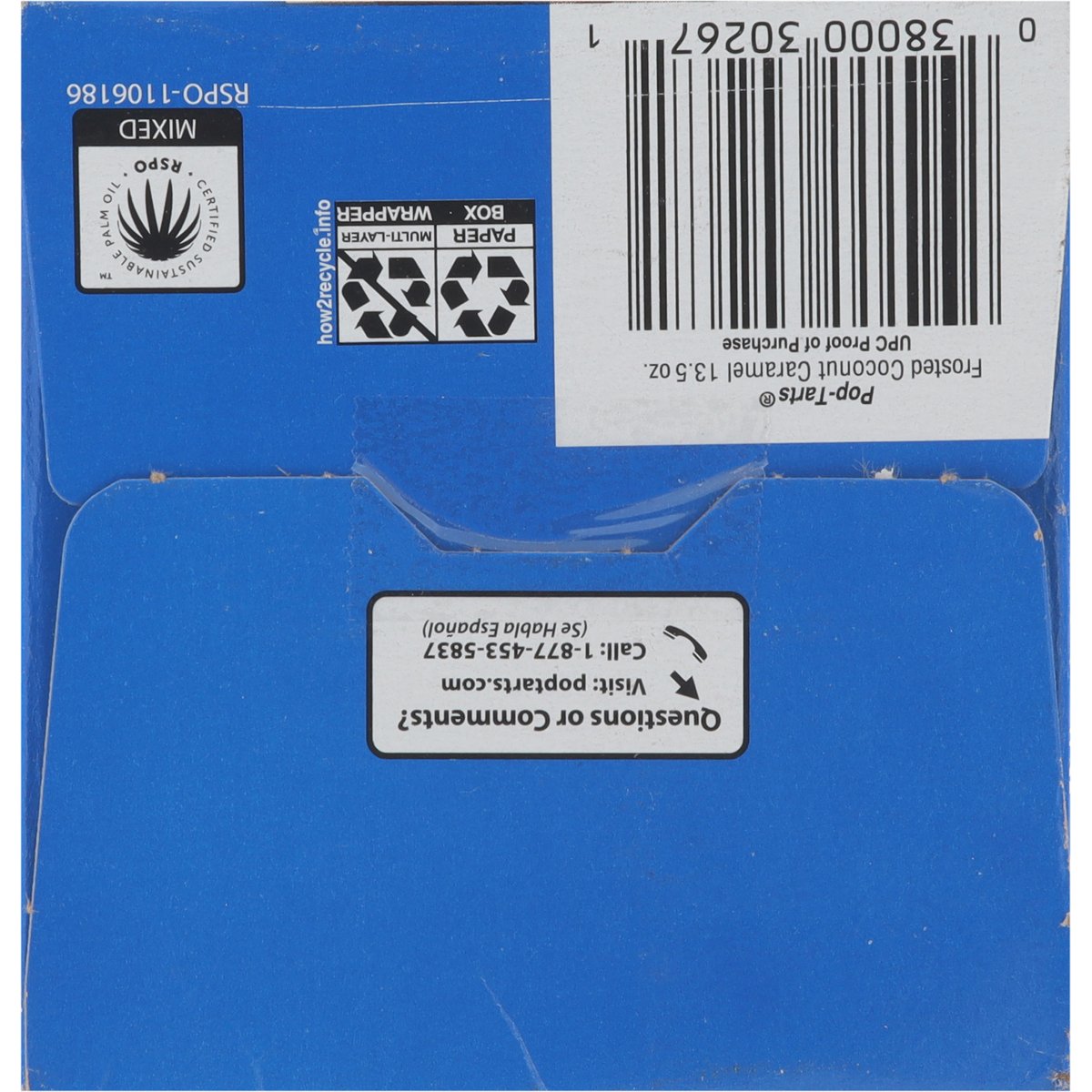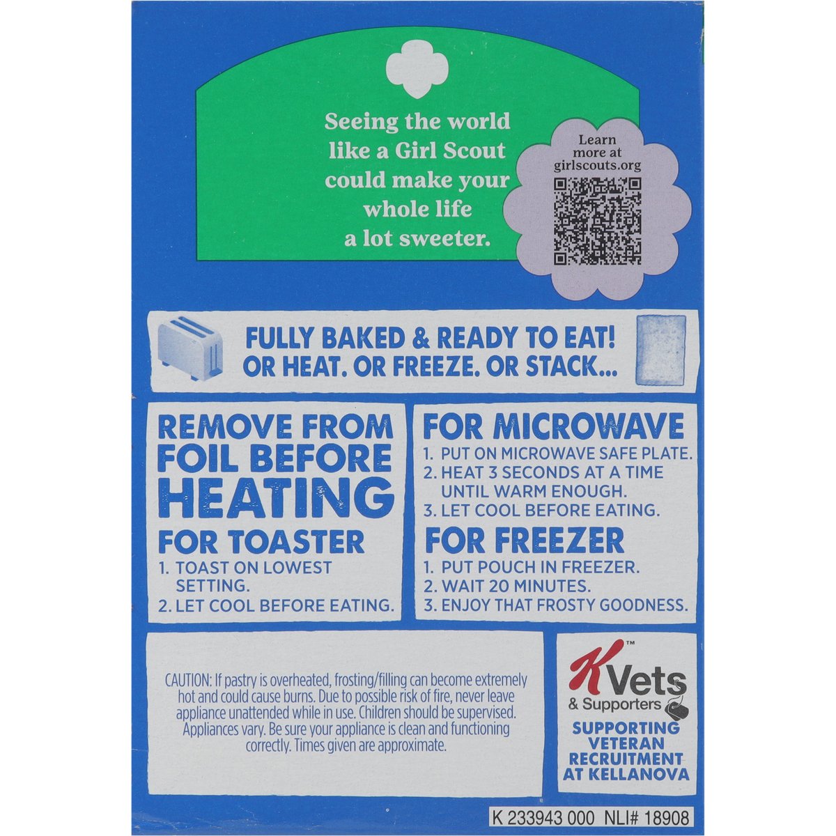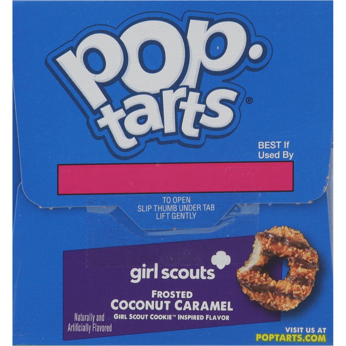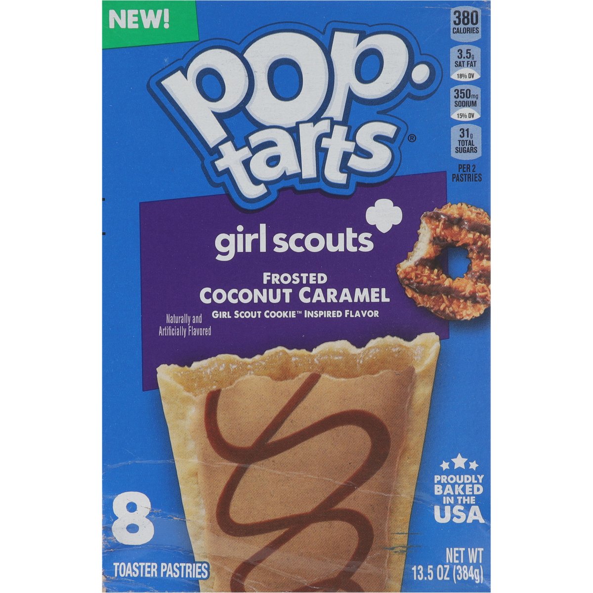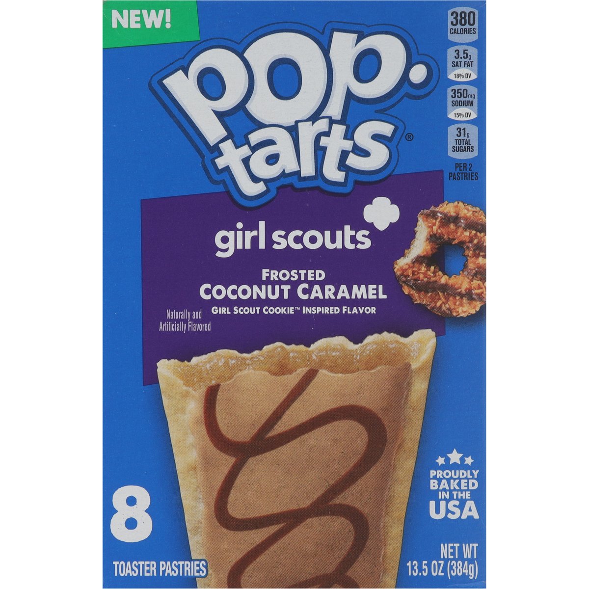 Naturally and artificially flavored. Per 2 Pastries: 380 calories; 3.5 g sat fat (18% DV); 350 mg sodium (15% DV); 31 g total sugars. Good source of 3 B Vitamins. Contains a bioengineered food ingredient. New! Fully baked & ready to eat! Or heat. Or freeze. Or stack. poptarts.com. how2recycle.info. Seeing the world like a Girl Scout could make your whole life a lot sweeter. Learn more at girlscouts.org. Questions or comments? visit: poptarts.com Call: 1-877-453-5837. KVets & Supporters: Supporting veteran recruitment at Kellanova. RSPO: Certified sustainable palm oil - Mixed. Proudly baked in the USA.