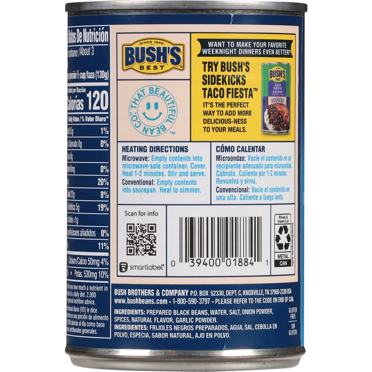 Gluten free. Good source of protein. Good source of fiber. Since 1908. That Beautiful Bean Co. Highest quality beans. www.bushbeans.com. how2recycle.info. SmartLabel: Scan for info. www.bushbeans.com. 1-800-590-3797. Want to make your favorite weeknight dinners even better? Try Bush's Sidekicks Taco Fiesta. It's the perfect way to add more delicious-ness to your meals. Grown in the USA.