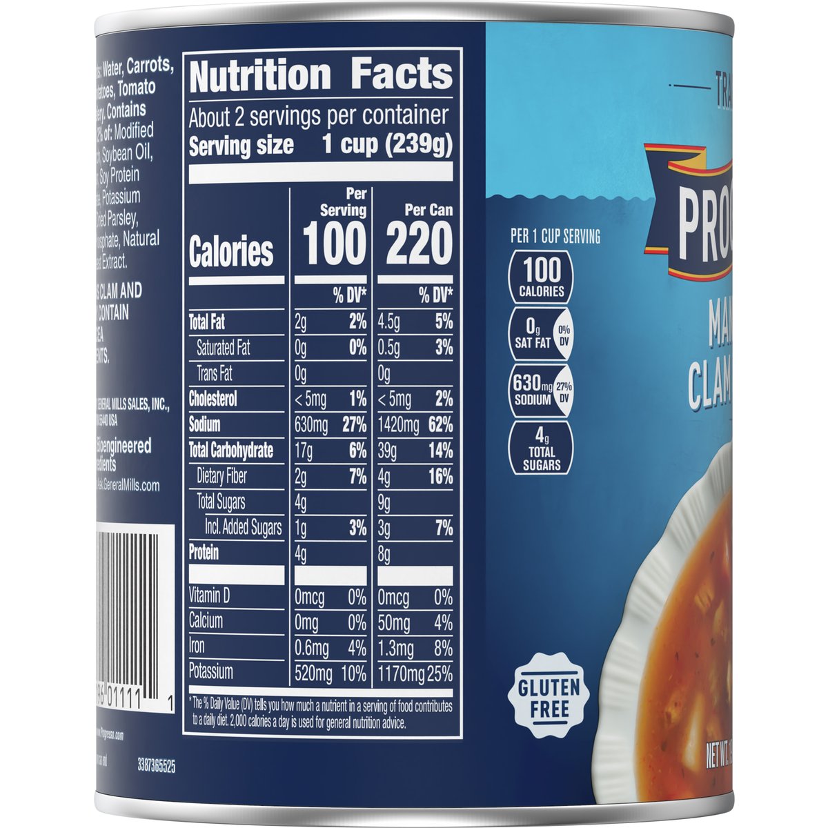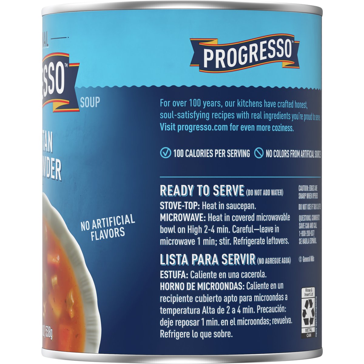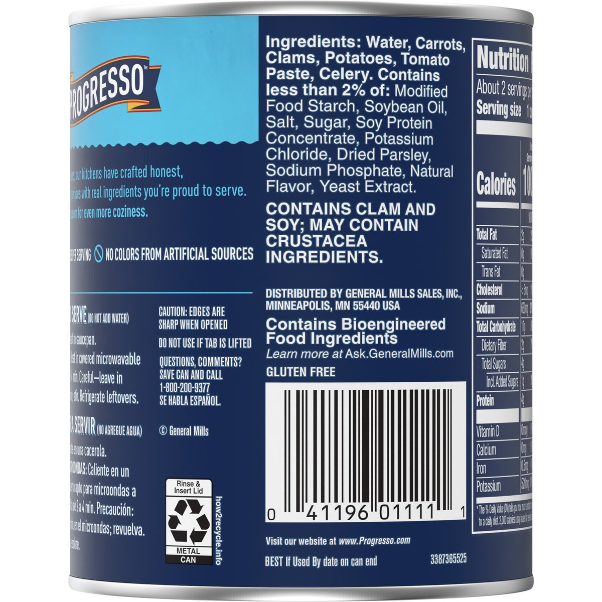 No artificial flavors. Per 1 Cup Serving: 100 calories; 0 g sat fat (0% DV); 630 mg sodium (27 DV); 4 g total sugars. 100 calories per serving. Gluten free. No colors from artificial sources. Contains bioengineered food ingredients. Learn more at Ask.GeneralMills.com. For over 100 years, our kitchens have crafted honest, soul-satisfying recipes with real ingredients you're proud to serve. www.Progresso.com. how2recycle.info. Ask.GeneralMills.com. Questions, comments? Save can and call 1-800-200-9377. Visit our website at www.Progresso.com. Visit progresso.com for even more coziness. Made in the USA.