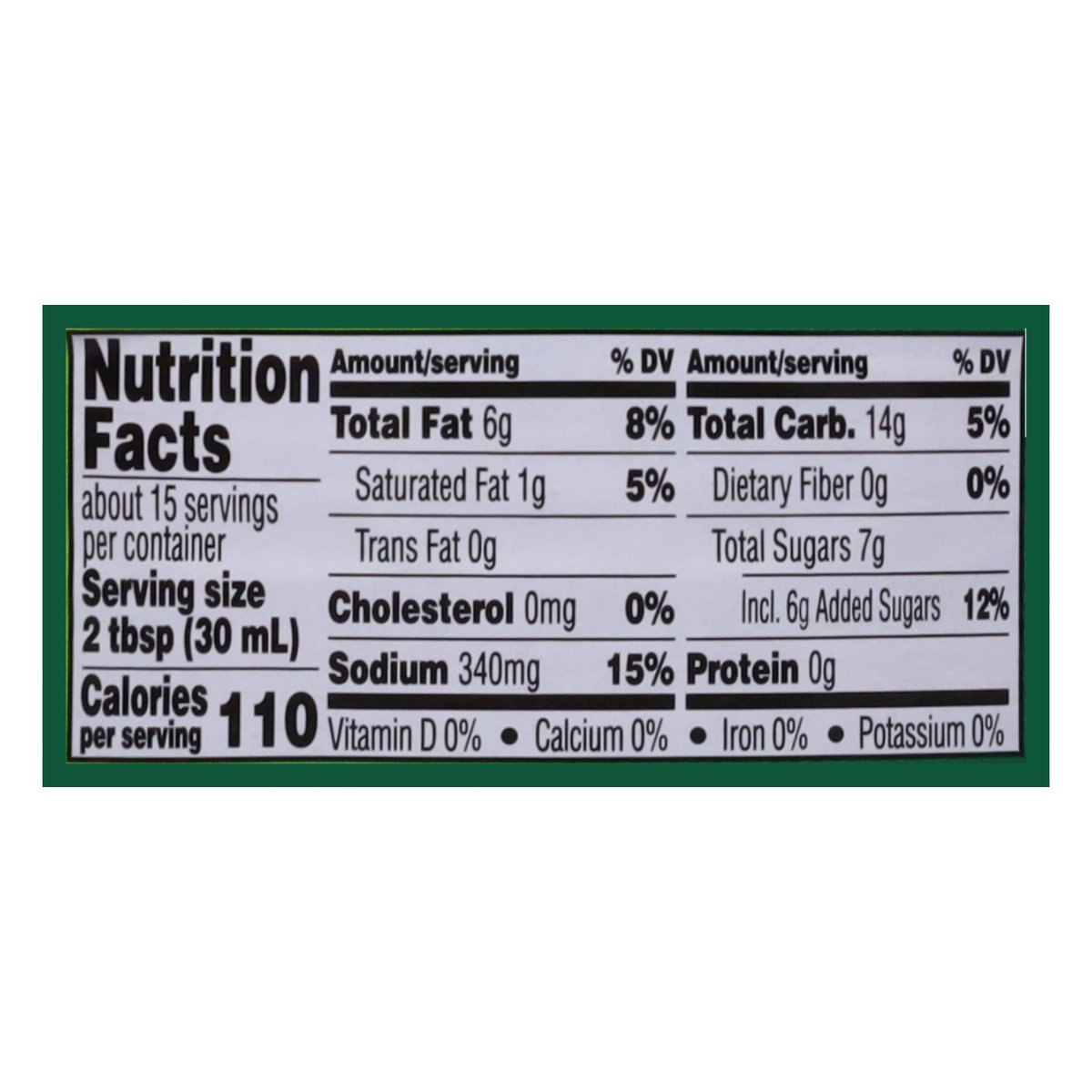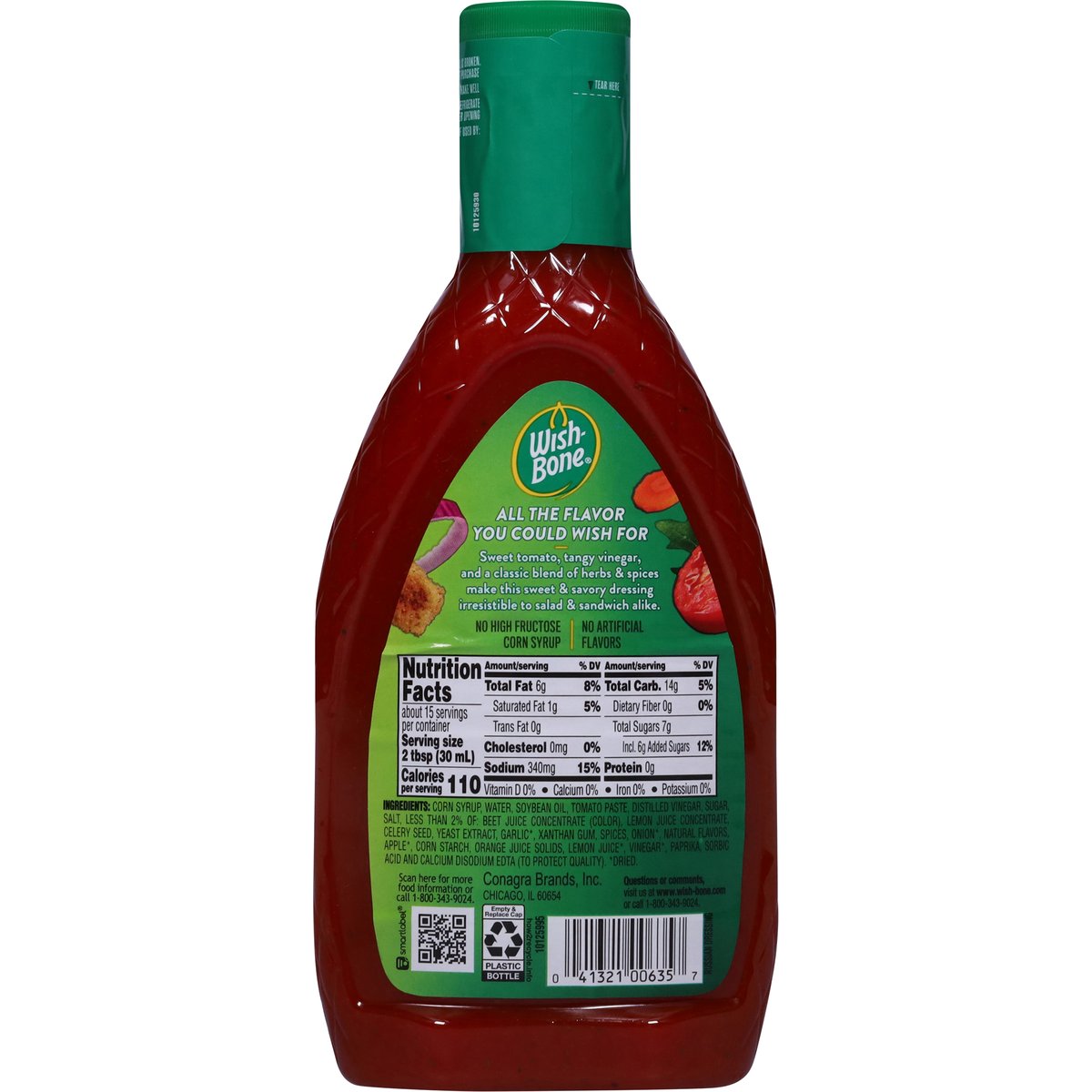 No artificial flavors. Per 2 Tbsp Serving: 110 calories; 1 g sat fat (5% DV); 340 mg sodium (15% DV); 6 g added sugars (12% DV). All the flavor you could wish for. Sweet tomato, tangy vinegar, and a classic blend of herbs & spices make his sweet & savory dressing irresistible to salad & sandwich alike. No high fructose corn syrup. how2recycle.info. www.wish-bone.com. SmartLabel: Scan for more food information or call 1-800-343-9024. Questions or comments, visit us at www.wish-bone.com or call 1-800-343-9024.