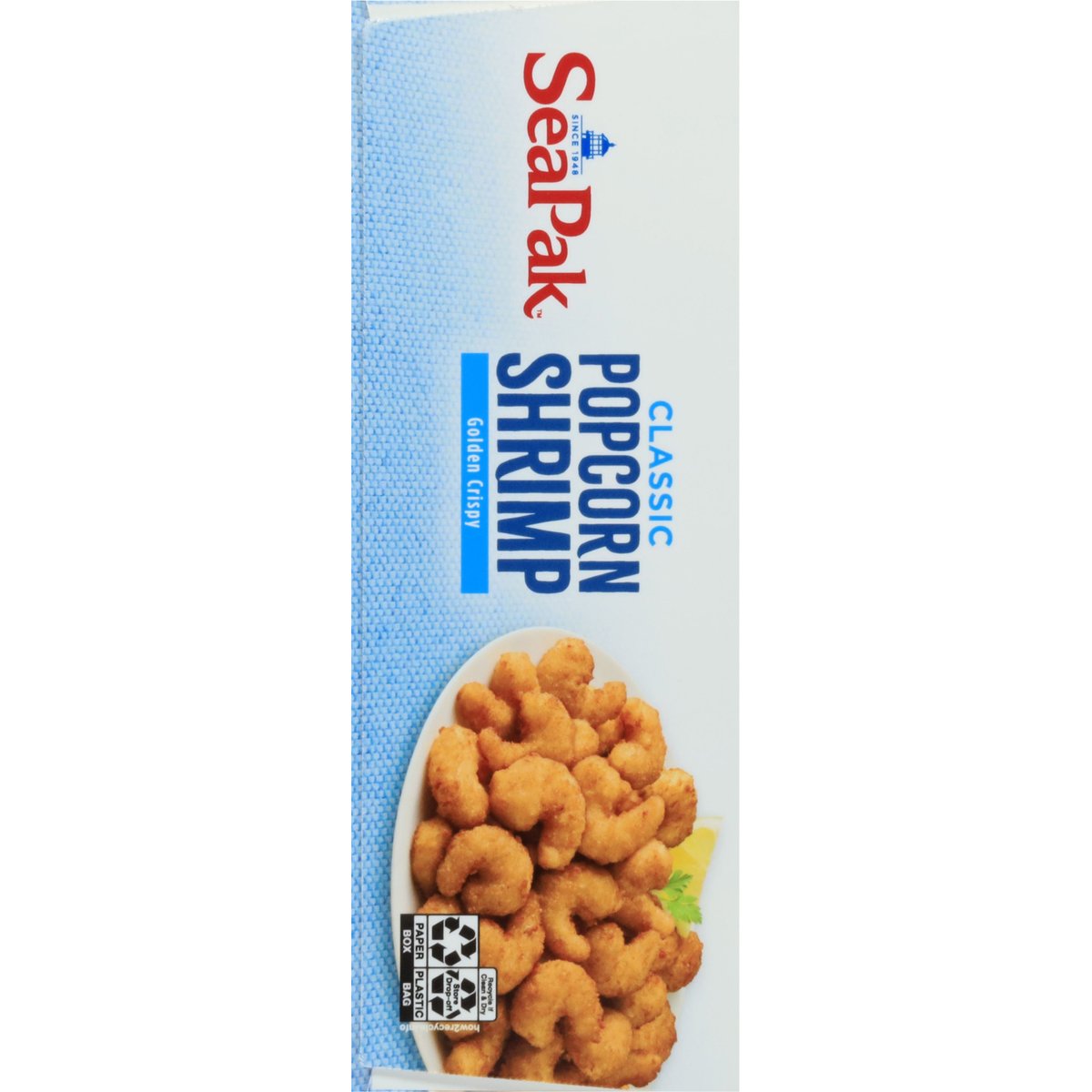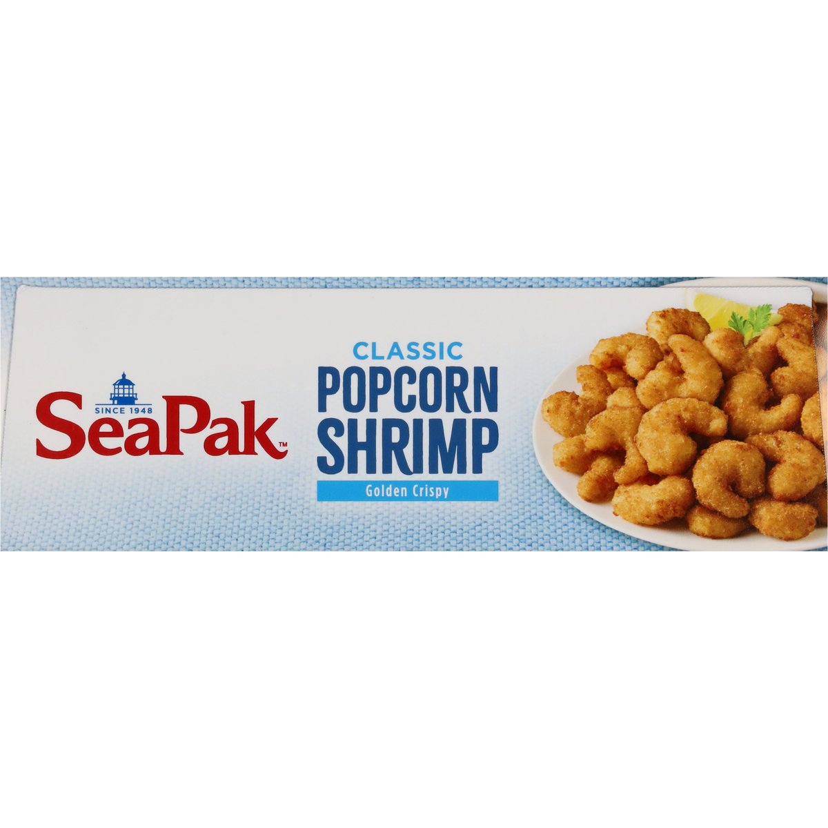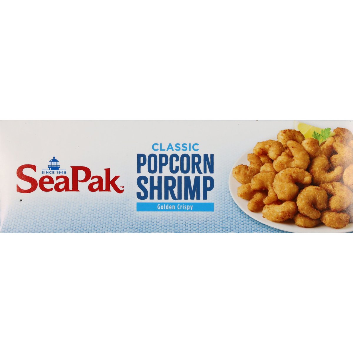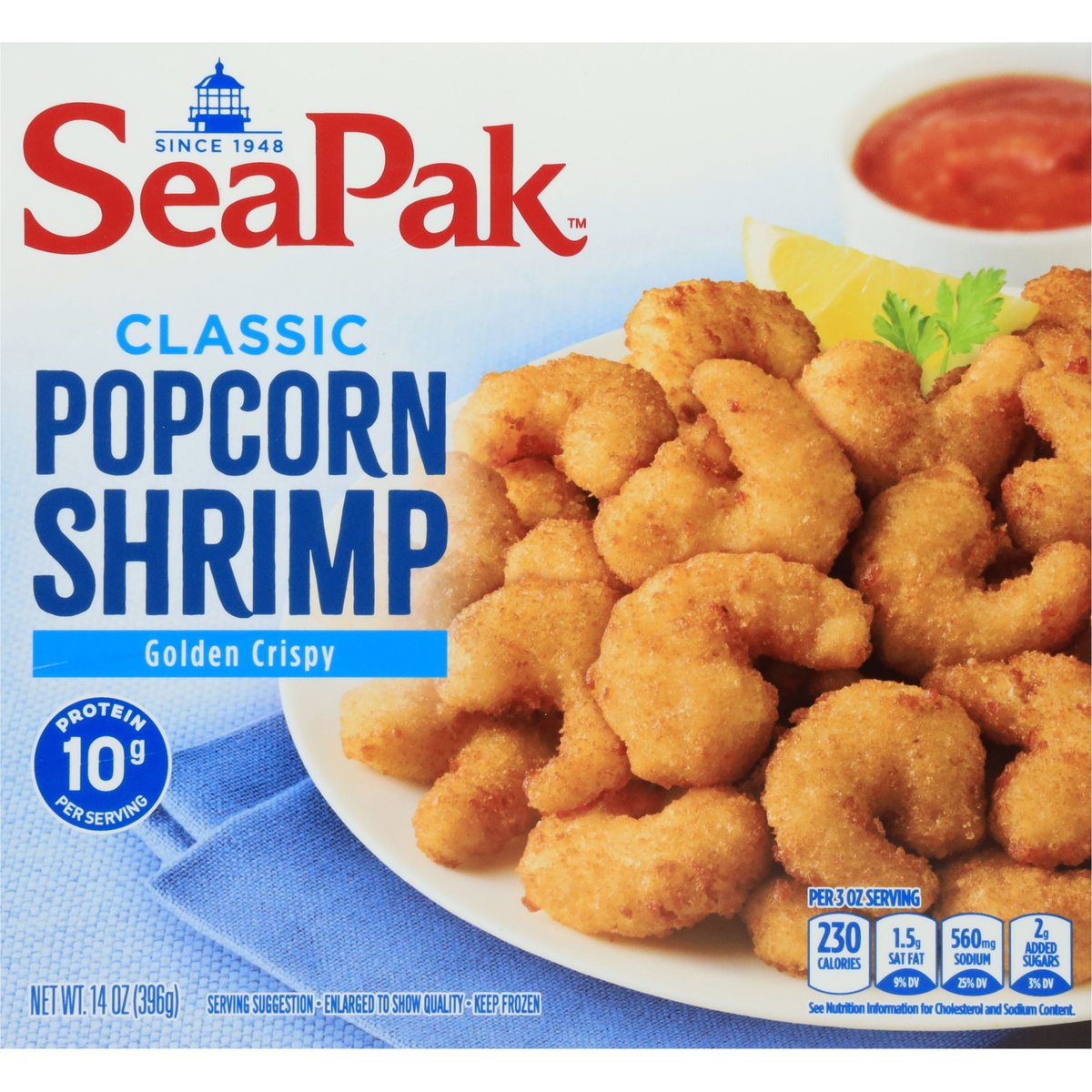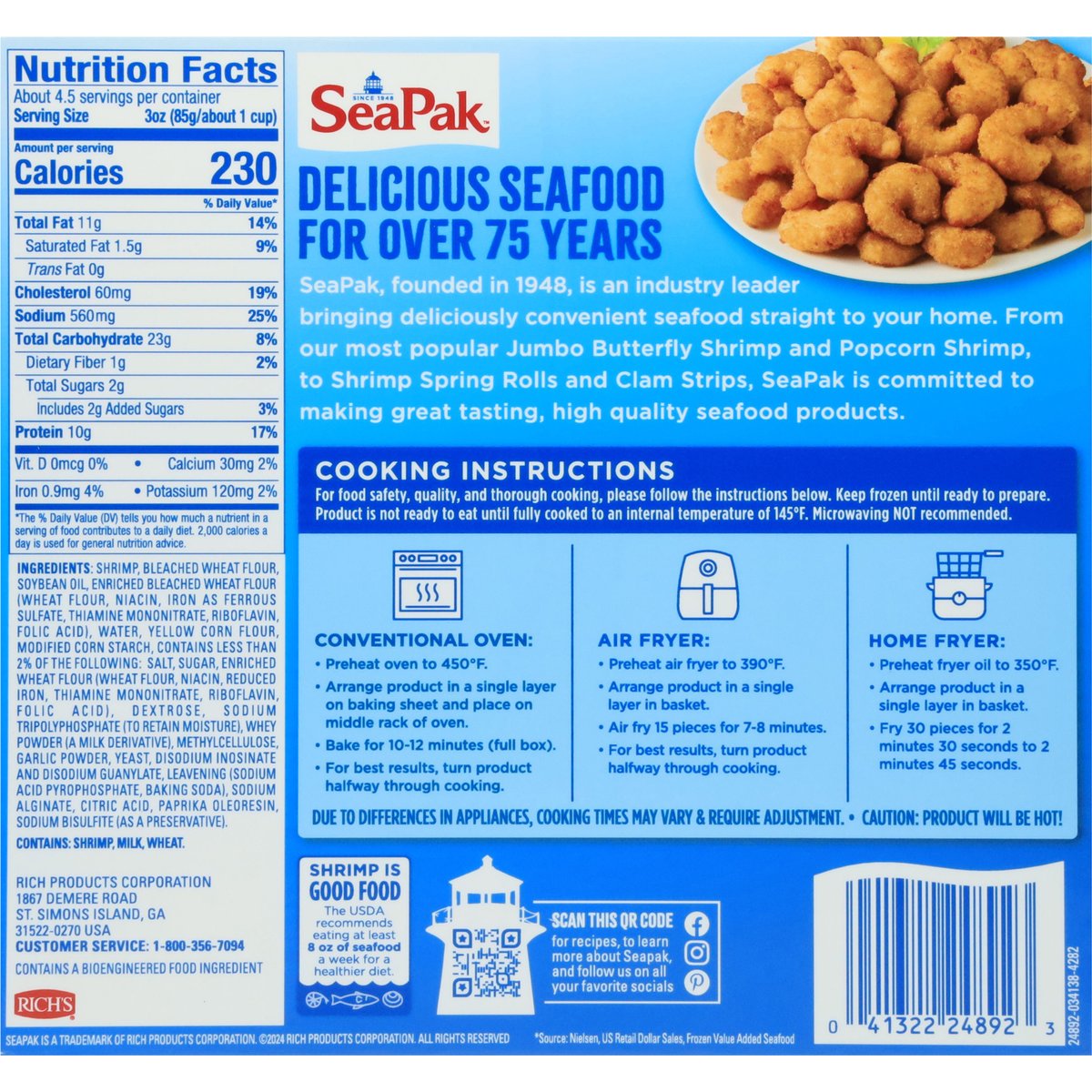 10 g protein per serving. Per 3 oz Serving: 230 calories; 1.5 g sat fat (9% DV); 560 mg sodium (25% DV); 2 g added sugars (3% DV). Shrimp is good food. The USDA recommends eating at least 8 oz of seafood a week for a healthier diet. See nutrition information for cholesterol and sodium content. Contains a bioengineered food ingredient. Since 1948. Golden crispy. Delicious seafood for over 75 years. SeaPak, founded in 1948, is an industry leader bringing deliciously convenient seafood straight to your home. From our most popular Jumbo Butterfly Shrimp and Popcorn Shrimp to Shrimp Spring Rolls and Clam Strips, SeaPak is committed to making great tasting, high quality seafood products. America's favorite* popcorn shrimp! *Source: Nielsen, US Retail Dollar Sales, frozen value added seafood. how2recycle.info. Scan this QR code for recipes, to learn more about Seapak, and follow us on all your favorite socials. Facebook. Instagram. Pinterest. Customer Service: 1-800-356-7094.