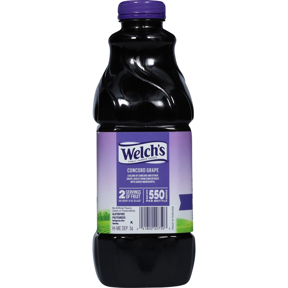 A blend of concord and other grape juices from concentrate with added ingredients. No artificial flavors, colors or preservatives. 100% DV vitamin C. Gluten free. Non GMO (Not made with genetically modified ingredients). Family farmer owned. USA grown grapes. No sugar added (Not a low calorie food. See Nutrition Facts for sugar and calorie content). Farmer owned. Family grown. Welch's is a family business, owned by more than 700 farmer families who have been farming their land for as many as 7 generations. 100% of our profits go to these small family farmers. The grapes in our juice are grown with love and sweetened by sunshine, not added sugar. And they're picked and pressed whole within 8 hours for that fresh-from-the vine flavor that can only be Welch's. It makes a difference you can taste. Because it's got to be good enough for our families to be good enough for yours - Eddie & Sophie Hamlet, 7th generation farmers - Welch’s grower owners. 2 servings of fruit in every 8 oz glass (2 servings of fruit per 8 oz glass equals 1 cup of fruit). Per Bottle: Made with 550 grapes. Pasteurized. how2recycle.info. Comments or Questions? Call 1-800-340-6870 Weekdays 9 am - 4 pm ET. Made in USA.