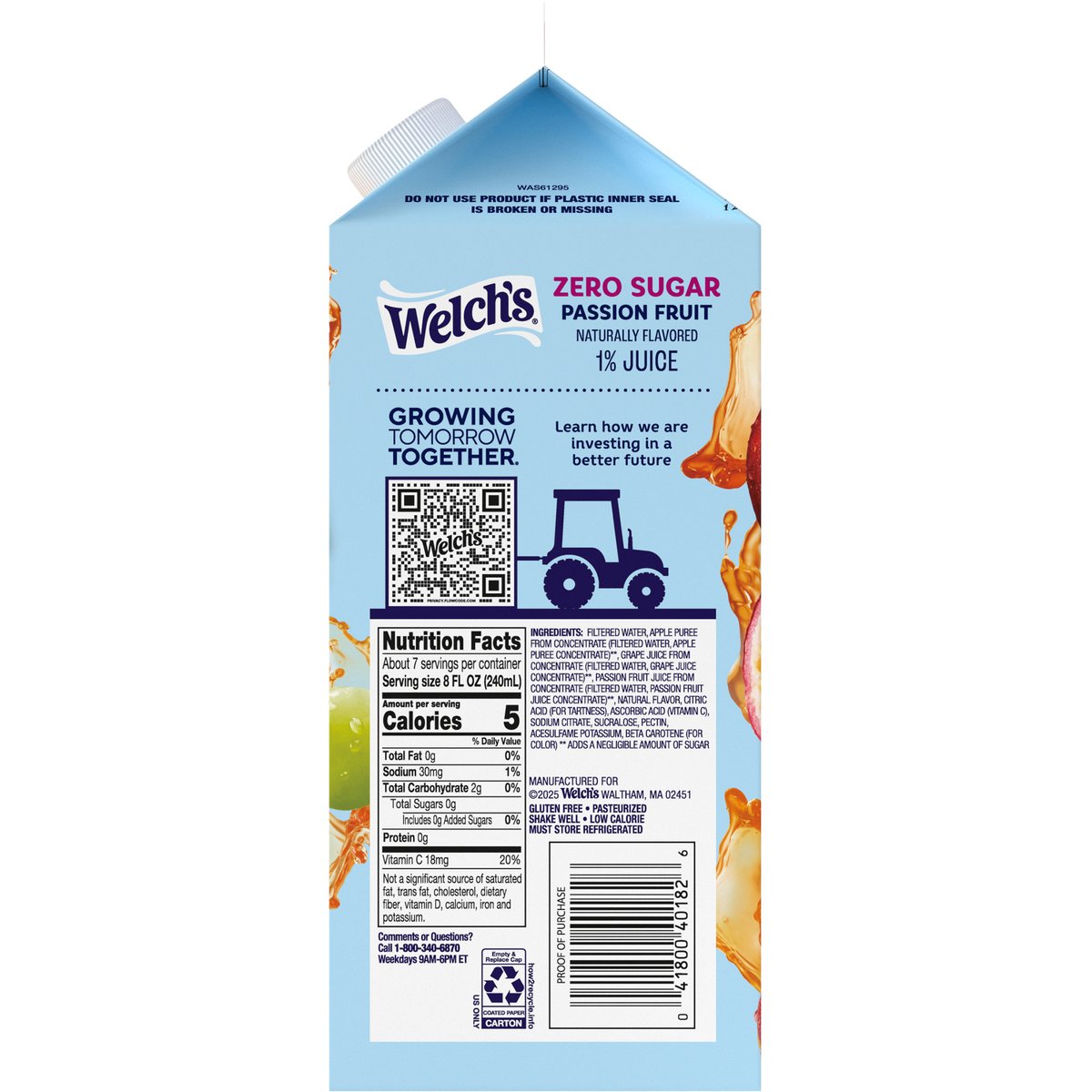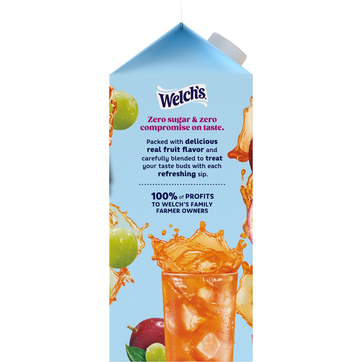 Naturally flavored. Zero sugar. Gluten free. Excellent source of vitamin C. Low calorie. Family farmer owned. Zero sugar & zero compromise on taste. Packed with delicious real fruit flavor and carefully blended to treat your taste buds with each refreshing sip. Pasteurized. how2recycle.info. Growing tomorrow together. Learn how we are investing in a better future. Comments or Questions? Call 1-800-340-6870 Weekdays 9 am - 6 pm ET. 100% of profits to Welch's family farmer owners.