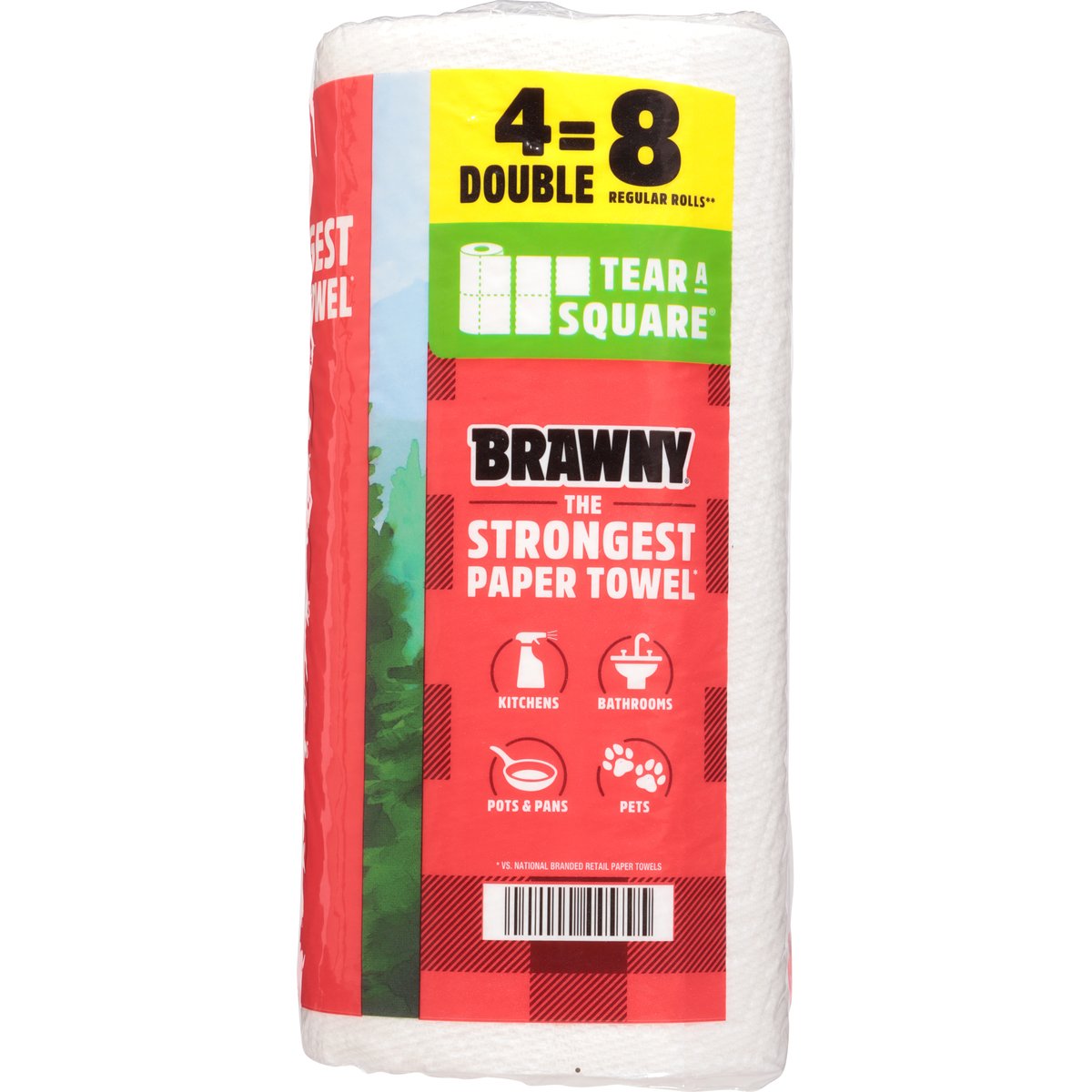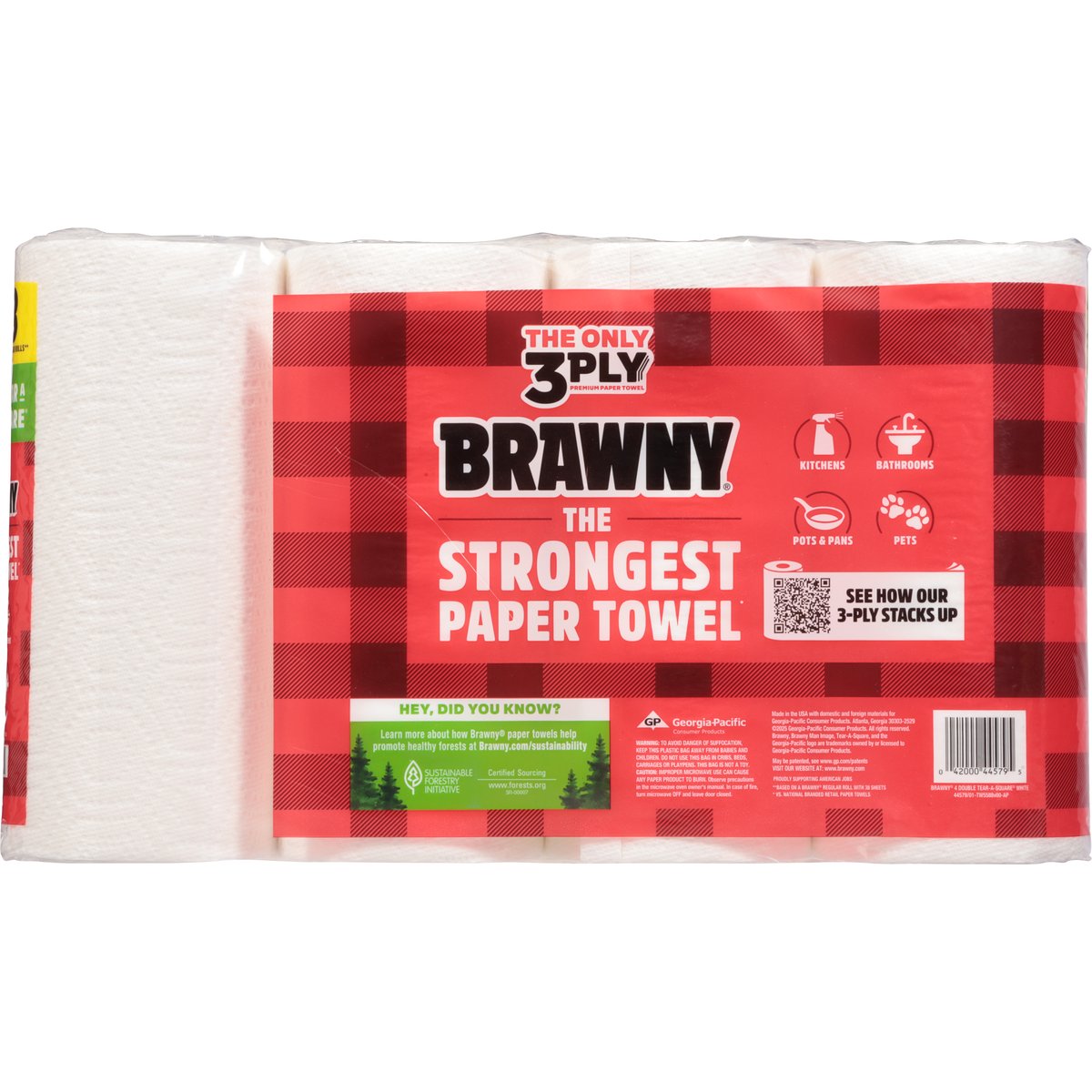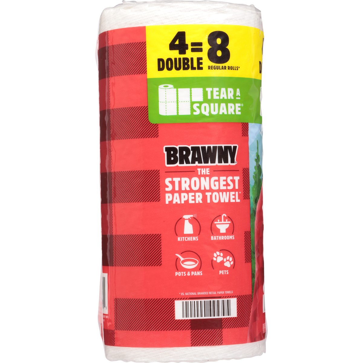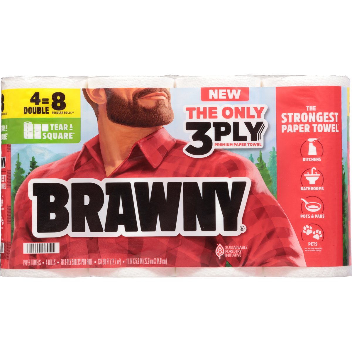 11 in x 5.9 in (27.9 cm x 14.9 cm). 76 3-ply sheets per roll. 137 sq ft (12.7 sqm). 4 double = 8 regular rolls**. Tear a Square. New. the only 3-ply premium paper towel. The strongest paper towel*. Kitchens. Bathrooms. Pots & pans. Pets. * vs. national branded retail paper towels. ** Based on a Brawny regular roll with 38 sheets. www.brawny.com. See how our 3-ply stacks up. Visit our Website at: www.brawny.com. Proudly supporting American jobs. Sustainable Forestry Initiative: Certified sourcing. www.forests.org. Hey, did you know? Learn more about how Brawny paper towels help promote healthy forests at Brawny.com/sustainability. Made in the USA with domestic and foreign materials for Georgia-Pacific Consumer Products.