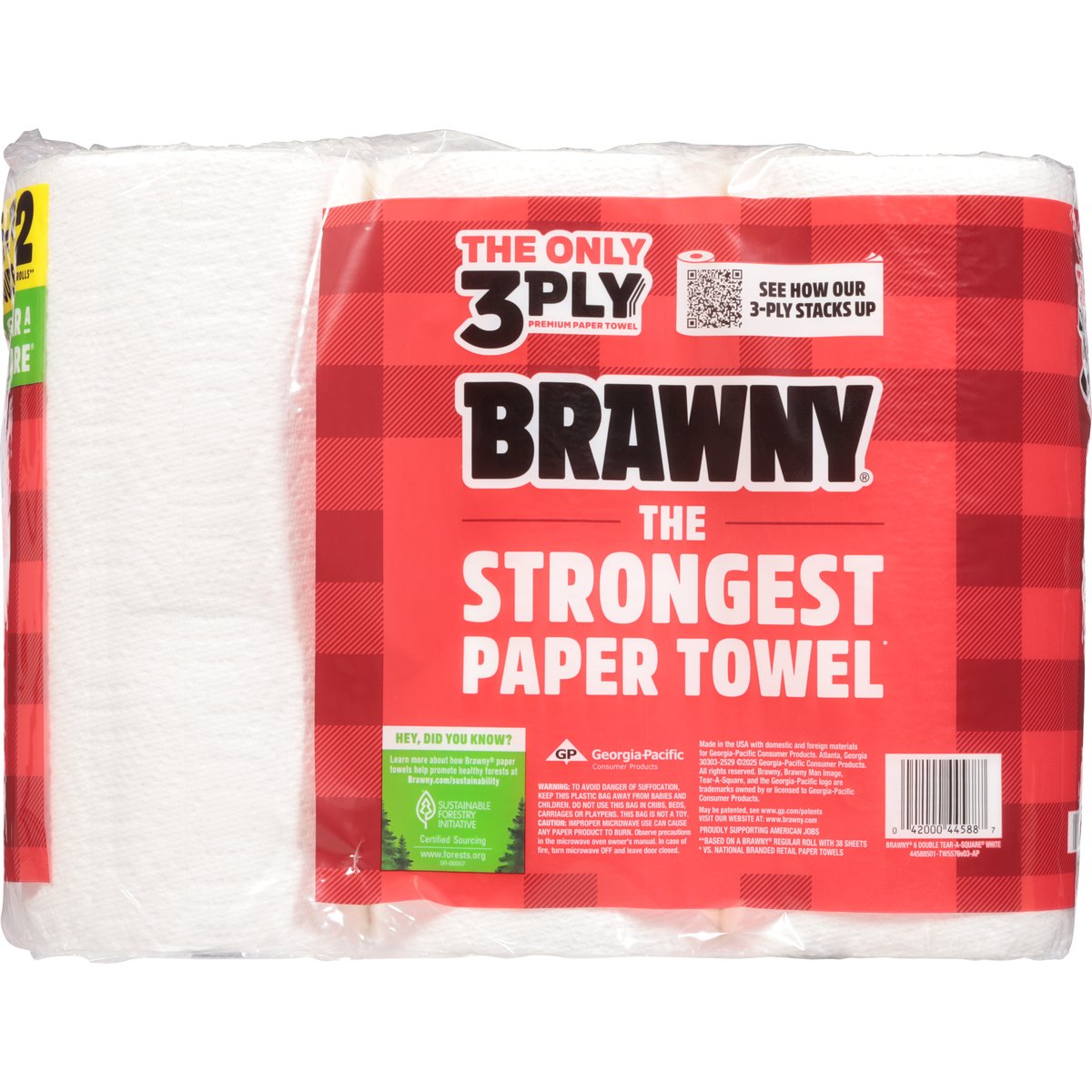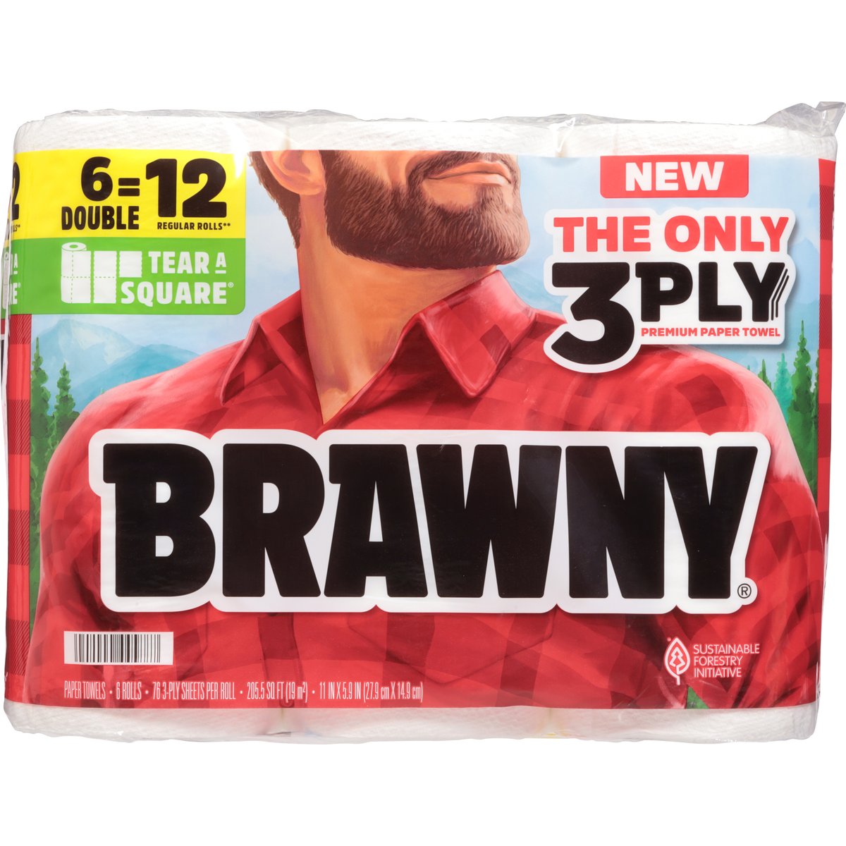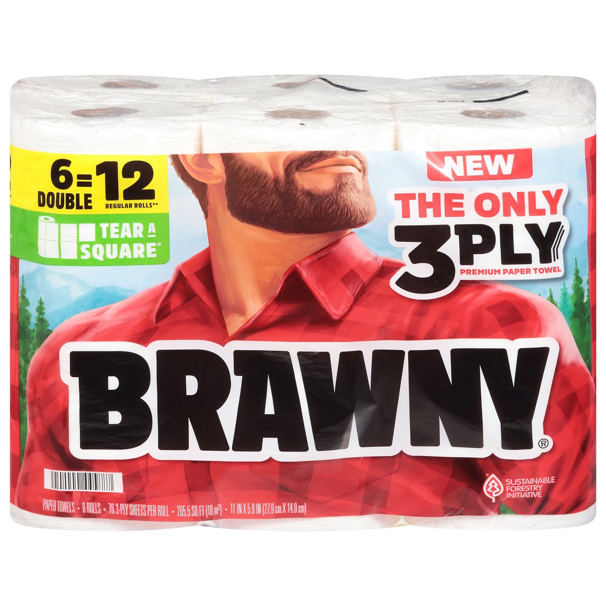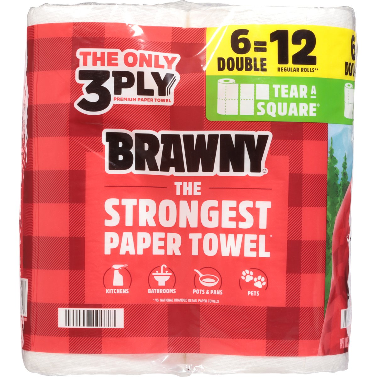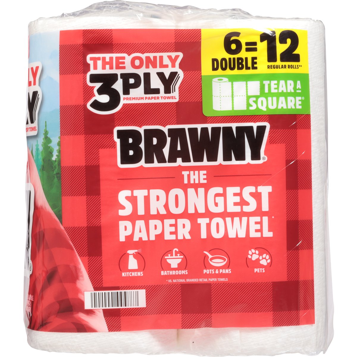 6 rolls 76 3-Ply sheets per roll 205.5 sq ft (19 sq m). 11 in x 5.9 in (27.9 cm x 14.9 cm). 6 = 12 double regular rolls**. Tear a square. New. The only 3ply premium paper towel. The strongest paper towel*. Kitchen. bathrooms. Pot & Pans. Pets. Georgia-pacific consumer products. ** Based on a brawny regular roll with 38 sheets. *Vs. National branded retail paper towels. www.brawny.com. See how our 3-ply stacks up. Visit our website at: www.brawny.com. Proudly supporting American jobs. Hey, did you know? Learn more about how Brawny paper towels help promote healthy forests at Brawny.com/sustainability. Sustainable Forestry Initiative: Certified Sourcing. www.forests.org. Made in the USA with domestic and foreign materials for Georgia-Pacific Consumer Products.
