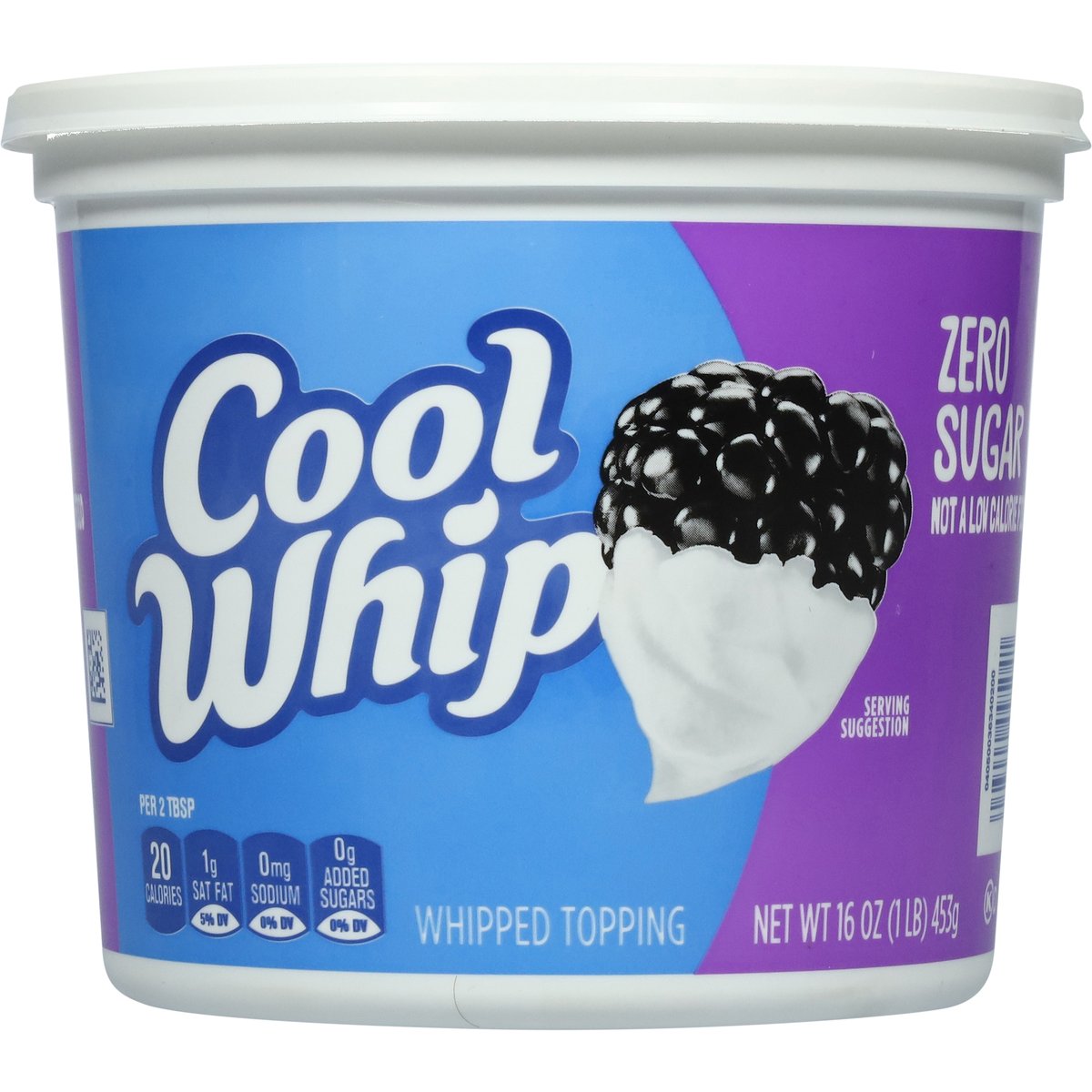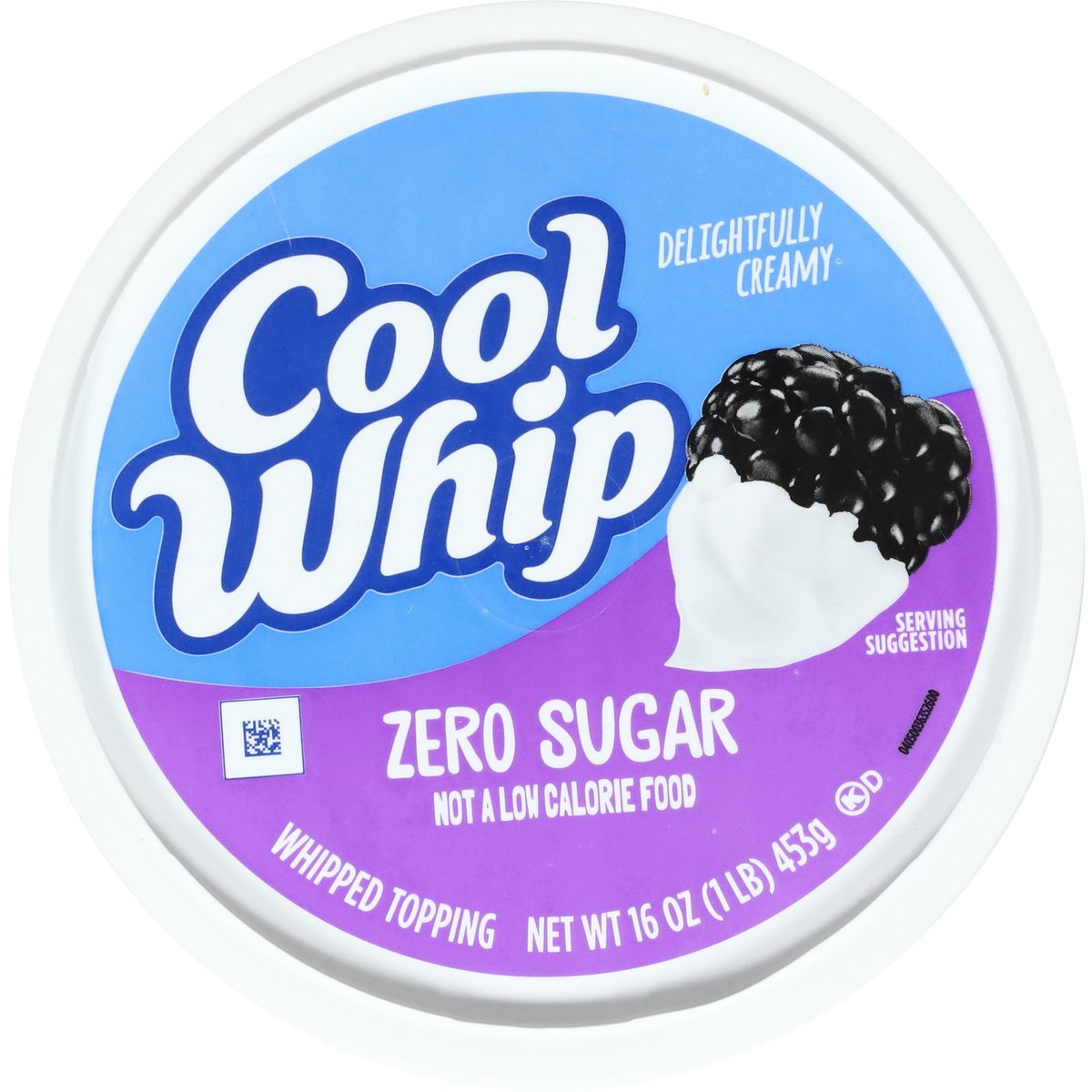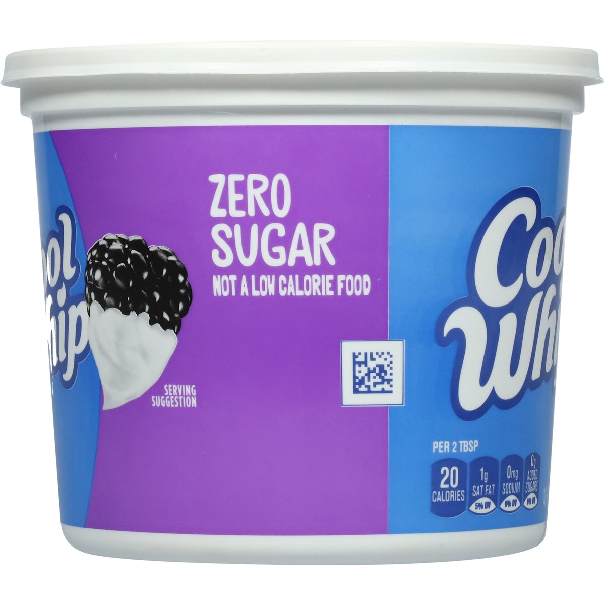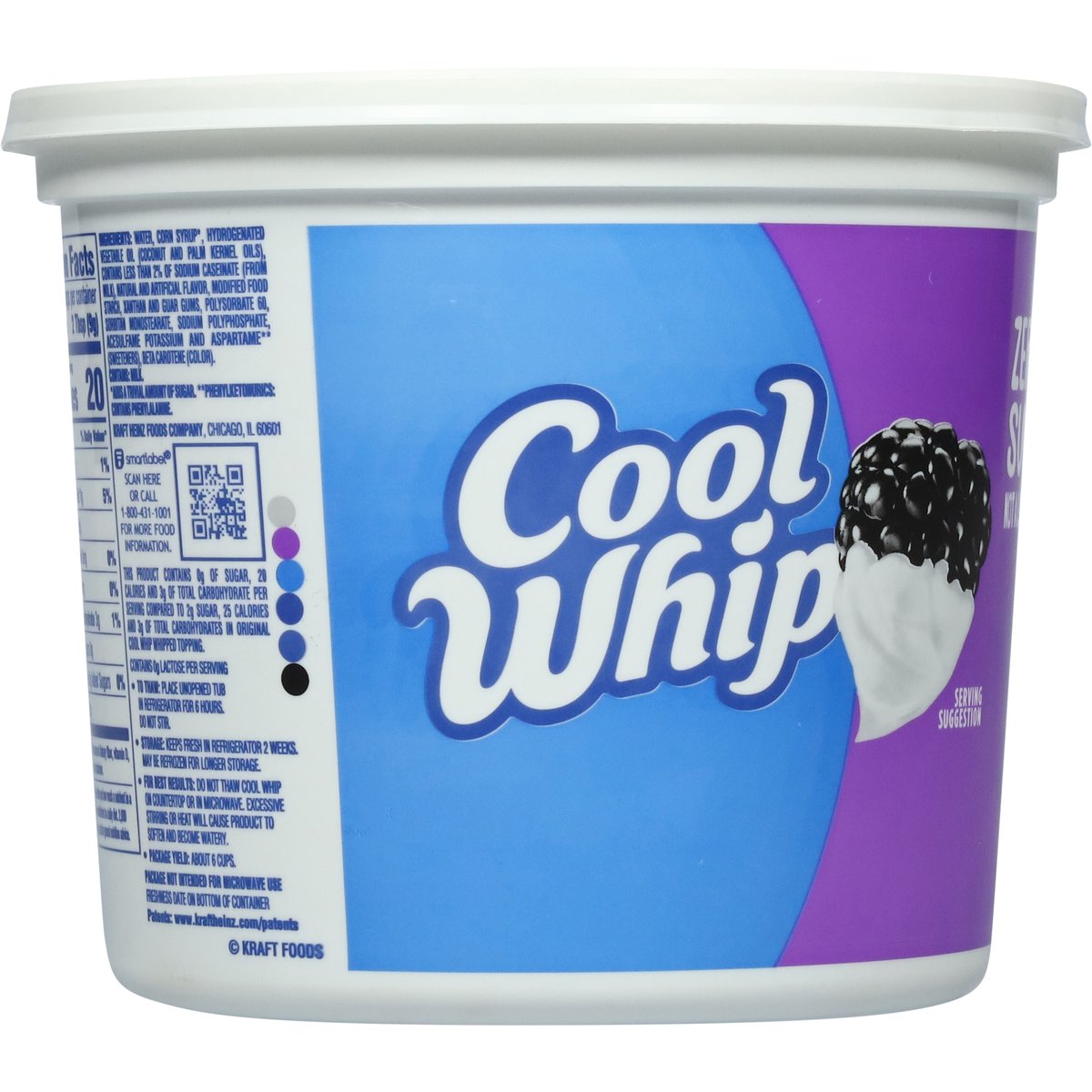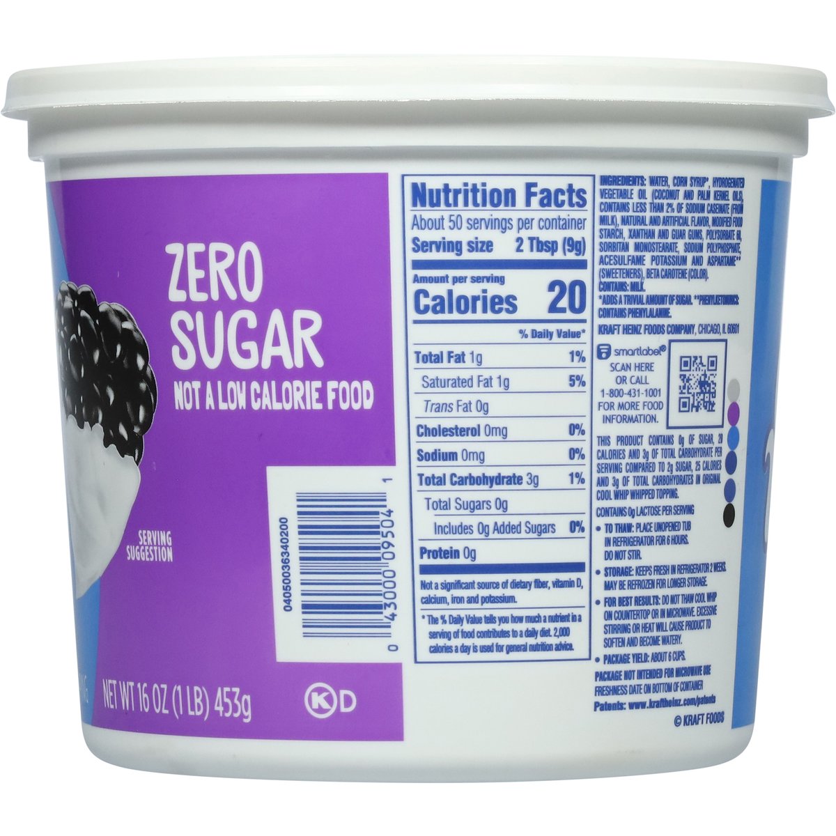Per 2 tbsp: 20 calories; 1 g sat fat (5% DV); 0 mg sodium (0% DV); 0 g added sugars (0% DV). Zero sugar. Not a low calorie food. This product contains 0 g of sugar, 20 calories and 3 g of total carbohydrate per serving compared to 2 g sugar, 25 calories and 3 g of total carbohydrates in original cool whip whipped topping. Contains 0 g lactose per serving. Delightfully creamy. Package Yield: About 6 cups. www.kraftheinz.com. SmartLabel. Scan or call 1-800-431-1001 for more food information.