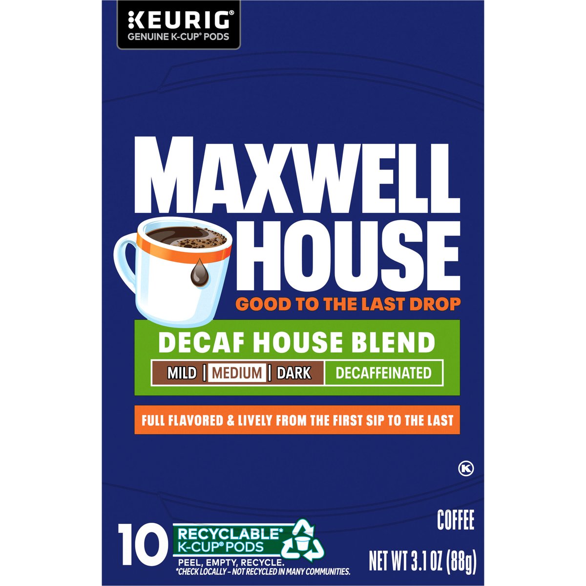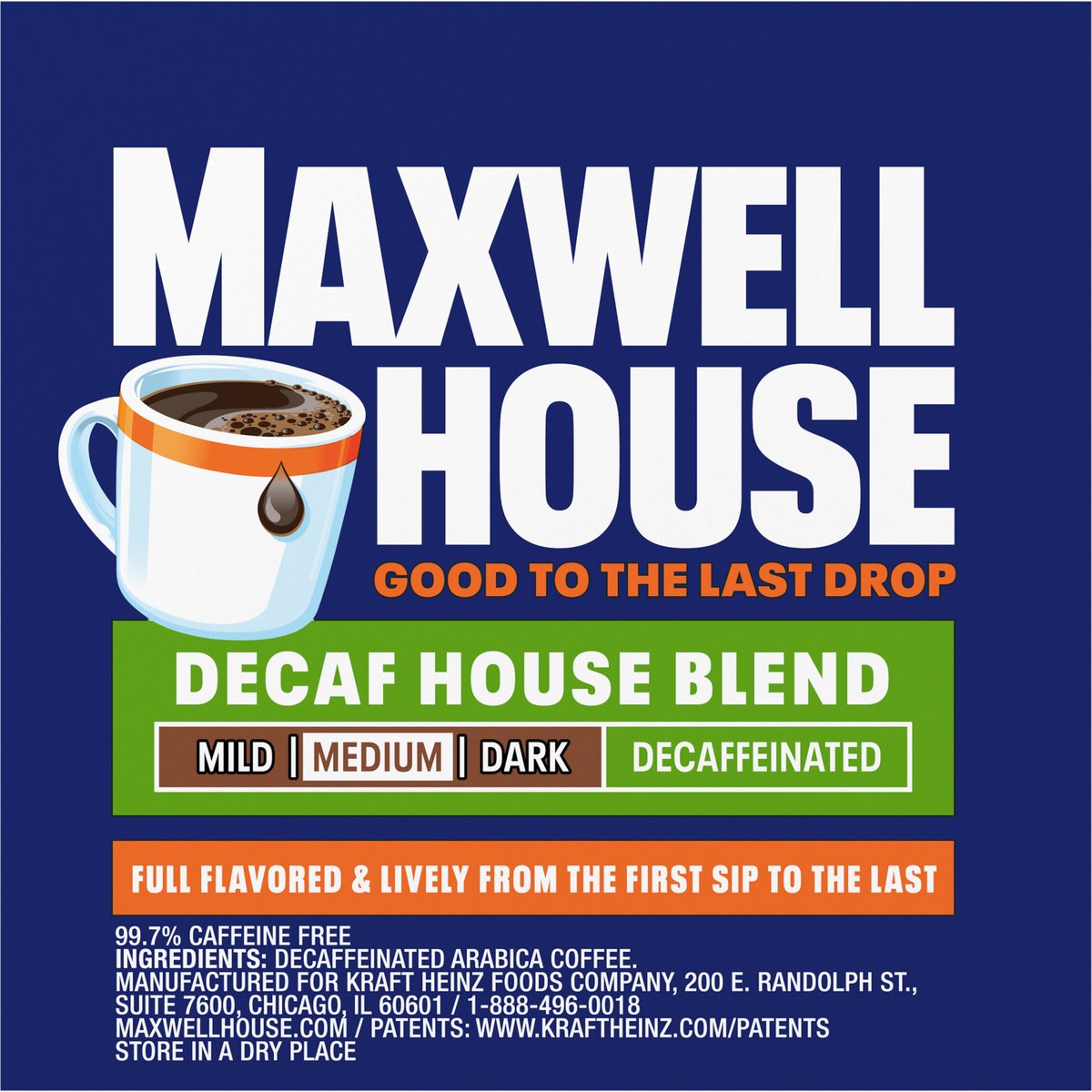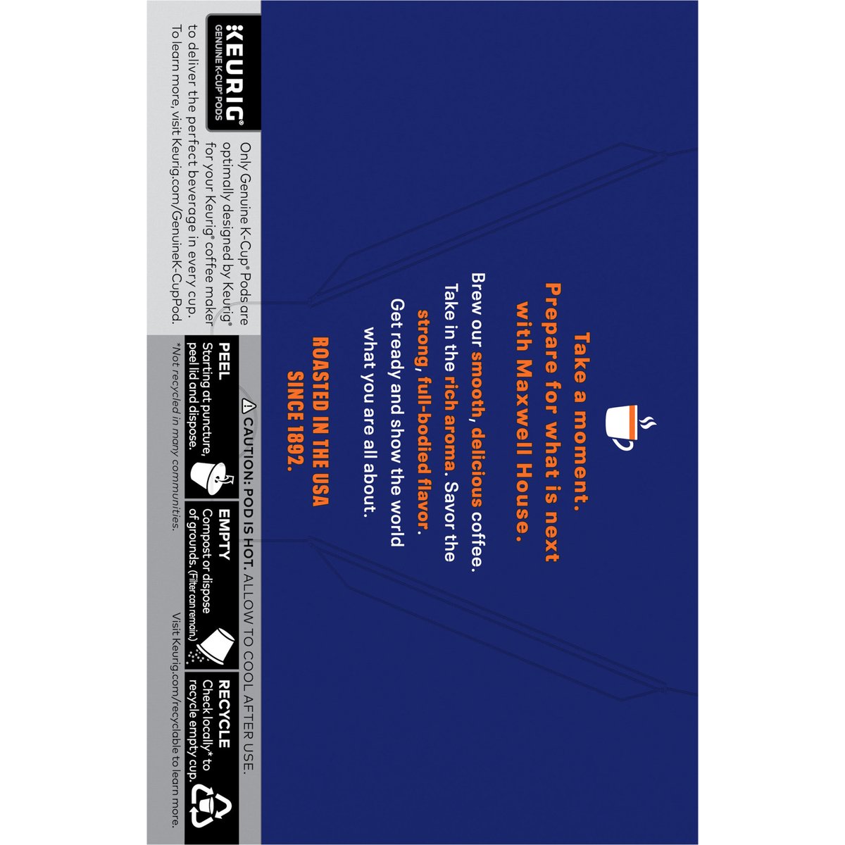 Fully flavored & lively from the first sip to the last. Decaffeinated. 99.7% caffeine free. Keurig Genuine K-Cup Pods. Good to the last drop. Mild. Medium. Dark. Full flavored & lively from the first sip to the last. Take a moment. Prepare for what is next with Maxwell House. Brew our smooth, delicious coffee. Take in the rich aroma. Savor the strong, full-bodied flavor. Get ready and show the world what you are all about. Roasted in the USA. Since 1892. Only Genuine K-Cup Pods are optimally designed by Keurig for your Keurig coffee maker to deliver the perfect beverage in every cup. To learn more, visit Keurig.com/GenuineK-CupPod. www.maxwellhouse.com.www.Keurig.com. how2recycle.info. Find us on Facebook.com/Keurig or Instagram.com/Keurig. For more information contact: Kraft Heinz Foods Company Chicago, IL 60601 1-888-496-0018 www.maxwellhouse.com. For brewer inquiries contact: 1-866-901-BREW/1-866-901-2739 www.Keurig.com. Recyclable* K-Cup Pods. Peel, Empty, Recycle. Peel: Starting at puncture, peel lid and dispose. Empty: Compost or dispose of grounds. (Filter can remain). Recycle: Check locally* to recycle empty cup. Visit Keurig.com/recyclable to learn more. * Check locally - not recycled in many communities. * Not recycled in many communities. Roasted in the USA