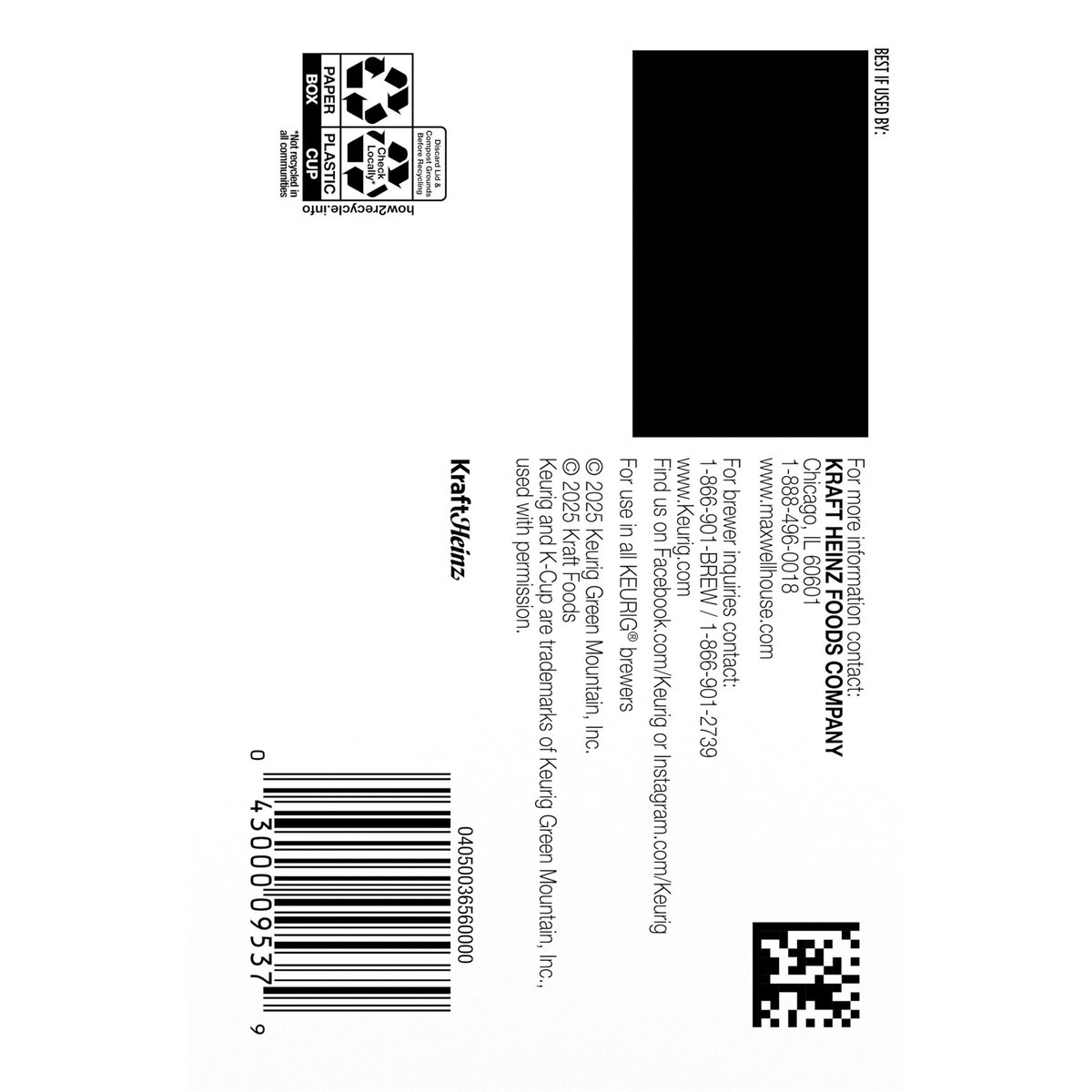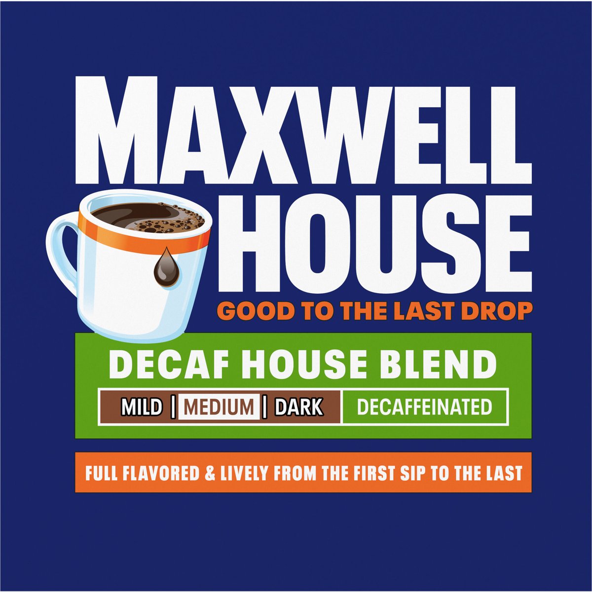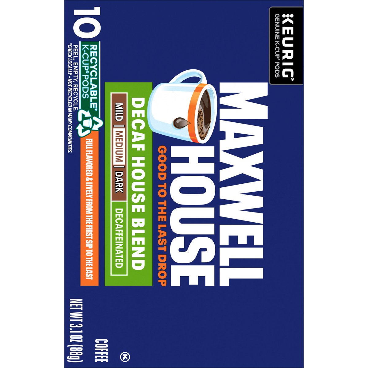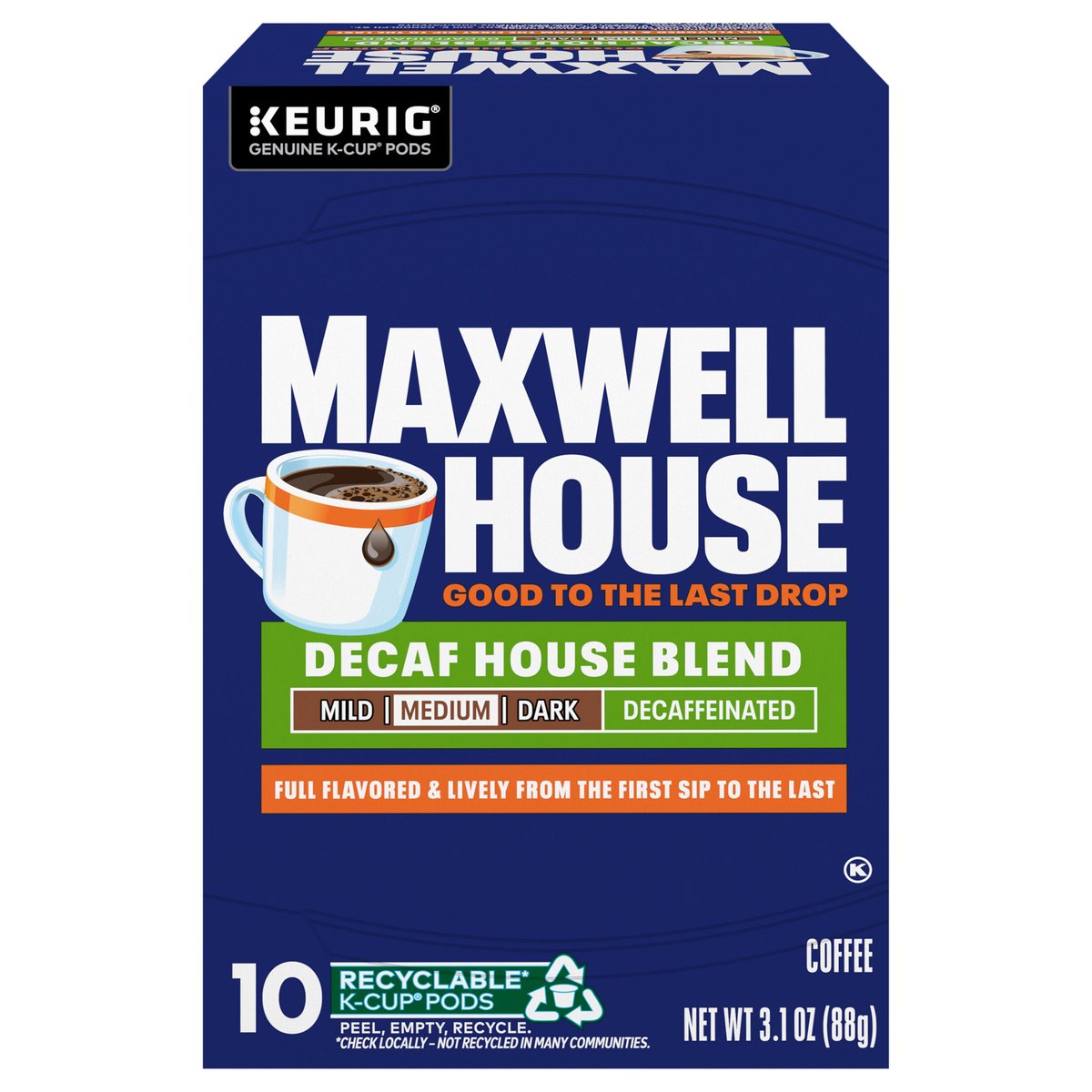 Fully flavored & lively from the first sip to the last. Decaffeinated. 99.7% caffeine free. Keurig Genuine K-Cup Pods. Good to the last drop. Mild. Medium. Dark. Full flavored & lively from the first sip to the last. Take a moment. Prepare for what is next with Maxwell House. Brew our smooth, delicious coffee. Take in the rich aroma. Savor the strong, full-bodied flavor. Get ready and show the world what you are all about. Roasted in the USA. Since 1892. Only Genuine K-Cup Pods are optimally designed by Keurig for your Keurig coffee maker to deliver the perfect beverage in every cup. To learn more, visit Keurig.com/GenuineK-CupPod. www.maxwellhouse.com.www.Keurig.com. how2recycle.info. Find us on Facebook.com/Keurig or Instagram.com/Keurig. For more information contact: Kraft Heinz Foods Company Chicago, IL 60601 1-888-496-0018 www.maxwellhouse.com. For brewer inquiries contact: 1-866-901-BREW/1-866-901-2739 www.Keurig.com. Recyclable* K-Cup Pods. Peel, Empty, Recycle. Peel: Starting at puncture, peel lid and dispose. Empty: Compost or dispose of grounds. (Filter can remain). Recycle: Check locally* to recycle empty cup. Visit Keurig.com/recyclable to learn more. * Check locally - not recycled in many communities. * Not recycled in many communities. Roasted in the USA