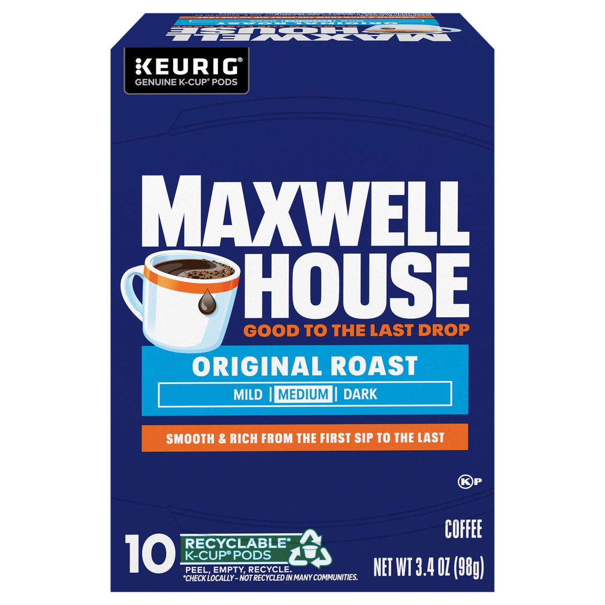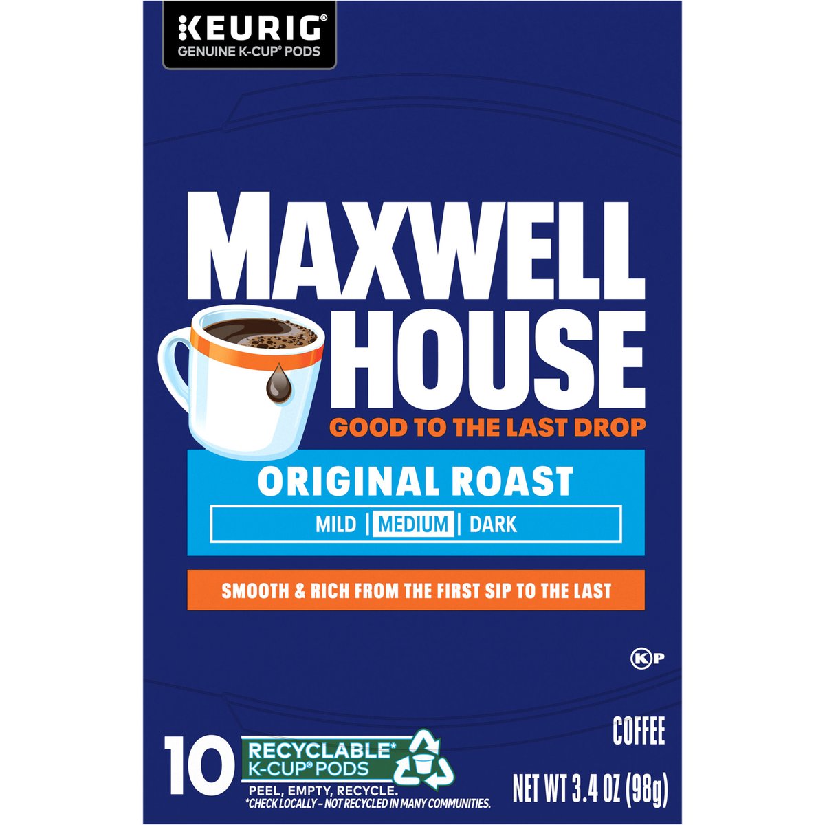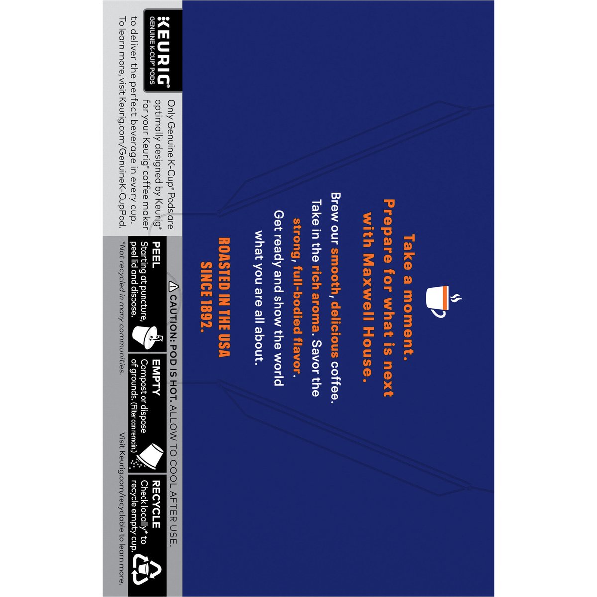 Keurig - Genuine K-Cup Pods. Good to the last drop. Mild. Medium. Dark. Smooth & rich from the first sip to the last. Take a moment. Prepare for what is next with Maxwell House. Brew our smooth, delicious coffee. Take in the rich aroma. Savor the strong, full-bodied flavor. Get ready and show the world what you are all about. Since 1892. Only Genuine K-Cup Pods are optimally designed by Keurig for your Keurig coffee maker to deliver the perfect beverage in every cup. how2recycle.info. www.Keurig.com. www.maxwellhouse.com. Keurig.com/GenuineK-CupPod. Find us on Facebook.com/Keurig or Instagram.com/Keurig. For More Information Contact: Kraft Heinz Foods Company, Chicago, IL 60601, 1-888-496-0018, www.maxwellhouse.com. For brewer inquiries contact: 1-866-901-Brew / 1-866-901-2739. www.Keurig.com. To learn more, visit Keurig.com/GenuineK-CupPod. Recyclable* K-Cup pods. Peel, empty, recycle. Peel: Starting at puncture, peel lid and dispose. Empty: Compost or dispose of grounds (filter can remain). Recycle check locally* to recycle empty cup. * Check locally - not recycled in many communities. * Not recycled in many communities. Visit Keurig.com/recyclable to learn more. Roasted in the USA.