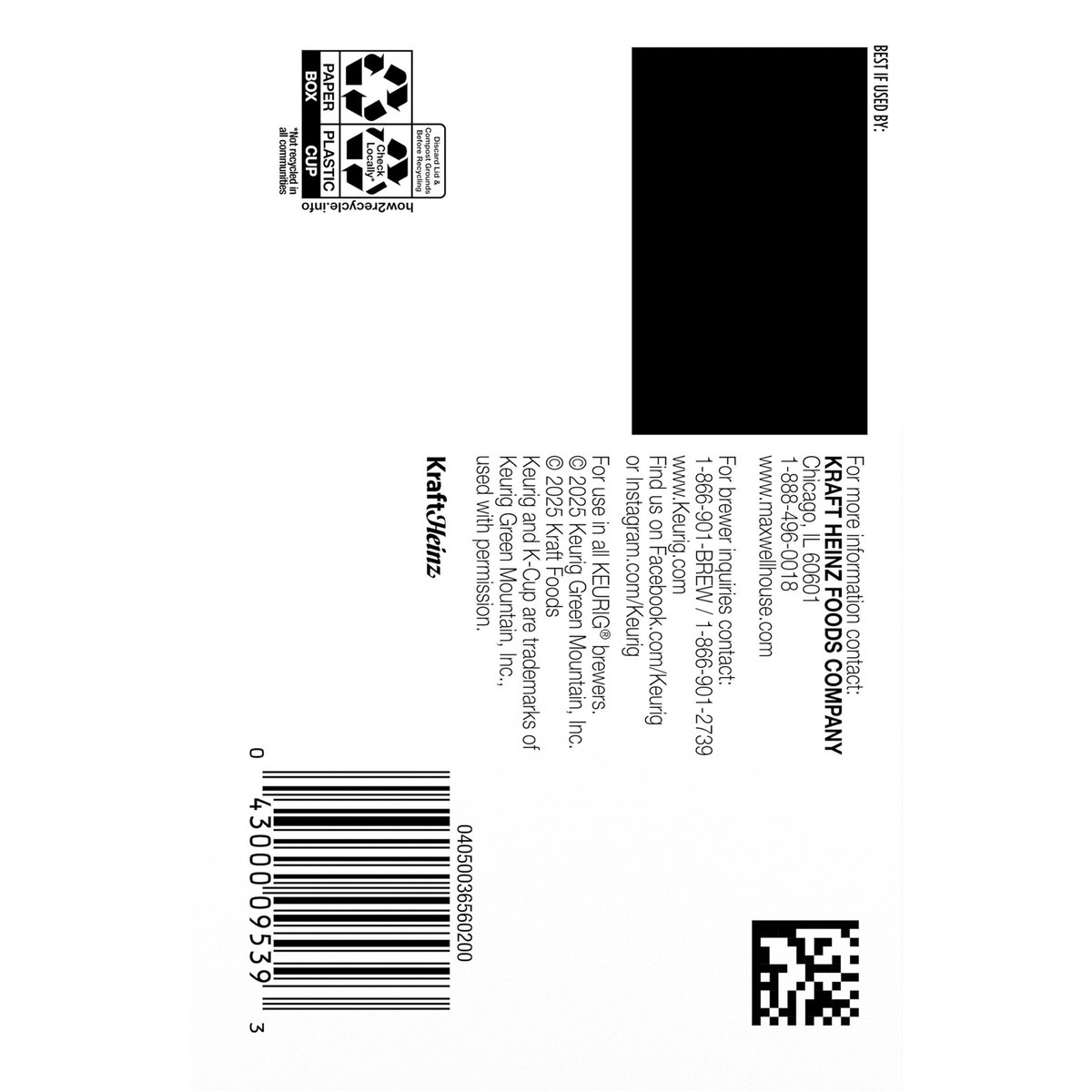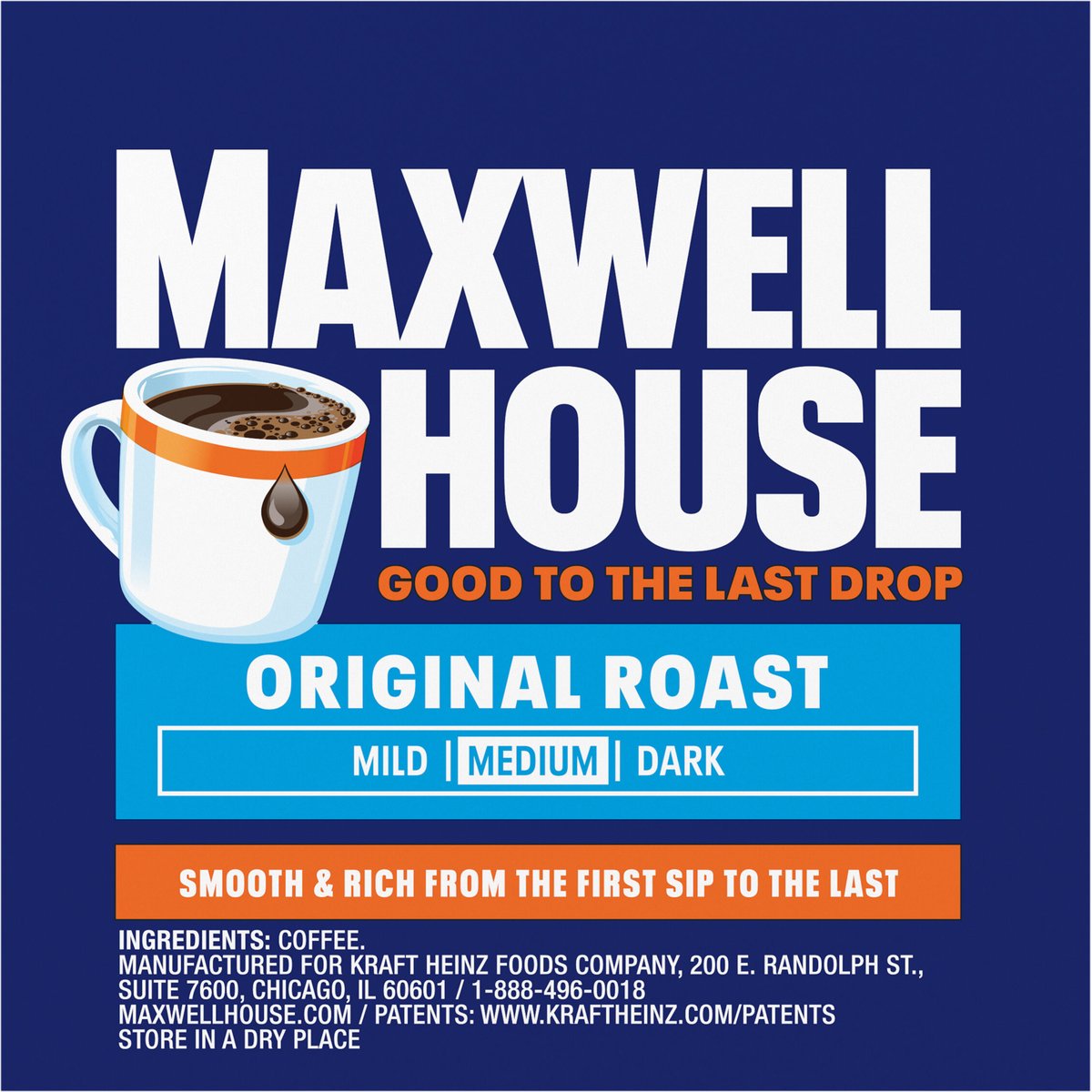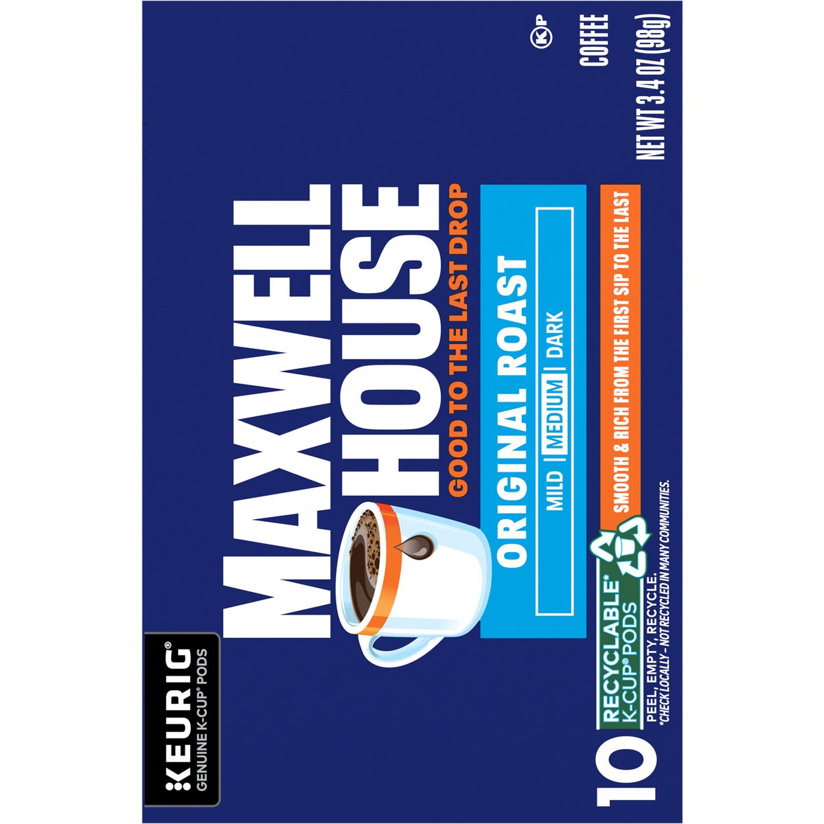 Keurig - Genuine K-Cup Pods. Good to the last drop. Mild. Medium. Dark. Smooth & rich from the first sip to the last. Take a moment. Prepare for what is next with Maxwell House. Brew our smooth, delicious coffee. Take in the rich aroma. Savor the strong, full-bodied flavor. Get ready and show the world what you are all about. Since 1892. Only Genuine K-Cup Pods are optimally designed by Keurig for your Keurig coffee maker to deliver the perfect beverage in every cup. how2recycle.info. www.Keurig.com. www.maxwellhouse.com. Keurig.com/GenuineK-CupPod. Find us on Facebook.com/Keurig or Instagram.com/Keurig. For More Information Contact: Kraft Heinz Foods Company, Chicago, IL 60601, 1-888-496-0018, www.maxwellhouse.com. For brewer inquiries contact: 1-866-901-Brew / 1-866-901-2739. www.Keurig.com. To learn more, visit Keurig.com/GenuineK-CupPod. Recyclable* K-Cup pods. Peel, empty, recycle. Peel: Starting at puncture, peel lid and dispose. Empty: Compost or dispose of grounds (filter can remain). Recycle check locally* to recycle empty cup. * Check locally - not recycled in many communities. * Not recycled in many communities. Visit Keurig.com/recyclable to learn more. Roasted in the USA.