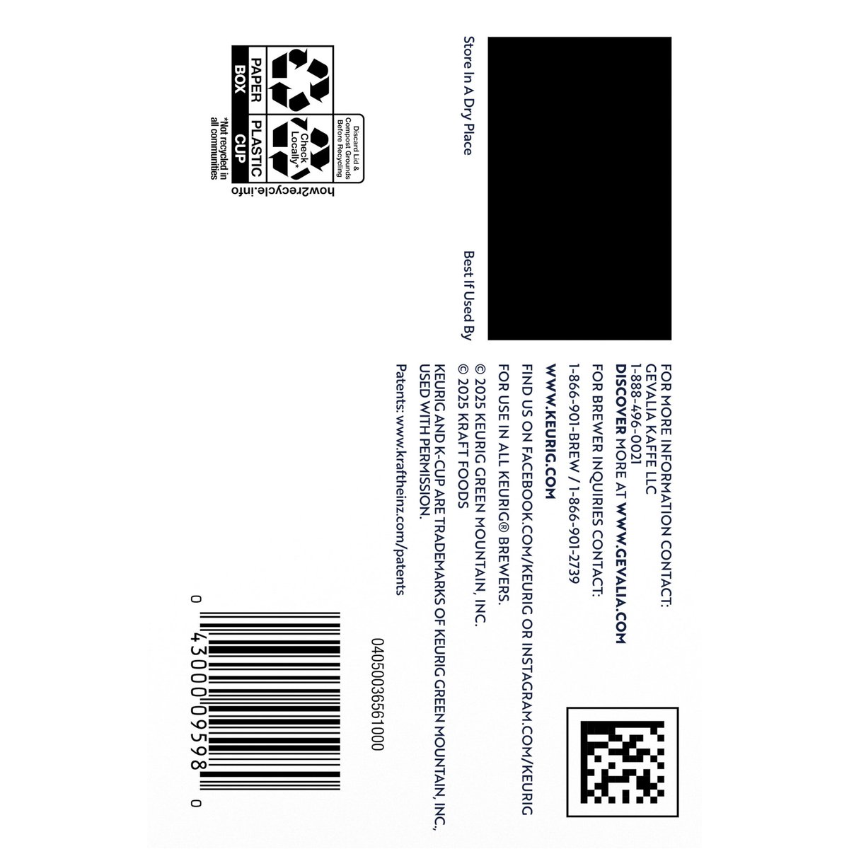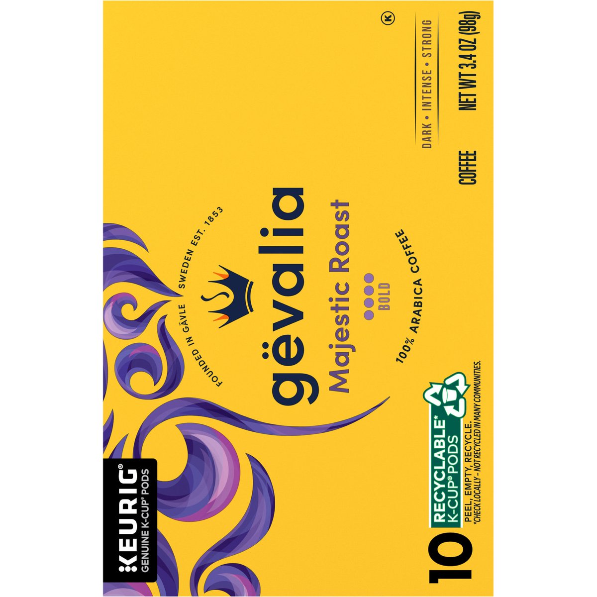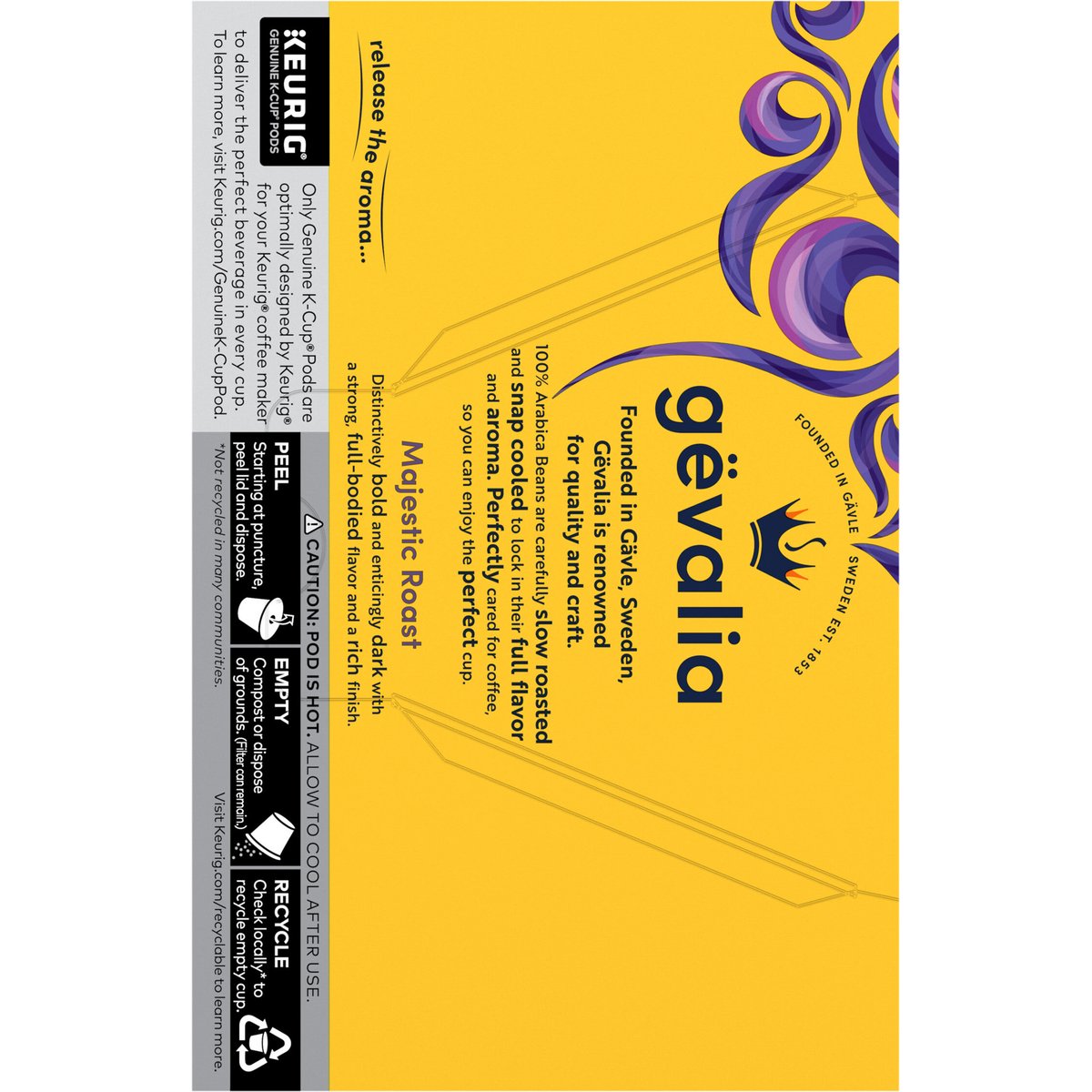 Founded in Gavle. Sweden EST 1853. Founded in Gävle, sweden, Gevalia is renowned For quality and craft. 100% arabica beans are carefully slow roasted And snap cooled to lock in their full flavor And aroma. Perfectly cared for coffee, So you can enjoy the perfect cup. Majestic roast Distinctively bold and enticingly dark with A strong, full-bodied flavor and a rich finish. Only Genuine K-Cup Pods are optimally designed by Keurig for your Keurig coffee maker to deliver the perfect beverage in every cup. www.gevalia.com. www.keurig.com. how2recycle.info. Find us on facebook.com/keurig or instagram.com/keurig. For more information contact: Gevalia Kaffe LLC 1-888-496-0021. Discover more at www.gevalia.com. For brewer inquires contact: 1-866-901-BREW / 1-866-901-2739. www.keurig.com. Recyclable*. K-cup pods peel, empty, recycle. *Check locally - not recycled in many communities. Peel: Starting at puncture, peel lid and dispose. Empty: Compost or dispose of grounds (filter can remain). Recycle check locally* to recycle empty cup. *Not recycled in many communities. Visit Keurig.com/recyclable to learn more.