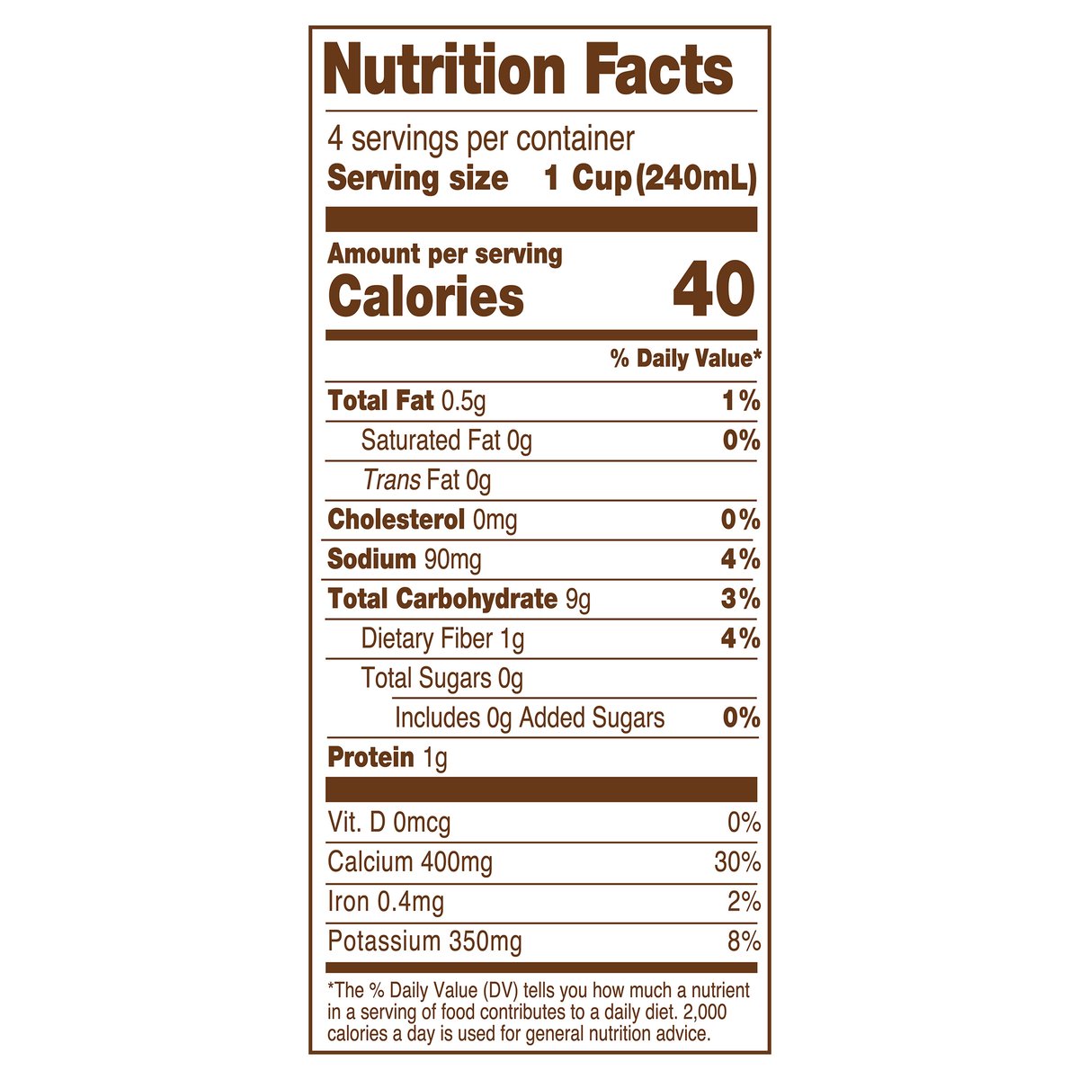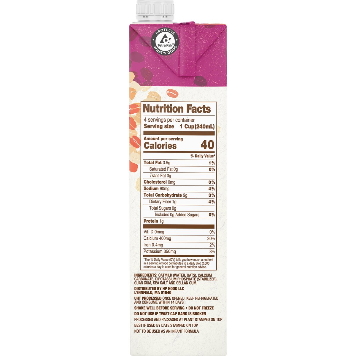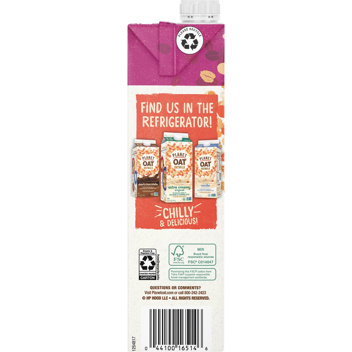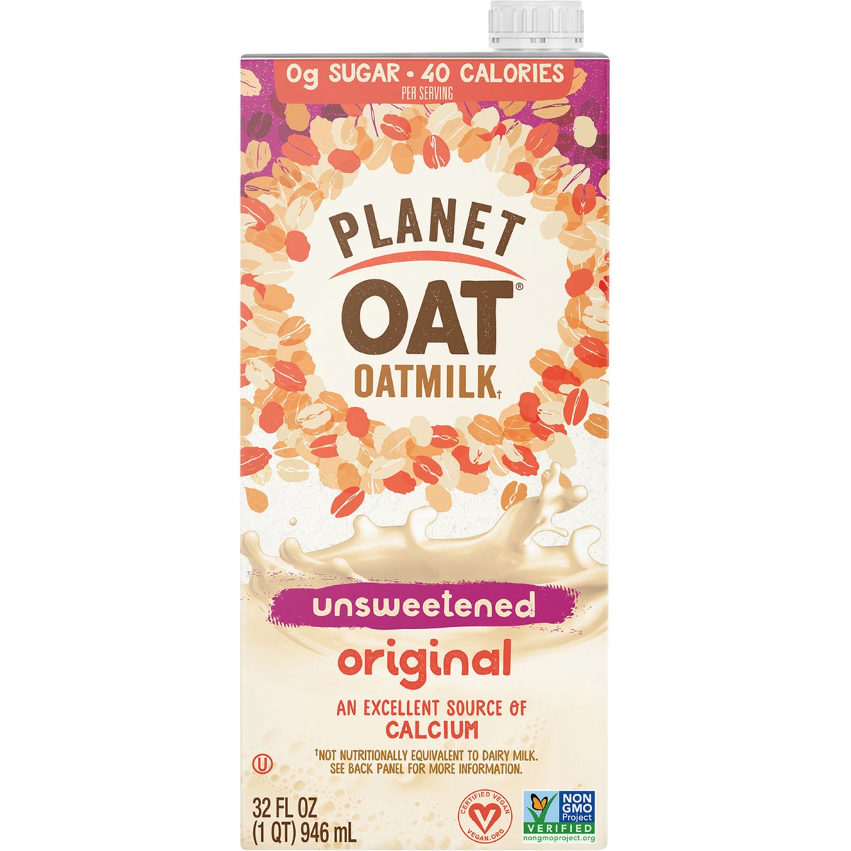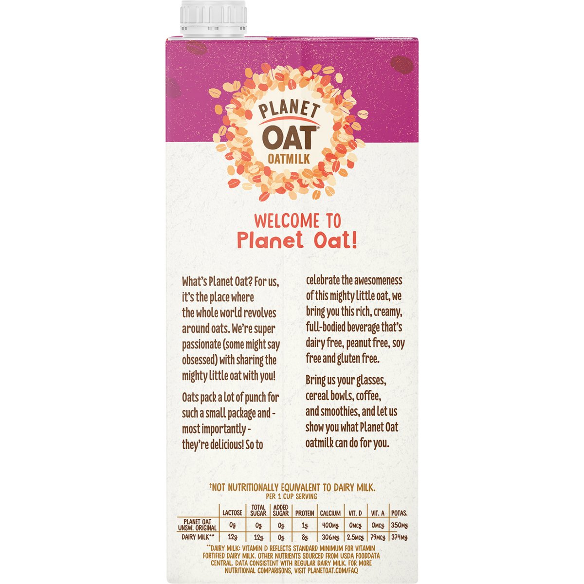 Per 1 Cup Serving: Planet Oat Unsw. Original: 0 g lactose; 0 g total sugar; 0 g added sugar; 1 g protein; 400 mg calcium; 0 mcg vit. D; 0 mcg vit. A;3500 mg potas. Dairy Milk**: 12 g lactose; 12 g total sugar; 0 g added sugar; 8 g protein; 306 mg calcium; 2.5 mcg vit.D; 79 mcg vit. A; 374 mg potas. ** Dairy Milk: Vitamin D reflects standard minimum for vitamin fortified dairy milk. Other nutrients sourced from USDA Fooddata Central. Data consistent with regular dairy milk. For more nutritional comparisons, visit planetoat.com/fqa. Certified vegan. vegan.org. An excellent source of calcium. Non-GMO Project verified. nongmoproject.org. Oatmilk (a). (a) Not nutritionally equivalent to dairy milk. See back panel for more information. Welcome to Planet Oat! What's Planet Oat? For us, it's the place where the whole world revolves around oats. We're super passionate (some might say obsessed) with sharing the mighty little oat with you! Oats pack a lot of punch for such a small package and - most importantly- they're delicious! So to celebrate the awesomeness of this mighty little oat, we bring you this rich, creamy, full-bodied beverage that's dairy free, peanut free, soy free and gluten free. Bring us your glasses, cereal bowls, coffee, and smoothies, and let us show you what Planet Oat oatmilk can do for you. Planet Oat Unsw. Original: 0 g lactose; 0 g total sugar; 0 g added sugar; 1 g protein; 400 g calcium; 0 mcg vit. D; 0 mcg vit. A; 350 mg potas. Dairy Milk**: 12 g lactose; 12 g total sugar; 0 g added sugar; 8 g protein; 306 g calcium; 2.5 mcg vit. D; 79 mcg vit. A; 374 mg potas. Not nutritionally equivalent to dairy milk. Per 1 cup serving. ** Dairy milk: vitamin d reflects standard minimum for vitamin fortified dairy milk. Other nutrients sourced from USDA FoodData central. Data consistent with regular dairy milk. For more nutritional comparisons, visit planetoat.com/faq. planetoat.com. how2recycle.info. Questions or comments? Visit Planetoat.com or call 800-242-2423. Find us in the refrigerator! Planet Oat Oatmilk Dark Chocolate; Planet Oat Oatmilk Extra Creamy; Planet Oat Oatmilk Vanilla. Tetra Pak: Protects what's good. FSC: Mix - Board from responsible sources. www.fsc.org. Purchasing this FSC carton from Tetra Pak supports responsible forest management worldwide.