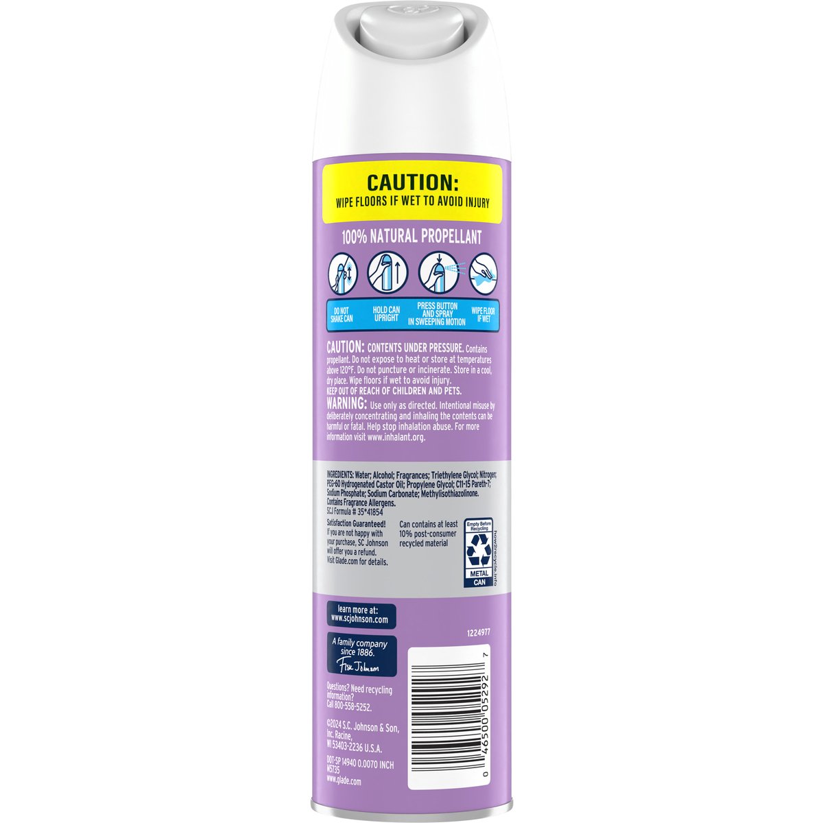 SC Johnson - A family company. New. No need to shake. 100% natural propellant. A family company since 1886. - Fisk Johnson. Satisfaction Guaranteed! If you are not happy with your purchase, SC Johnson will offer you a refund. Visit Glade.com for details. www.glade.com. www.scjohnson.com. how2recycle.info. Learn more at: www.scjohnson.com. Questions? Need recycling information? Call 800-558-5252. Can contains at least 10% post-consumer recycled material.