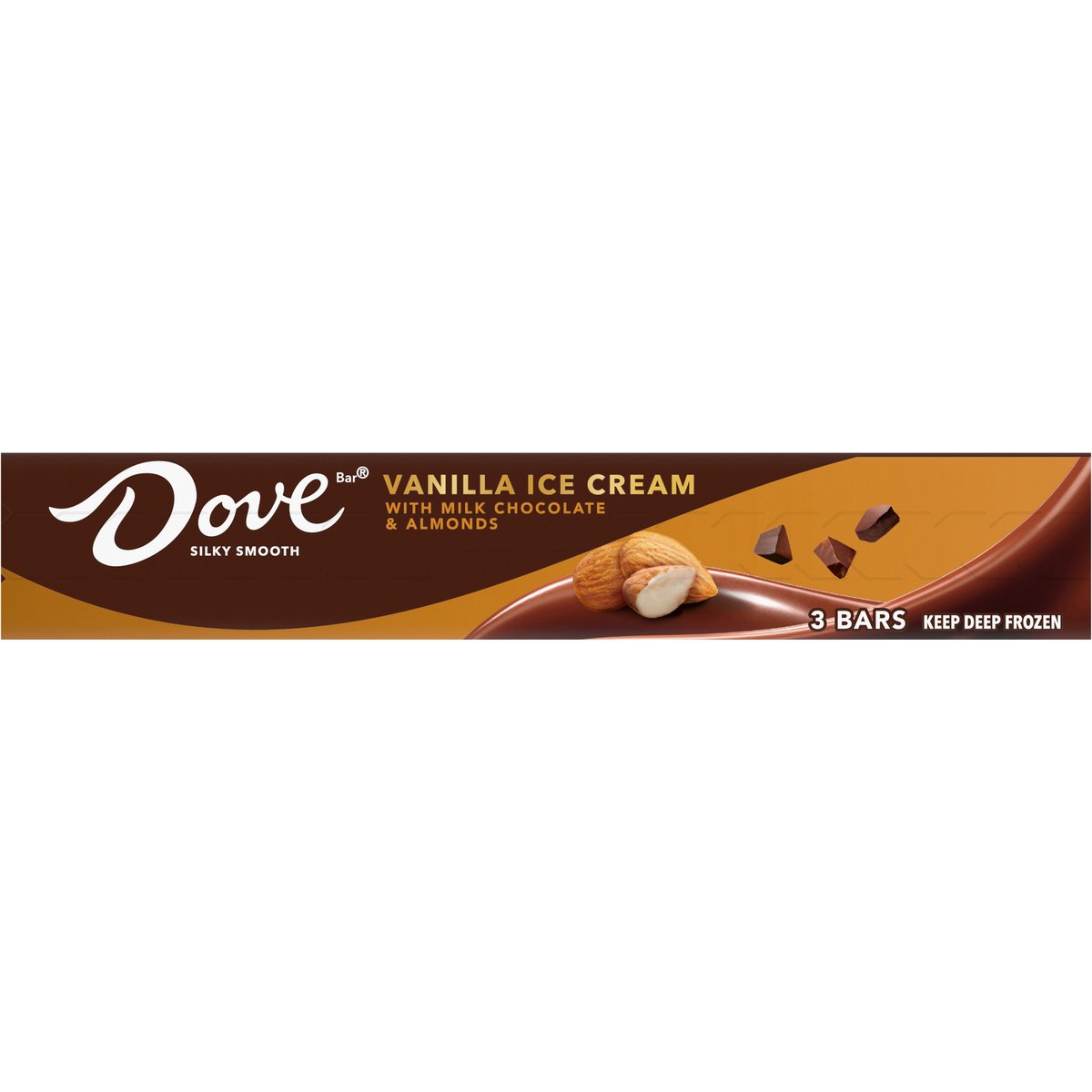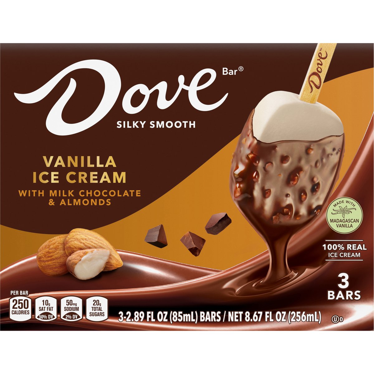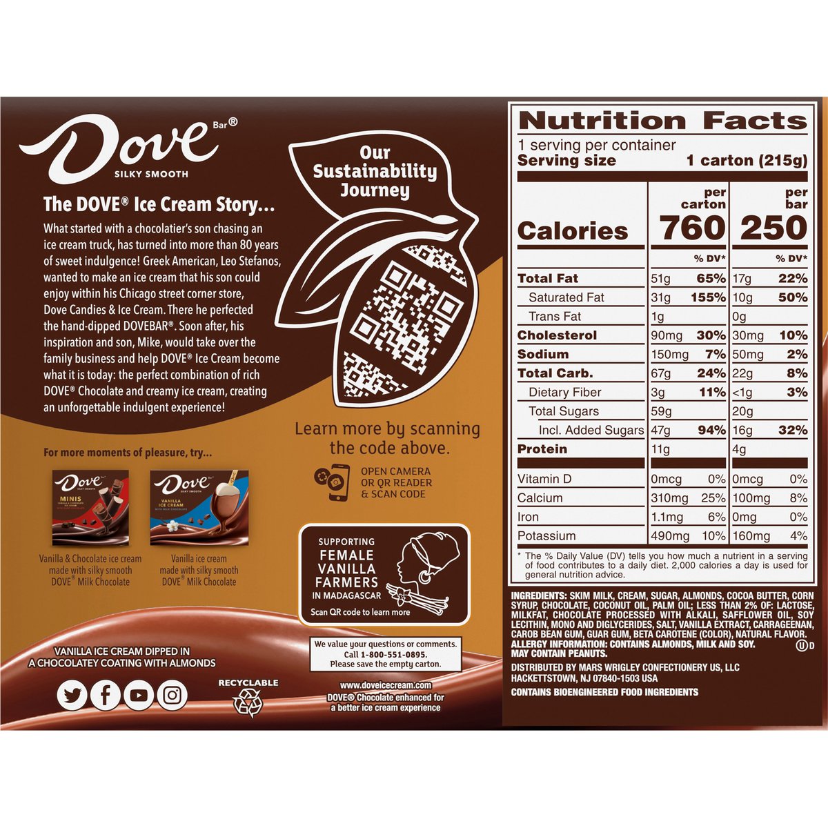 Vanilla ice cream with milk chocolate & almonds. Vanilla ice cream dipped in a chocolate coating with almonds. Per Bar: 250 calories; 10 g sat fat (50% DV); 50 mg sodium (2% DV); 20 g total sugars. Contains bioengineered food ingredients. 100% real ice cream. Silky smooth. The Dove Ice Cream Story - What started with a chocolatier's son chasing an ice cream truck, has turned into more than 80 years of sweet indulgence! Greek American, Leo Stefanos, wanted to make an ice cream that his son could enjoy within his Chicago street corner store, Dove Candies & Ice Cream. There he perfected the hand-dipped Dovebar. Soon after, his inspiration and son, Mike, would take over the family business and help Dove ice cream become what it is today: the perfect combination of rich Dove chocolate and creamy ice cream, creating an unforgettable indulgent experience! Vanilla ice cream dipped in a chocolatey coating with almonds. Dove chocolate enhanced for a better ice cream experience. www.doveicecream.com. Twitter; Facebook; Youtube; Instagram. Our sustainability Journey: Learn more by scanning the code above. Open camera or QR reader & scan code. Supporting female vanilla farmers in Madagascar. Scan QR code to learn more. We value your questions or comments. Call 1-800-551-0895. Please save the empty carton. www.doveicecream.com. Supporting female vanilla farmers in Madagascar. Scan QR code to learn more. For more moments of pleasure, try: Vanilla & Chocolate ice cream made with silky smooth Dove Milk Chocolate; Vanilla ice cream made with silky smooth Dove Milk Chocolate. Recyclable.