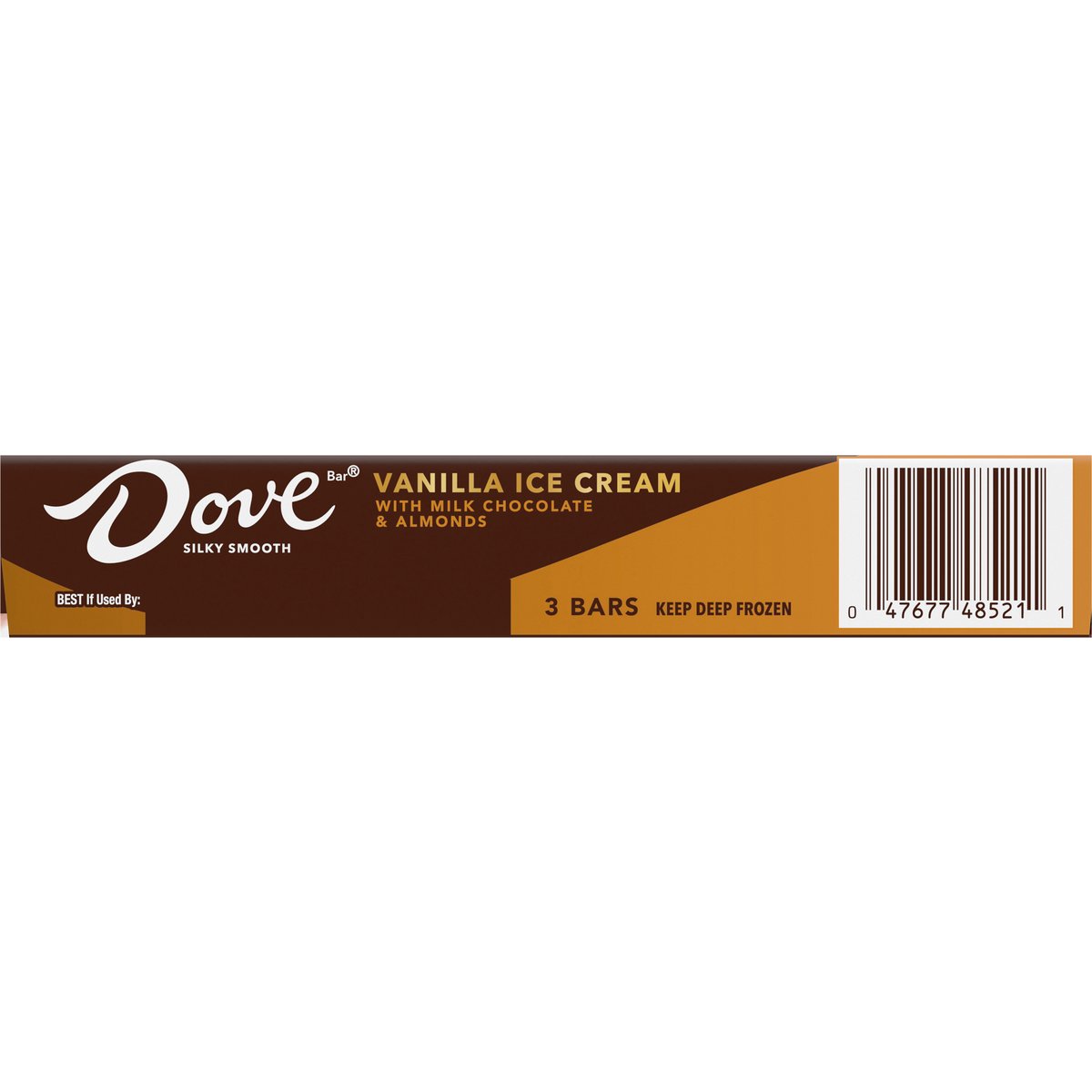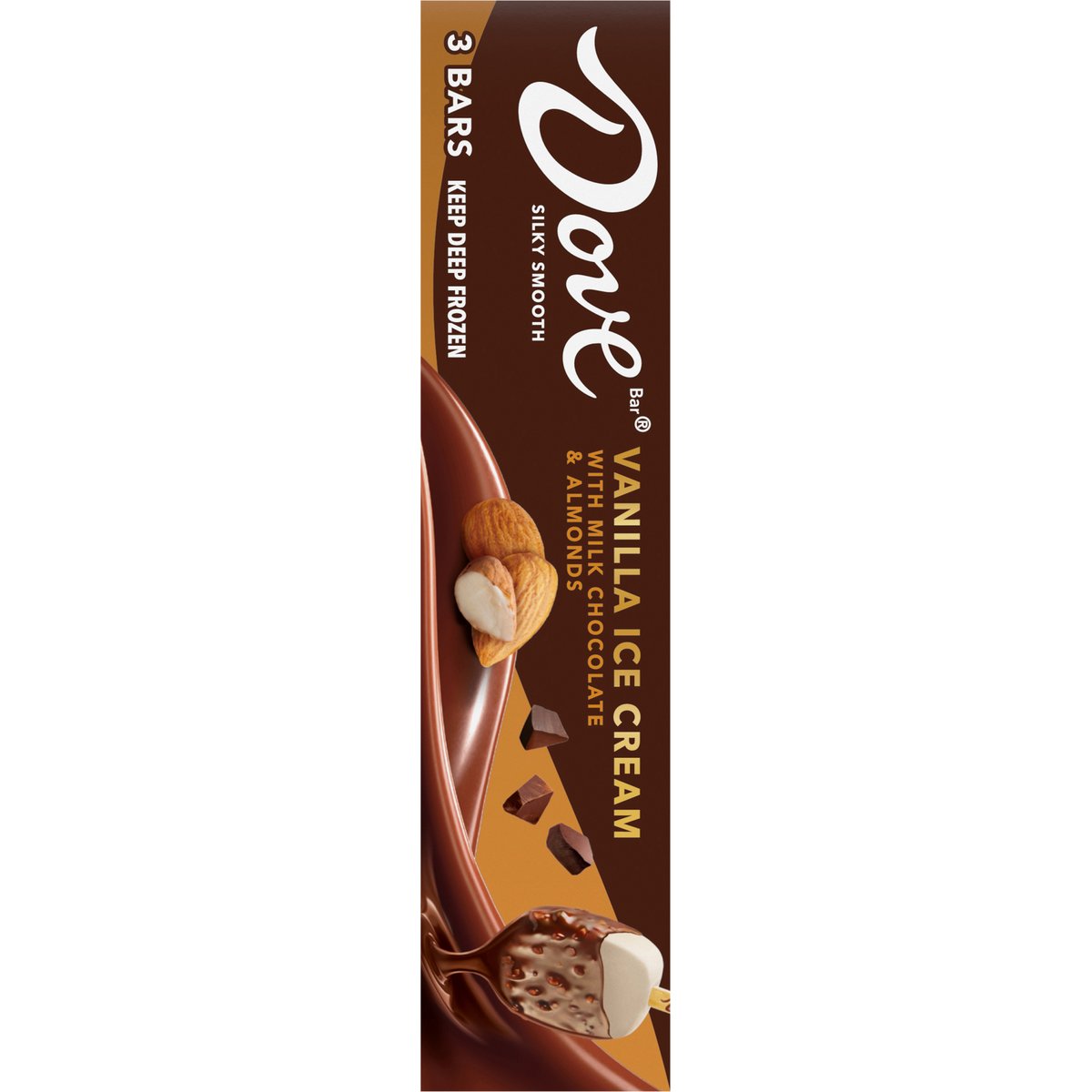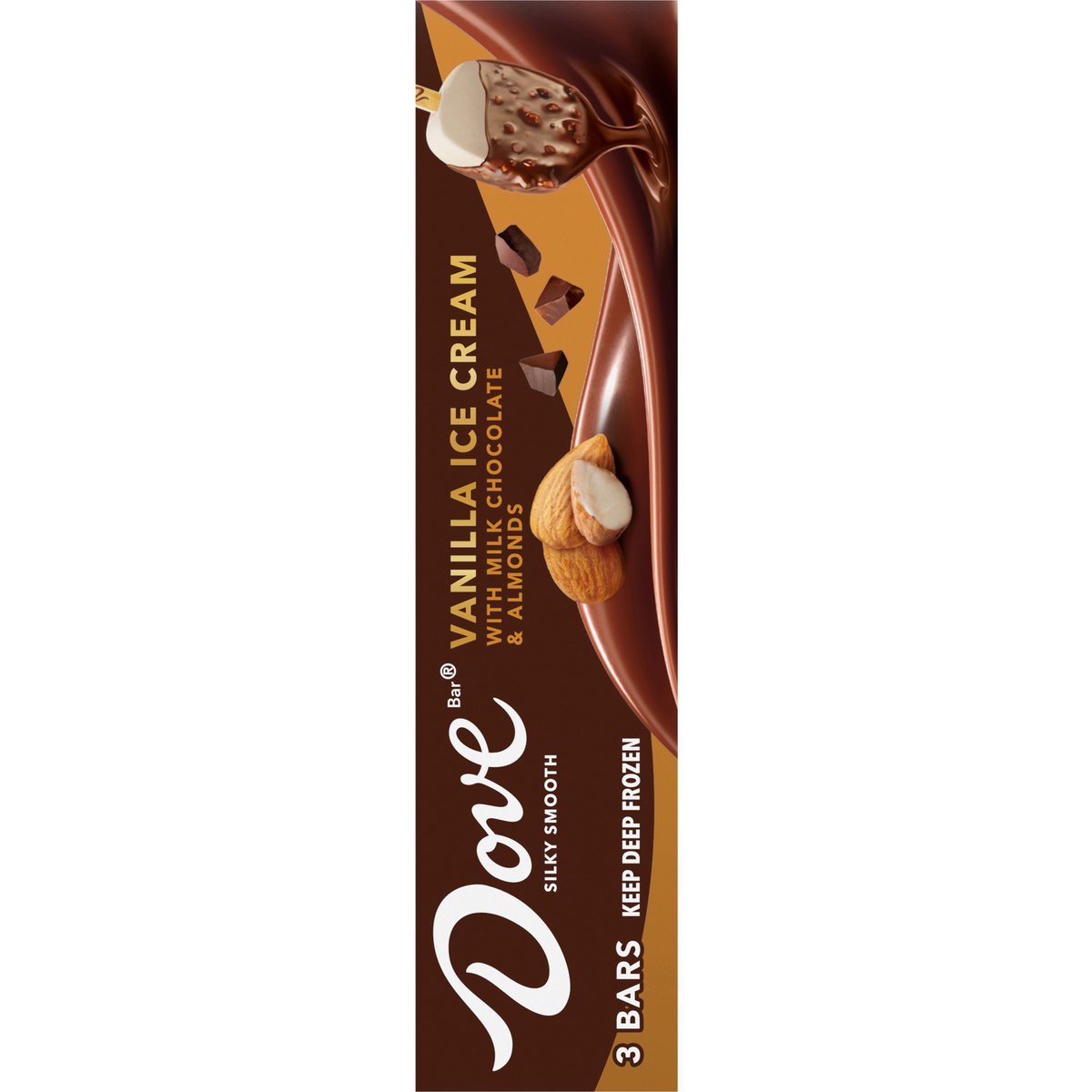Vanilla ice cream with milk chocolate & almonds. Vanilla ice cream dipped in a chocolate coating with almonds. Per Bar: 250 calories; 10 g sat fat (50% DV); 50 mg sodium (2% DV); 20 g total sugars. Contains bioengineered food ingredients. 100% real ice cream. Silky smooth. The Dove Ice Cream Story - What started with a chocolatier's son chasing an ice cream truck, has turned into more than 80 years of sweet indulgence! Greek American, Leo Stefanos, wanted to make an ice cream that his son could enjoy within his Chicago street corner store, Dove Candies & Ice Cream. There he perfected the hand-dipped Dovebar. Soon after, his inspiration and son, Mike, would take over the family business and help Dove ice cream become what it is today: the perfect combination of rich Dove chocolate and creamy ice cream, creating an unforgettable indulgent experience! Vanilla ice cream dipped in a chocolatey coating with almonds. Dove chocolate enhanced for a better ice cream experience. www.doveicecream.com. Twitter; Facebook; Youtube; Instagram. Our sustainability Journey: Learn more by scanning the code above. Open camera or QR reader & scan code. Supporting female vanilla farmers in Madagascar. Scan QR code to learn more. We value your questions or comments. Call 1-800-551-0895. Please save the empty carton. www.doveicecream.com. Supporting female vanilla farmers in Madagascar. Scan QR code to learn more. For more moments of pleasure, try: Vanilla & Chocolate ice cream made with silky smooth Dove Milk Chocolate; Vanilla ice cream made with silky smooth Dove Milk Chocolate. Recyclable.