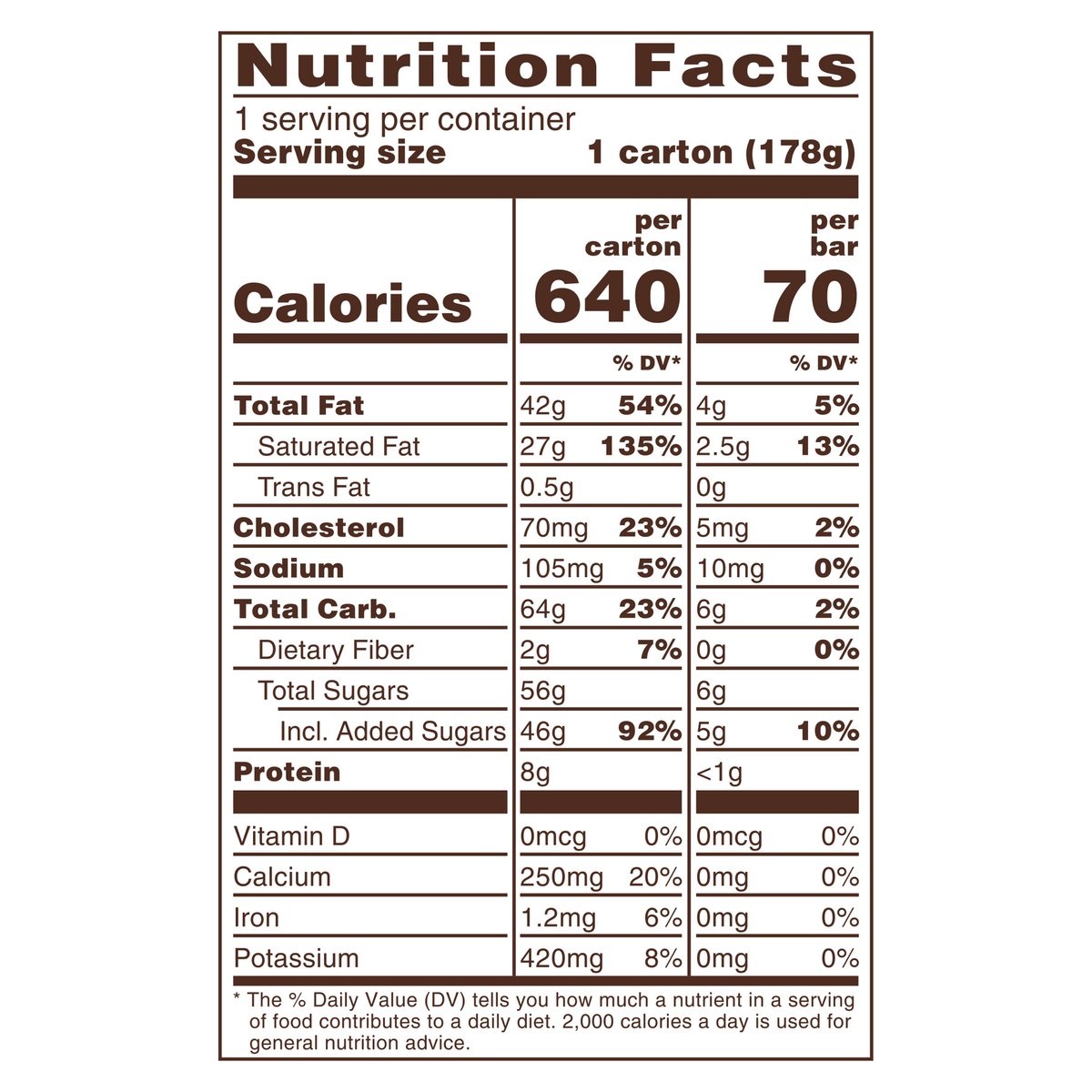 Per Bar: 70 Calories; 2.5 g sat fat (13% DV); 10 mg sodium (0% DV); 6 total sugars. 70 calories per bar. Contains bioengineered food ingredients. An inspirational message on every wrapper. Individually wrapped. The Dove Ice Cream Story.. What started with a chocolatier's son chasing a ice cream truck has turned into more than 80 years of sweet indulgence! Greek American, Leo Stefanos, wanted to make an ice cream that his son could enjoy within his Chicago street corner store, Dove Candies & Ice Cream. There he perfected the hand-dipped Dovebar. Soon after, his inspiration and son, Mike, would take over the family business and help Dove Ice Cream become what it is today: the perfect combination of rich Dove Chocolate and creamy ice cream, creating an unforgettable indulgent experience! Discover a Dove minis inspirational message. www.doveicecream.com. Twitter. Facebook. YouTube. Instagram. Learn more by scanning the code above. Open camera or or reader & scan code. Supporting female vanilla farmers in Madagascar scan QR code to learn more. We value your questions or comments. Call 1-800-551-0895. Please save the empty carton. www.doveicecream.com. For more moments of pleasure, try... Vanilla & Chocolate ice cream made with silky smooth Dove Milk Chocolate; Vanilla ice cream made with silky smooth Dove Milk Chocolate. Recyclable.