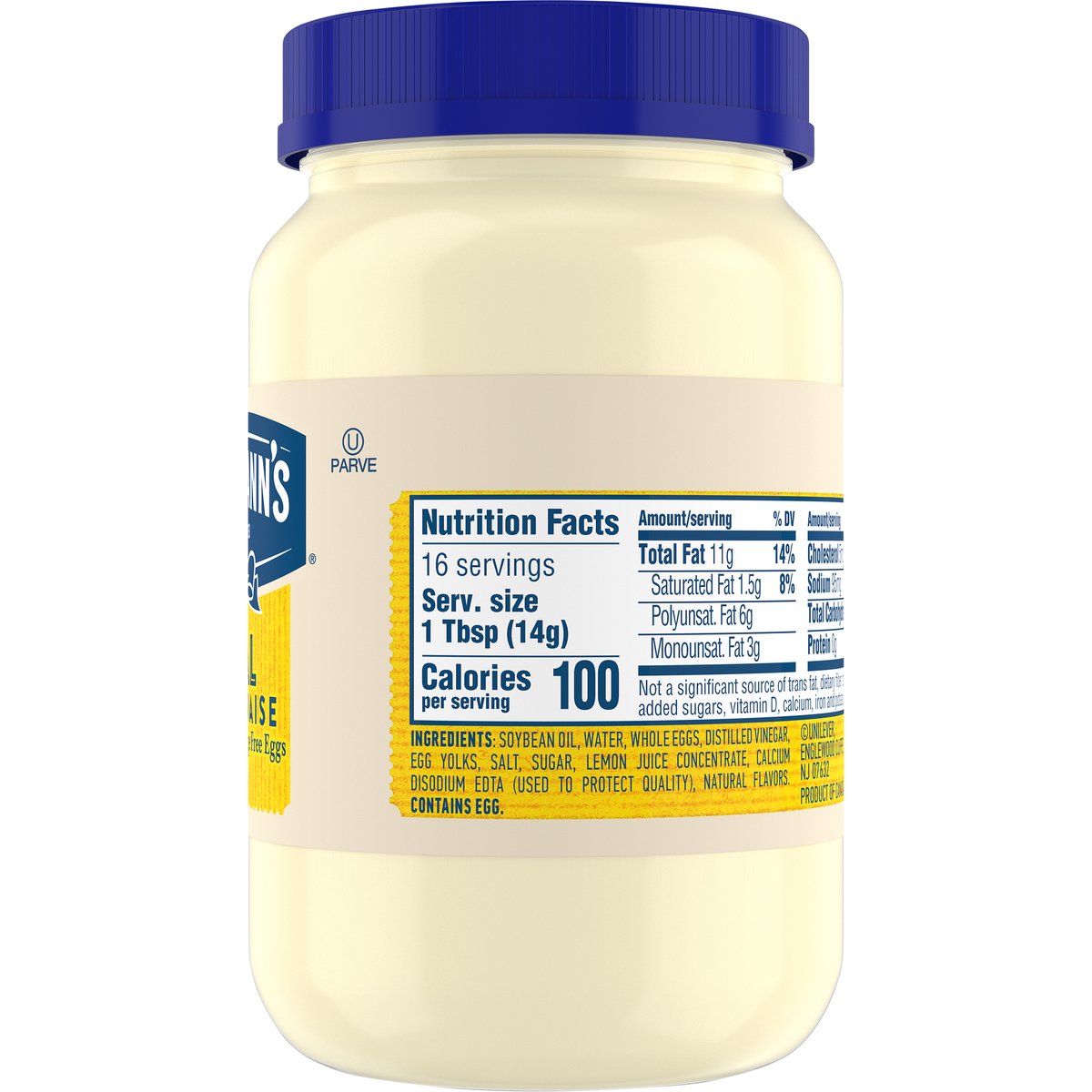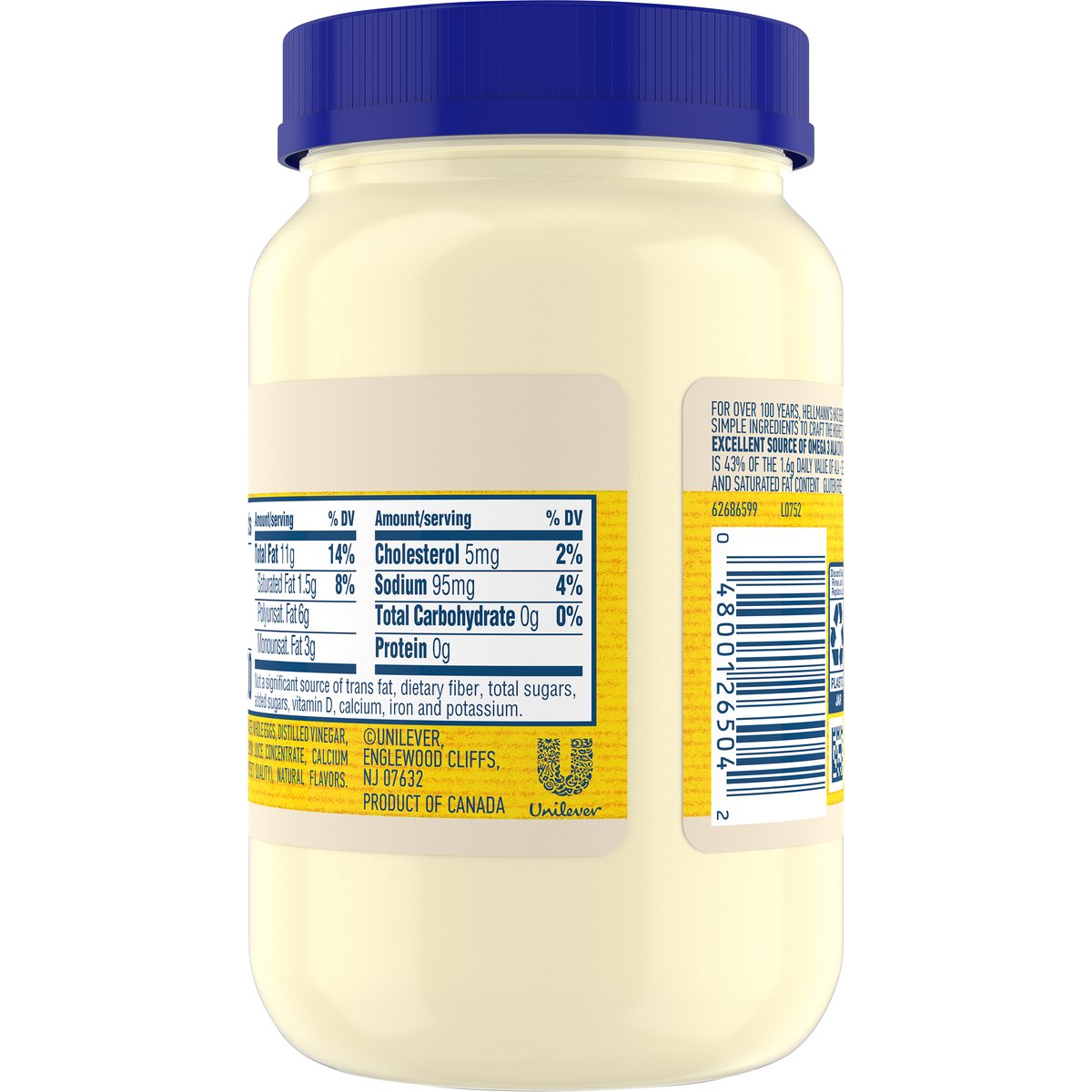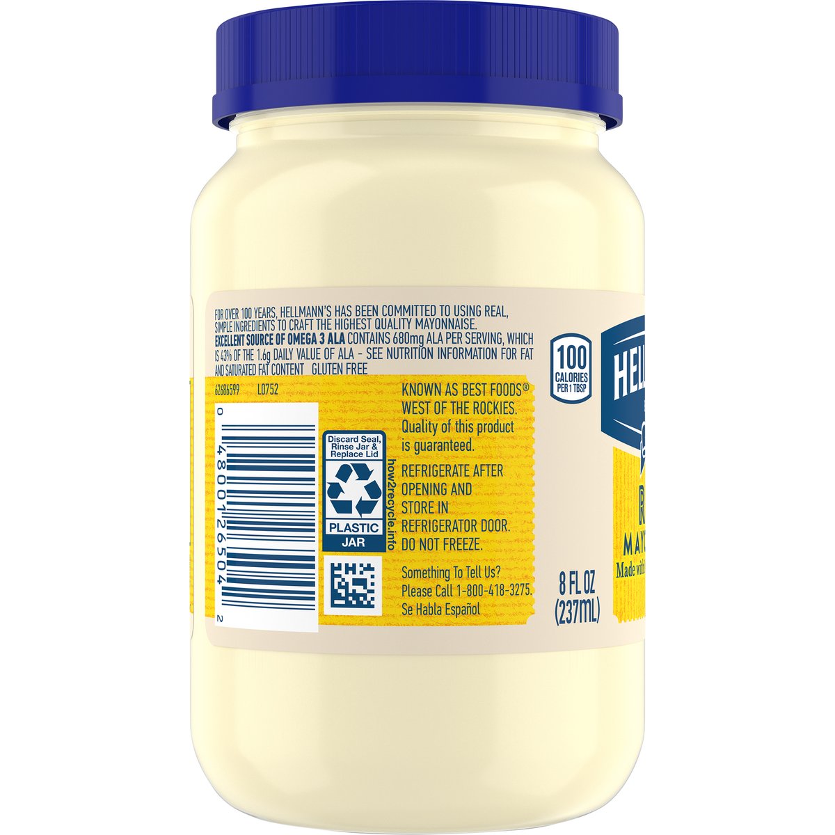 100 calories per 1 tbsp. Gluten free. Excellent source of Omega 3 ALA. Contains 680 mg ALA per serving, which is 43% of the 1.6 g daily value of ALA. - See nutrition information for fat and saturated fat content. Est. 1913. For over 100 years, Hellmann's has been committed to used using real, simple ingredients to craft the highest quality mayonnaise. Known as best foods West of the Rockies. Quality of this product is guaranteed. how2recycle.info. Something to tell us? Please call 1-800-418-3275. Product of Canada.
