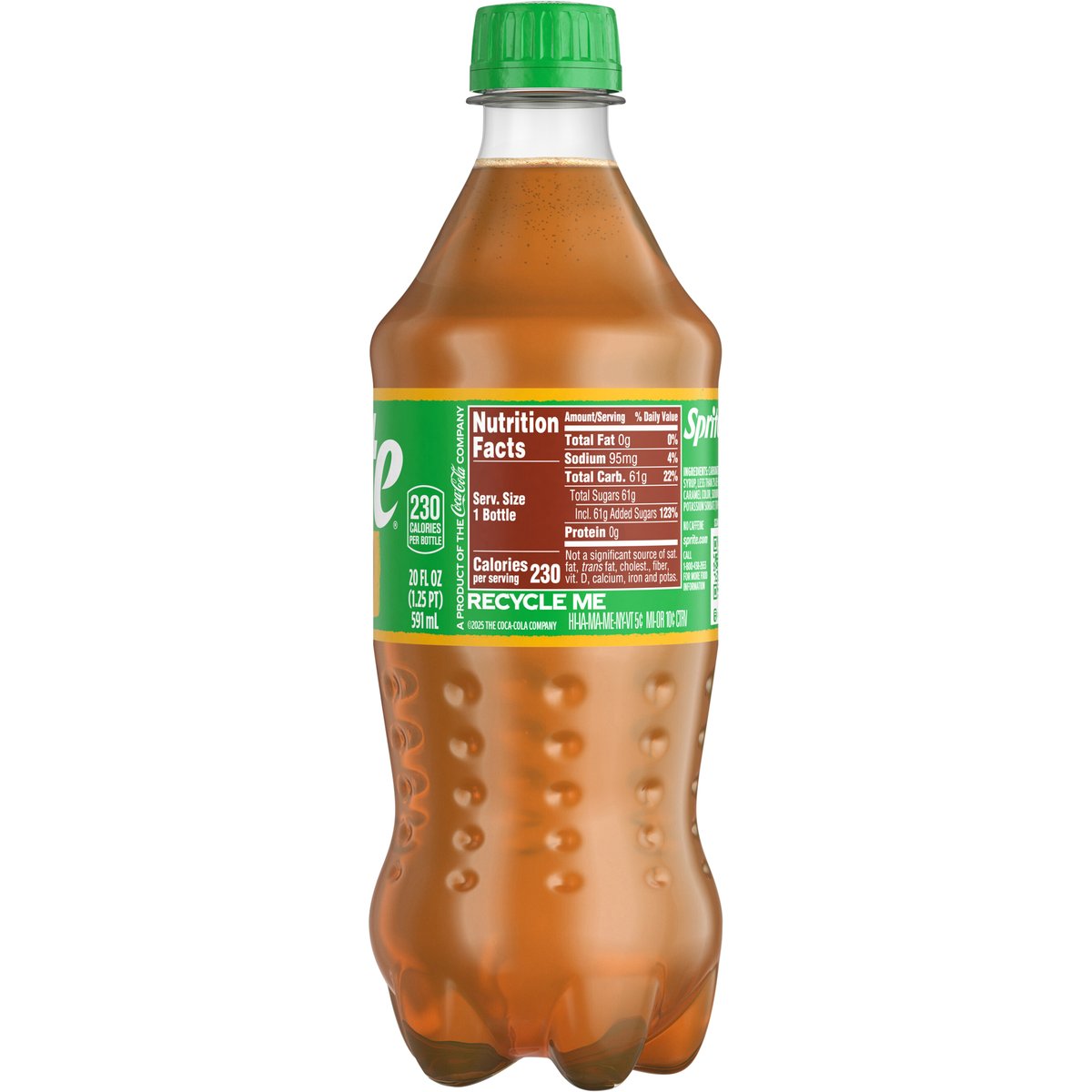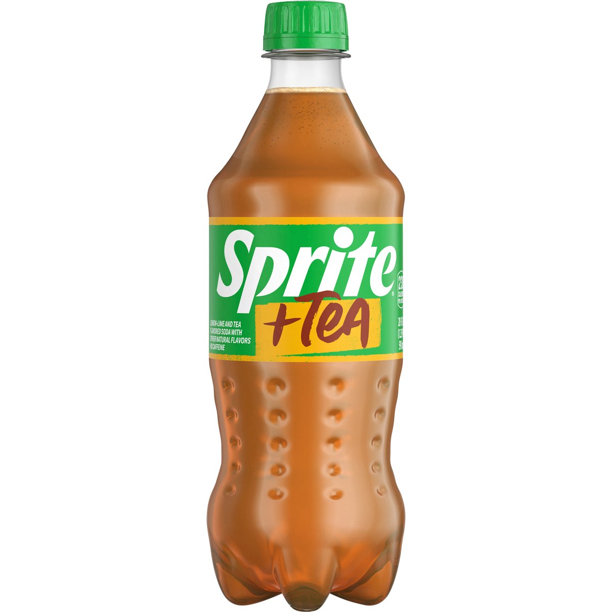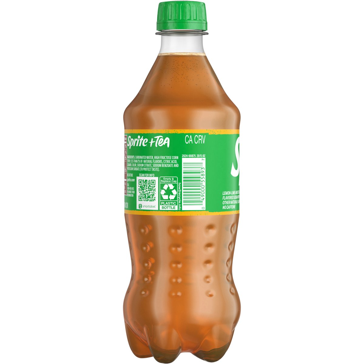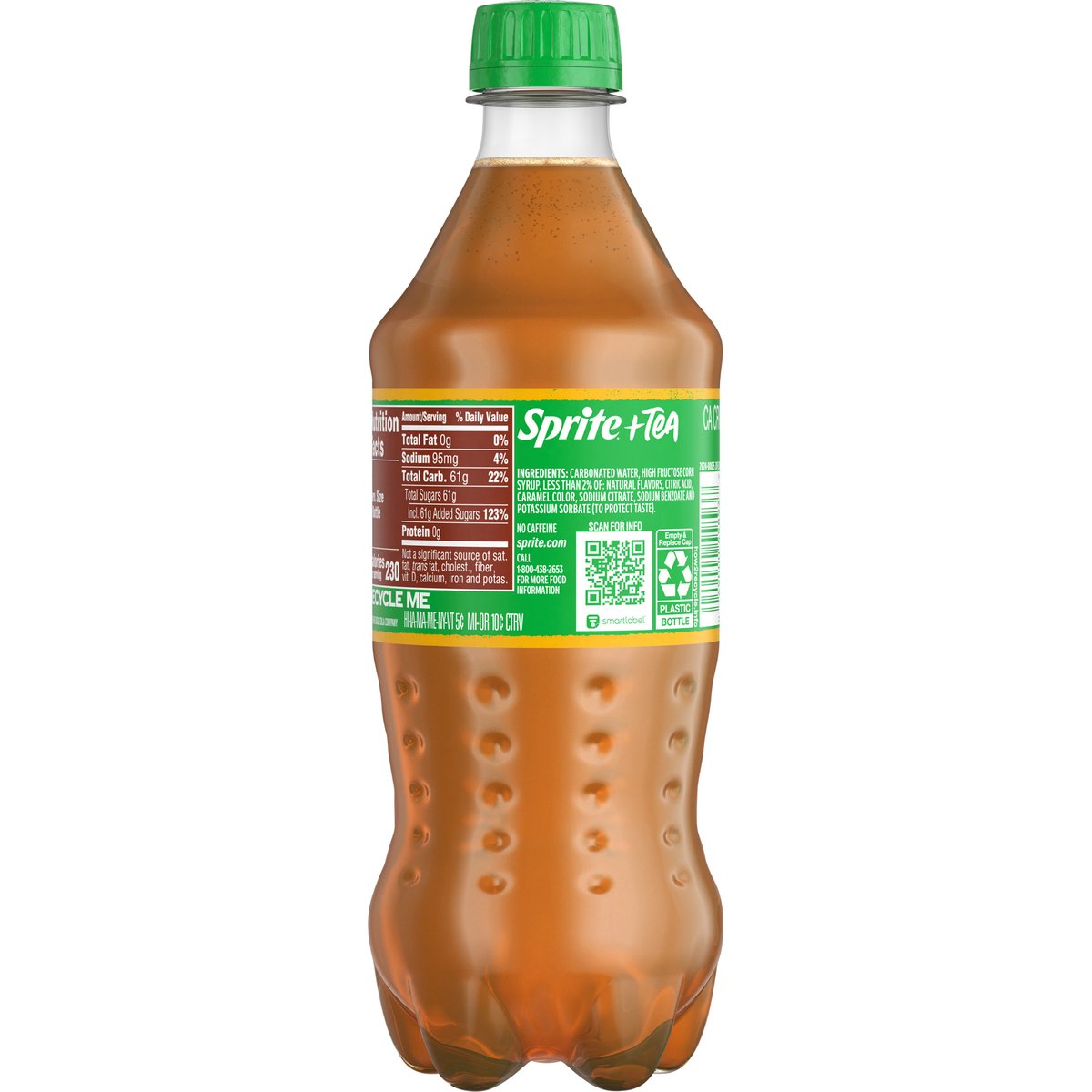 Lemon-lime and tea flavored soda with other natural flavors. 230 calories per bottle. No caffeine. Sprite + tea. A product of the Coca Cola company. Bottled under the authority of the coca-cola company. sprite.com. how2recycle.info. SmartLabel: Scan for info. Call 1-800-438-2653 for more food information. Recycle bottle with cap on. Recycle me.