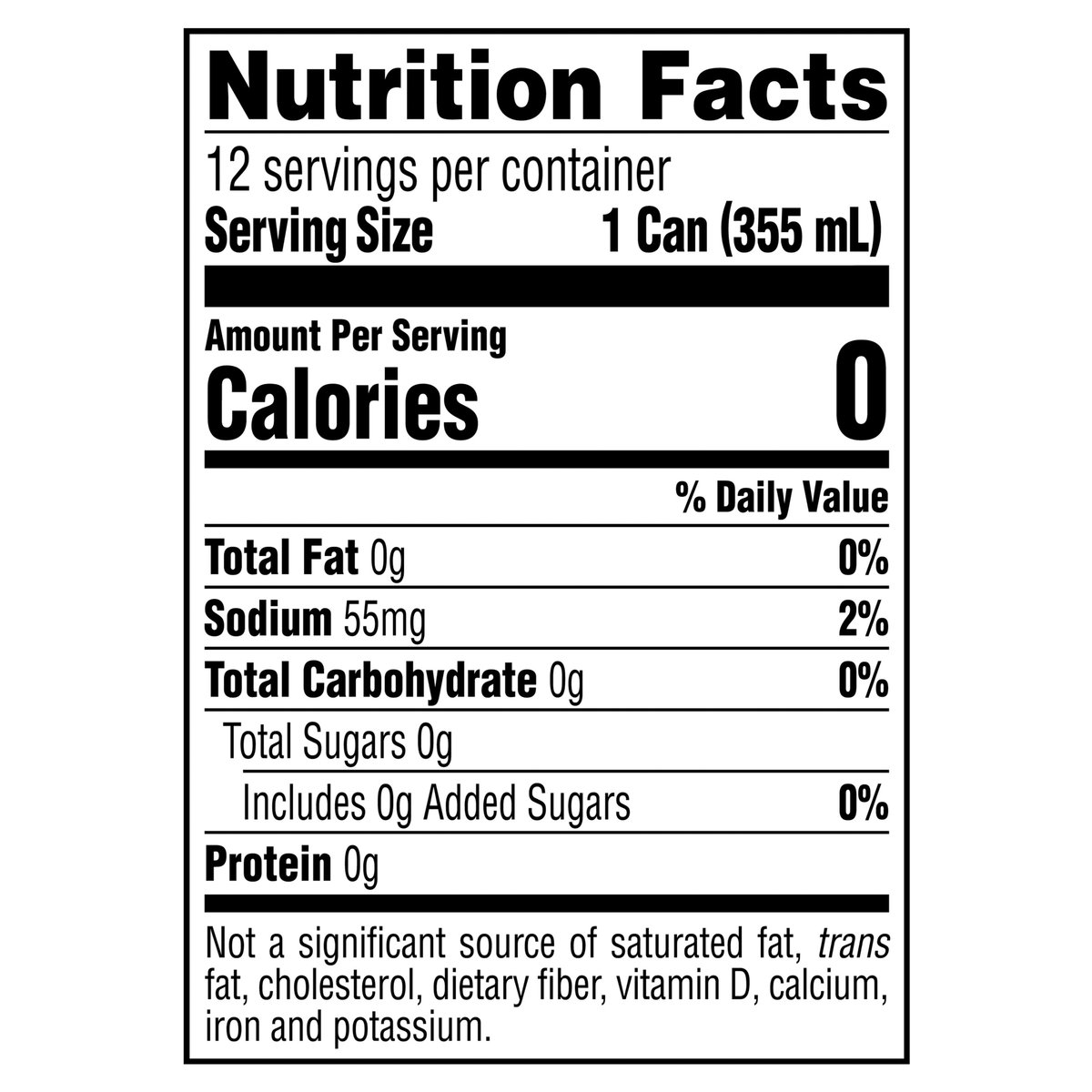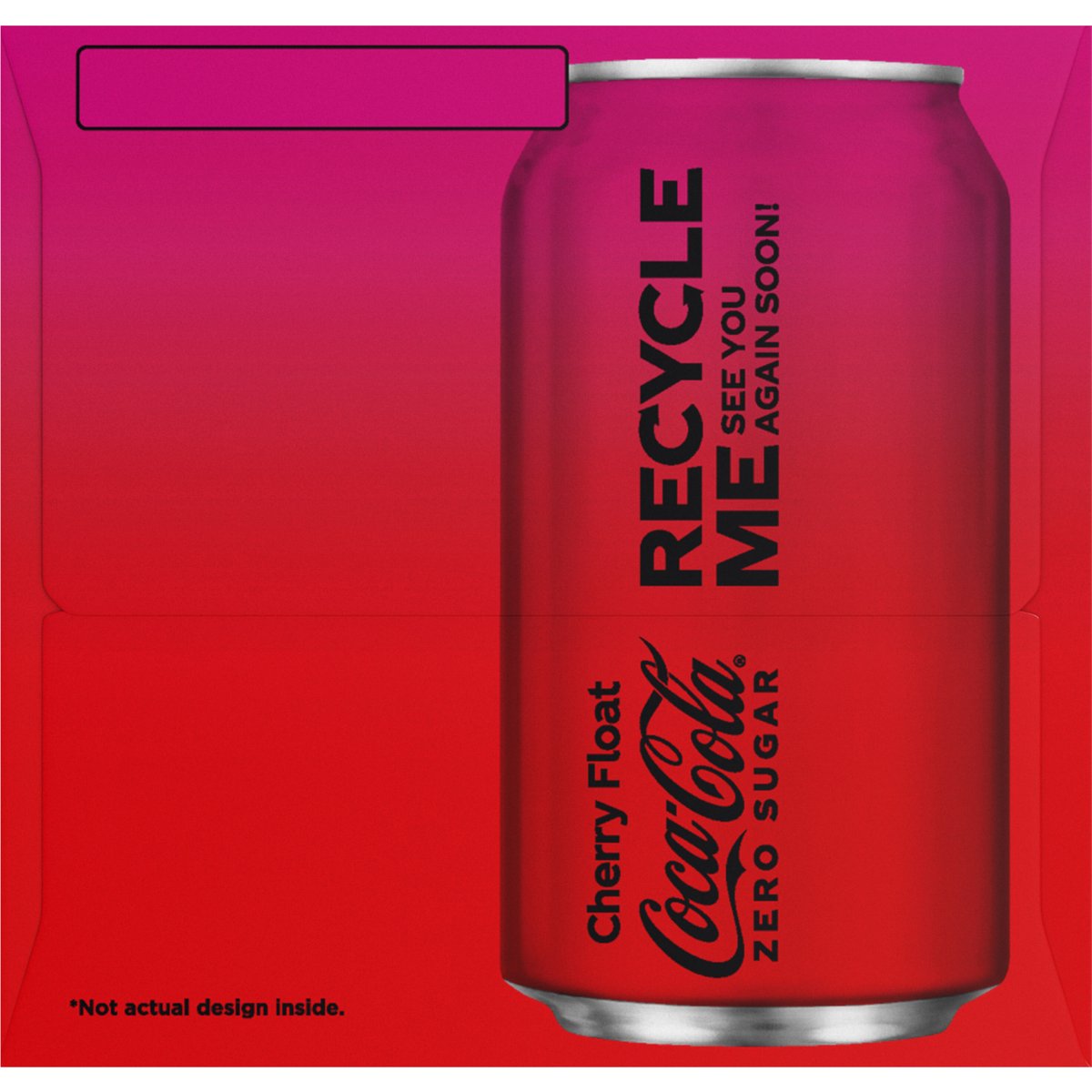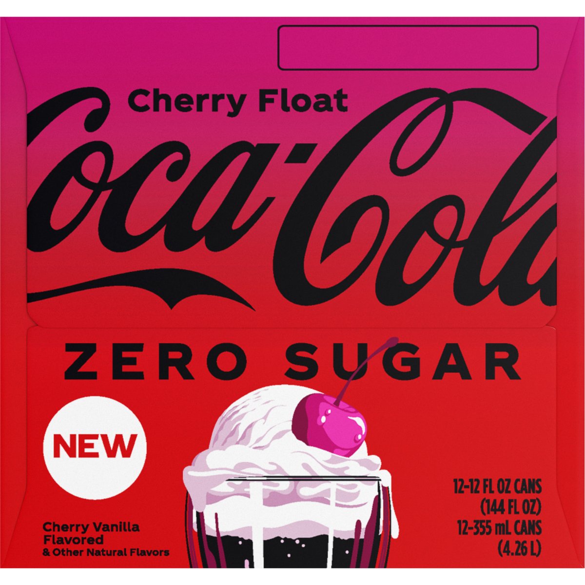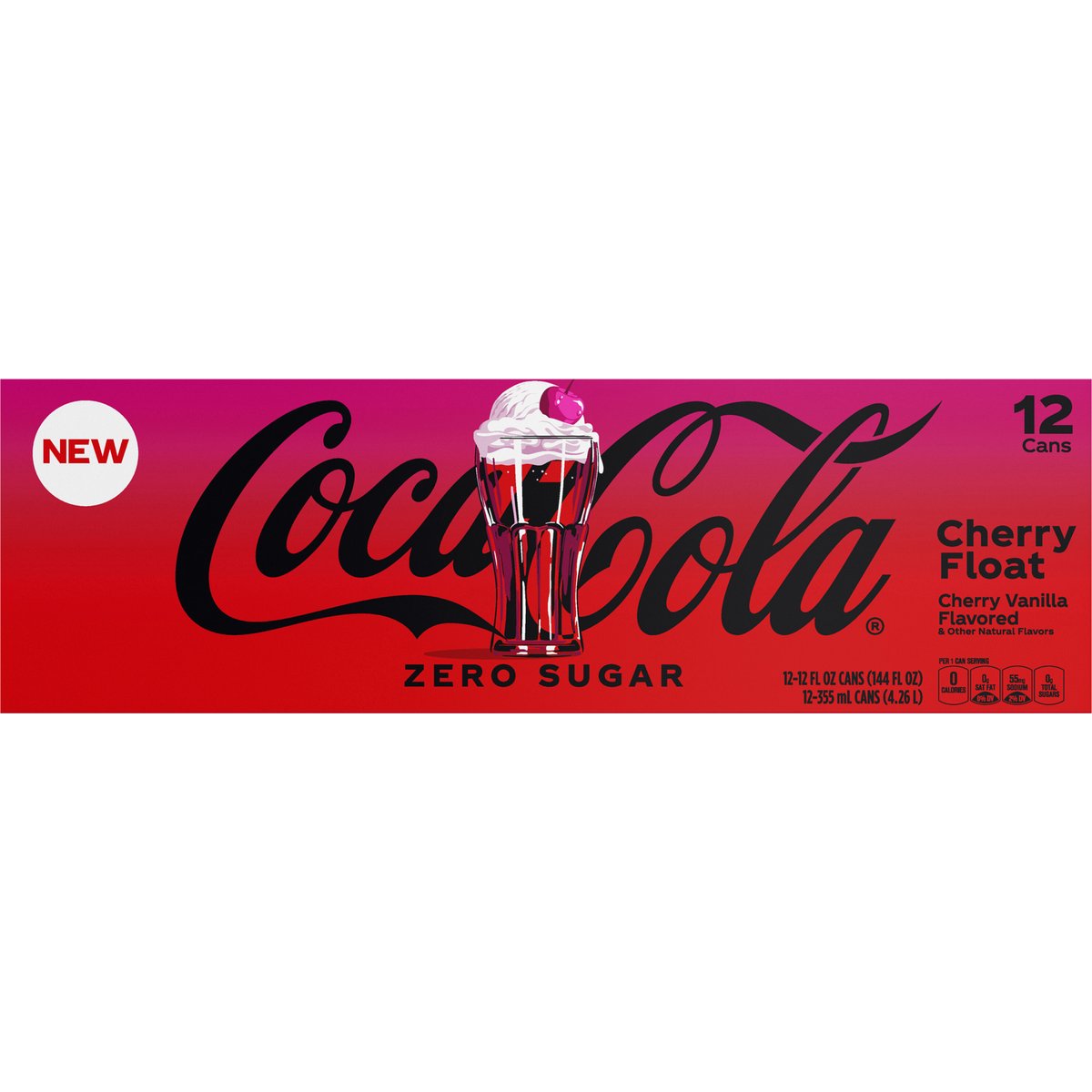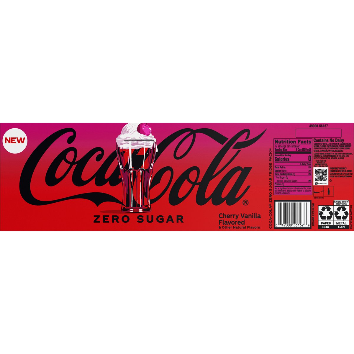 Cherry vanilla flavored & other natural flavors. Per 1 Can Serving: 0 calories; 0 g sat fat (0% DV); 55 mg sodium (2% DV); 0 g total sugars. Zero sugar. Contains no dairy. Caffeine Content: 34 mg/12 fl oz. New. coke.com. how2recycle.info. SmartLabel: Scan for more food information or call 1-800-438-2653. Recycle me. See you again soon!