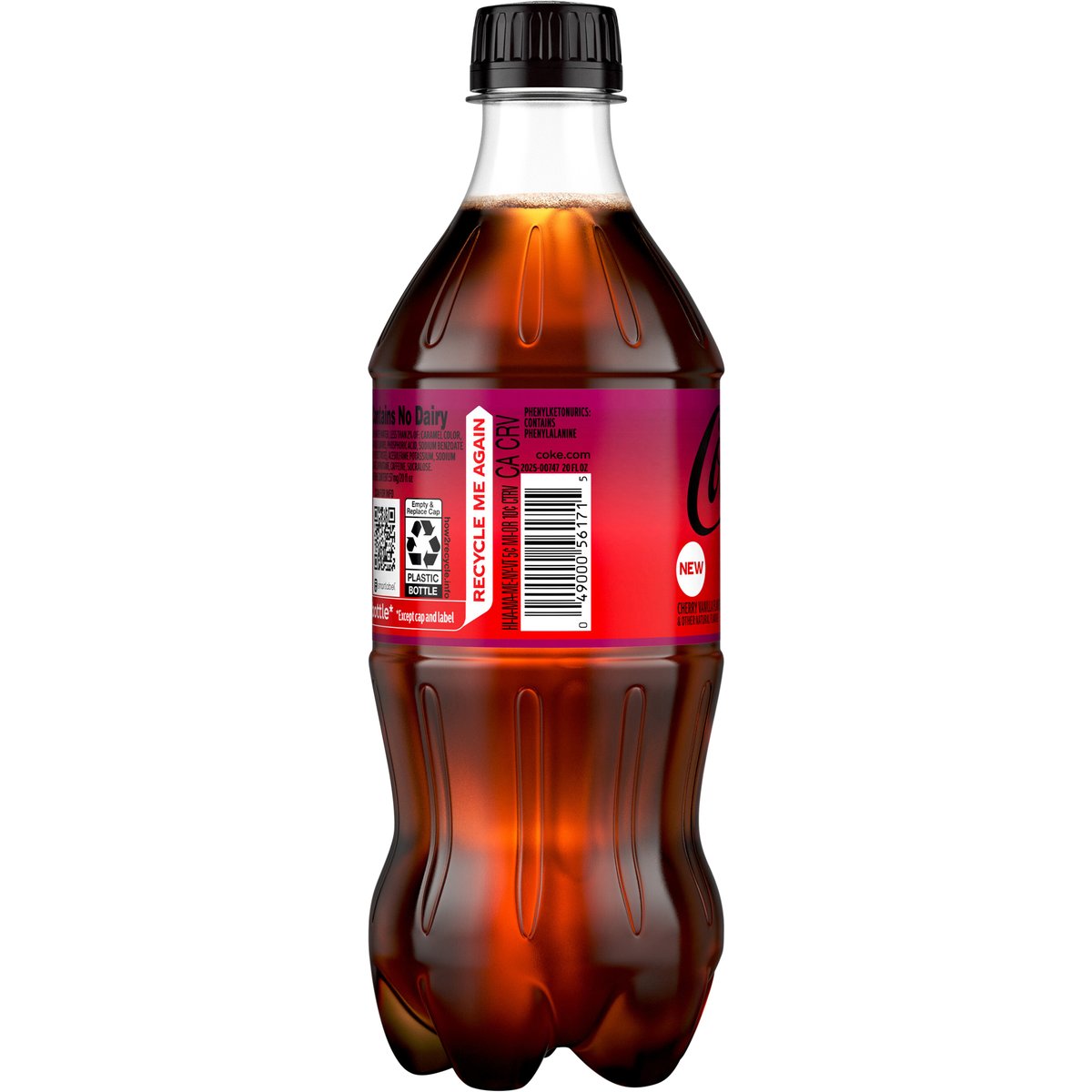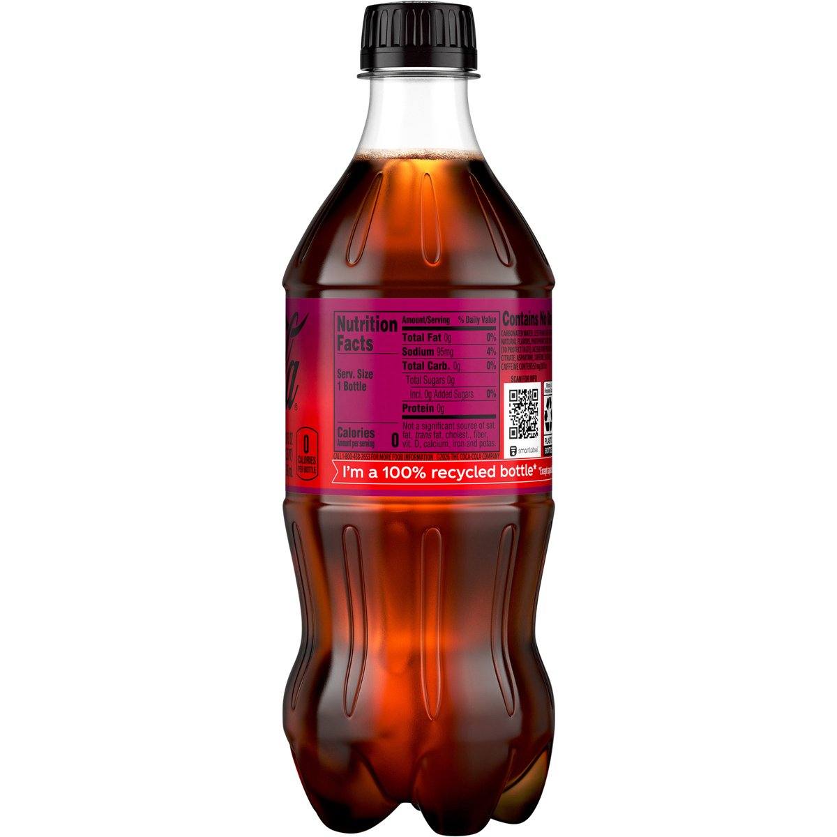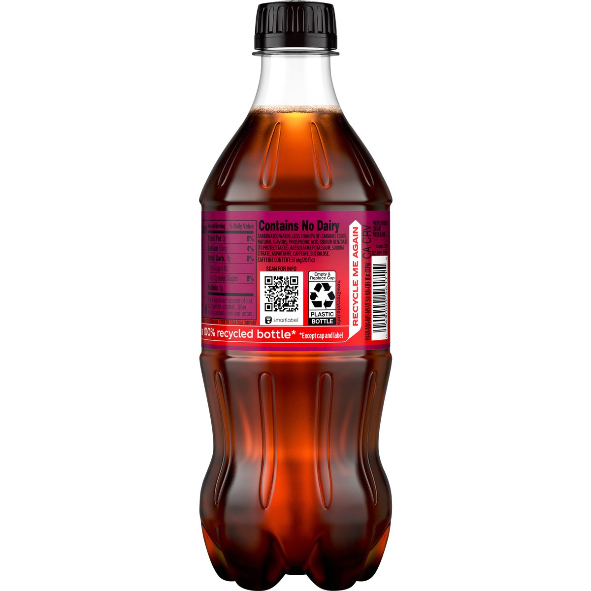 Cherry vanilla flavored & other natural flavors. 0 calories per bottle. Zero sugar. Caffeine Content: 57 mg/20 fl oz. New. Contains no dairy. coke.com. how2recycle.info. Smartlabel: Scan for info. Call 1-800-438-2653 for more food information. 1'm a 100% recycled bottle*. * Except cap and label. Recycle bottle with cap on. I'm a 100% recycled bottle*. Recycle me again. *Except cap and label.