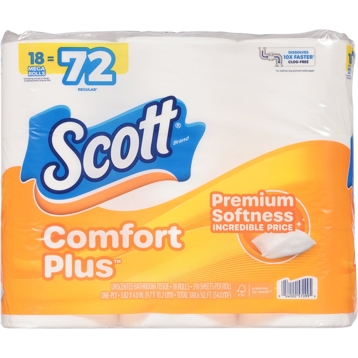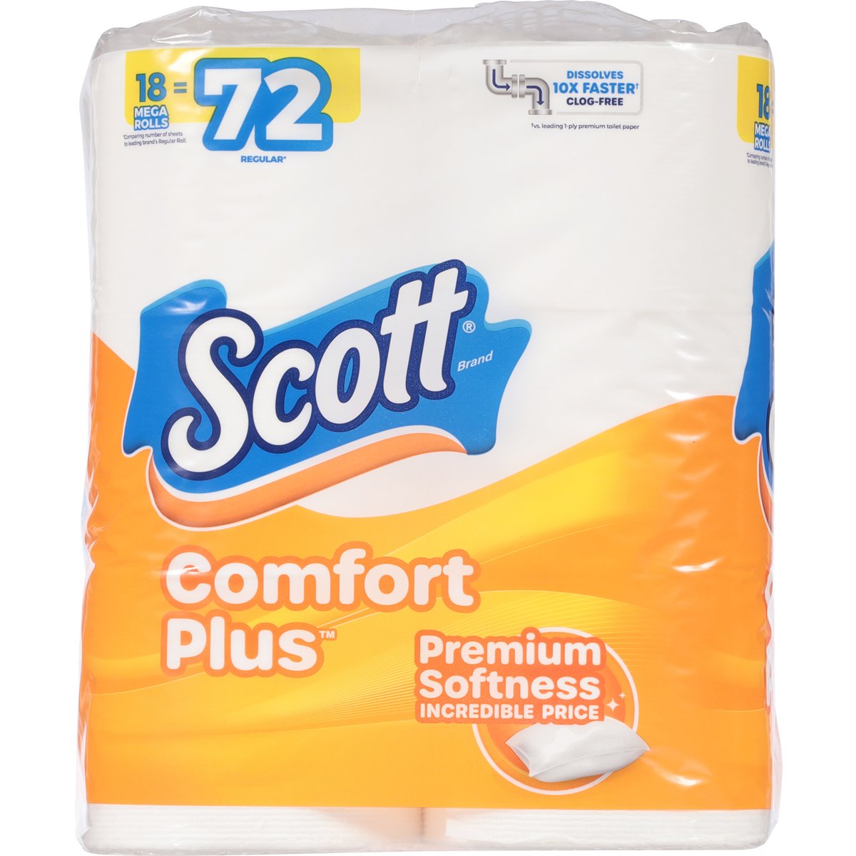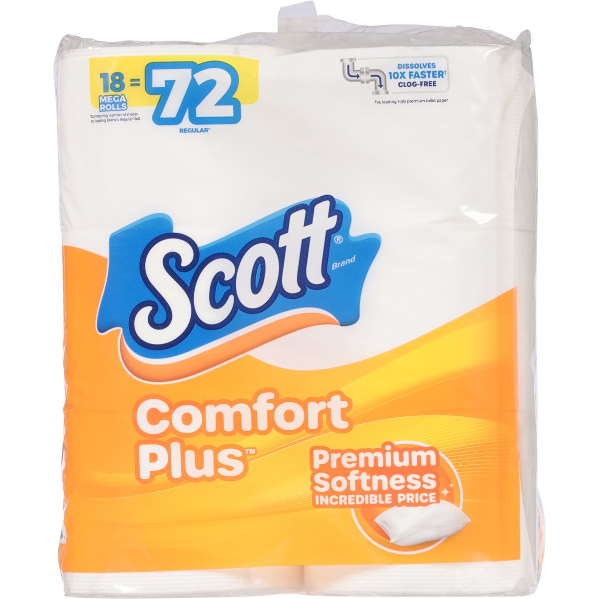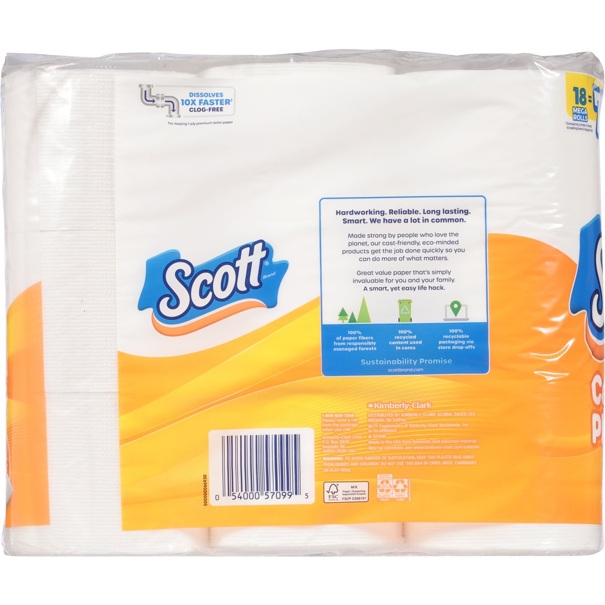 3.82 x 4.0 in. (9.7 x 10.2 cm) - total 588.6 sq. ft. (54.0 sq m). 18 mega rolls = 72 regular*. Premium softness incredible price. Dissolves10x faster (a). Clog-free. Hardworking. Reliable. Long lasting. Smart. We have a lot in common. Made strong by people who love the planet, our cost-friendly, eco-minded products get the job done quickly so you can do more of what matters. Great value paper that's simply invaluable for you and your family. A smart, yet easy life hack. *Comparing number of sheets to leading brand's Regular Roll. (a) vs. leading 1-ply premium toilet paper. scottbrand.com. how2recycle.info. 1-800-835-7268. Please have a roll from the package when you call. Kimberly-Clark Corp. P.O. Box 2020 Neenah, WI 54957-2020 USA. FSC. Protecting forest. Mix - Paper. Supporting responsible forestry. www.fsc.org. 100% of paper fibers from responsibly managed forests. 100% recycled content used in cores. 100% recyclable packaging via store drop-offs. Sustainability promise. scottbrand.com. Made in the USA from domestic and imported material.