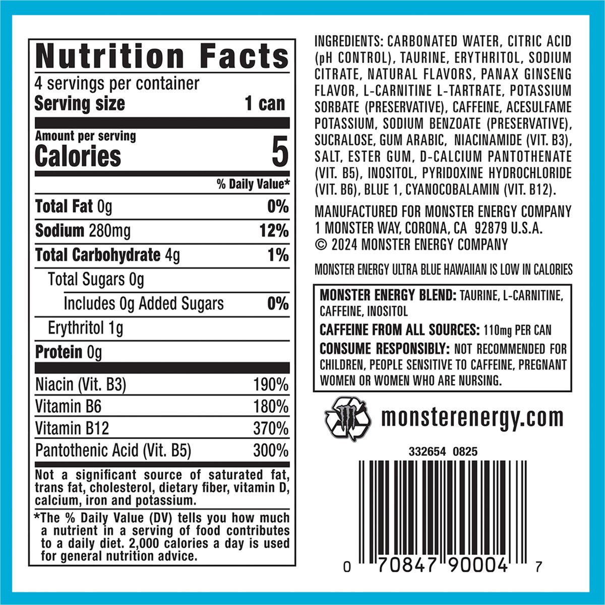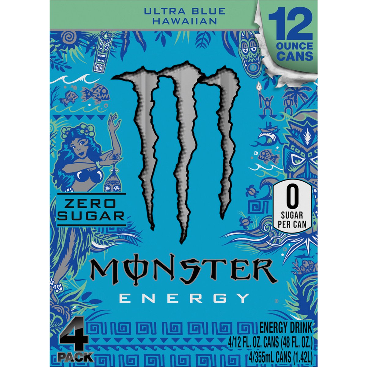 0 sugar per can. Zero sugar. Monster Energy Ultra Blue Hawaiian is low in calories. monsterenergy.com.