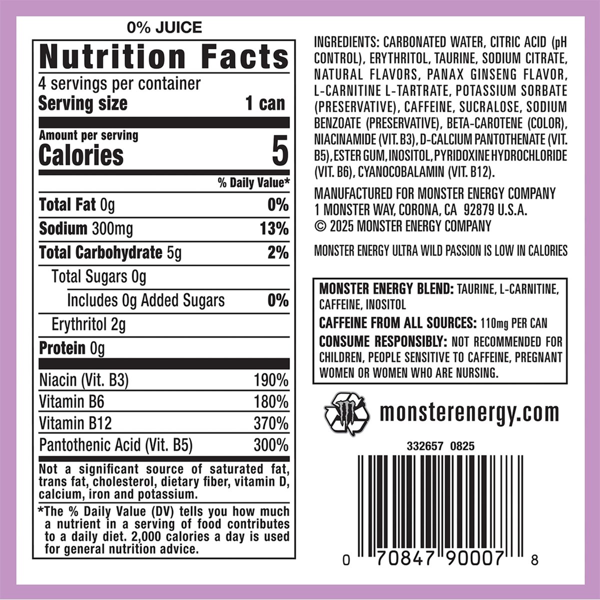 0 sugar per can. Zero sugar. Monster Energy Ultra Wild Passion is low in calories. monsterenergy.com.