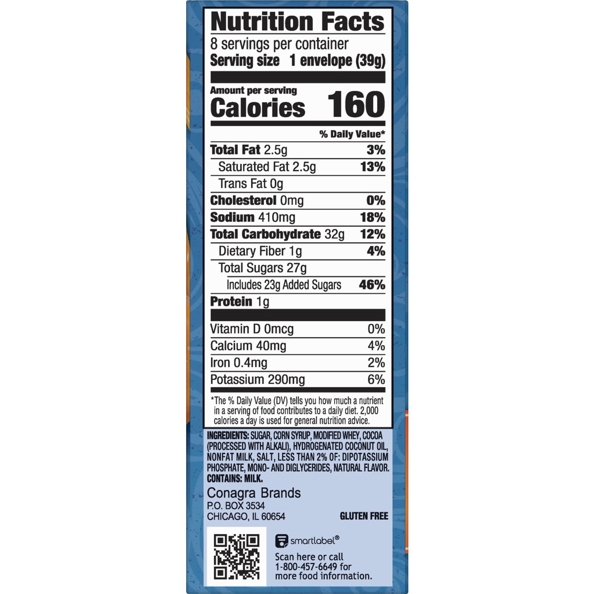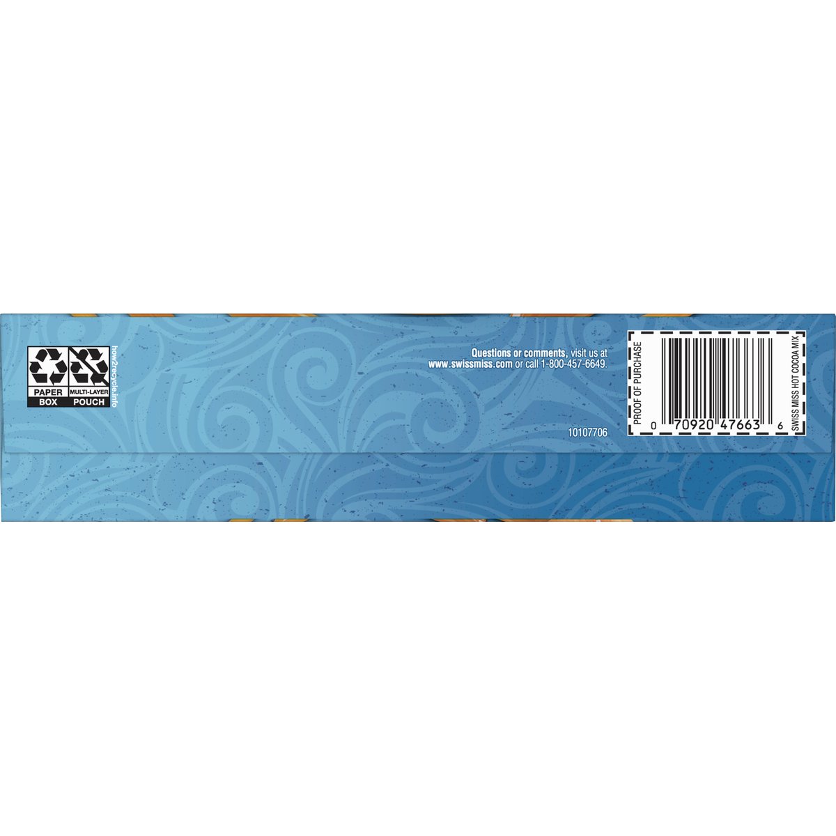 Flavored with other natural flavors. No artificial flavors. Per 1 Envelope: 160 calories; 2.5 g sat fat (13% DV); 410 mg sodium (18% DV); 27 g total sugars. Gluten free. 99.9% caffeine free. New. No Artificial: Sweeteners, preservatives, colors. www.swissmiss.com. how2recycle.info. SmartLabel: Scan or call 1-800-457-6649 for more food information. Questions or comments? visit us at www.swissmiss.com or call 1-800-457-6649.
