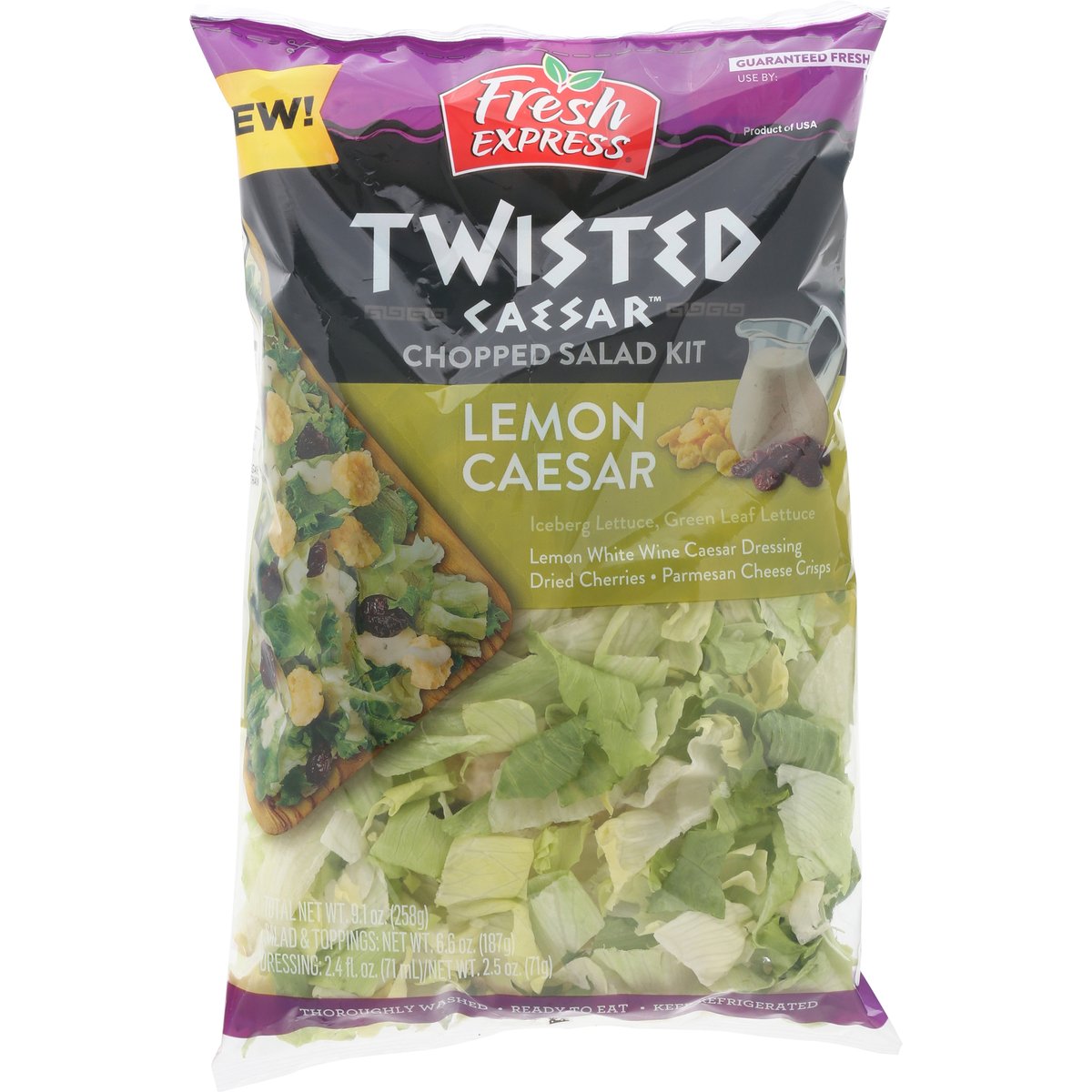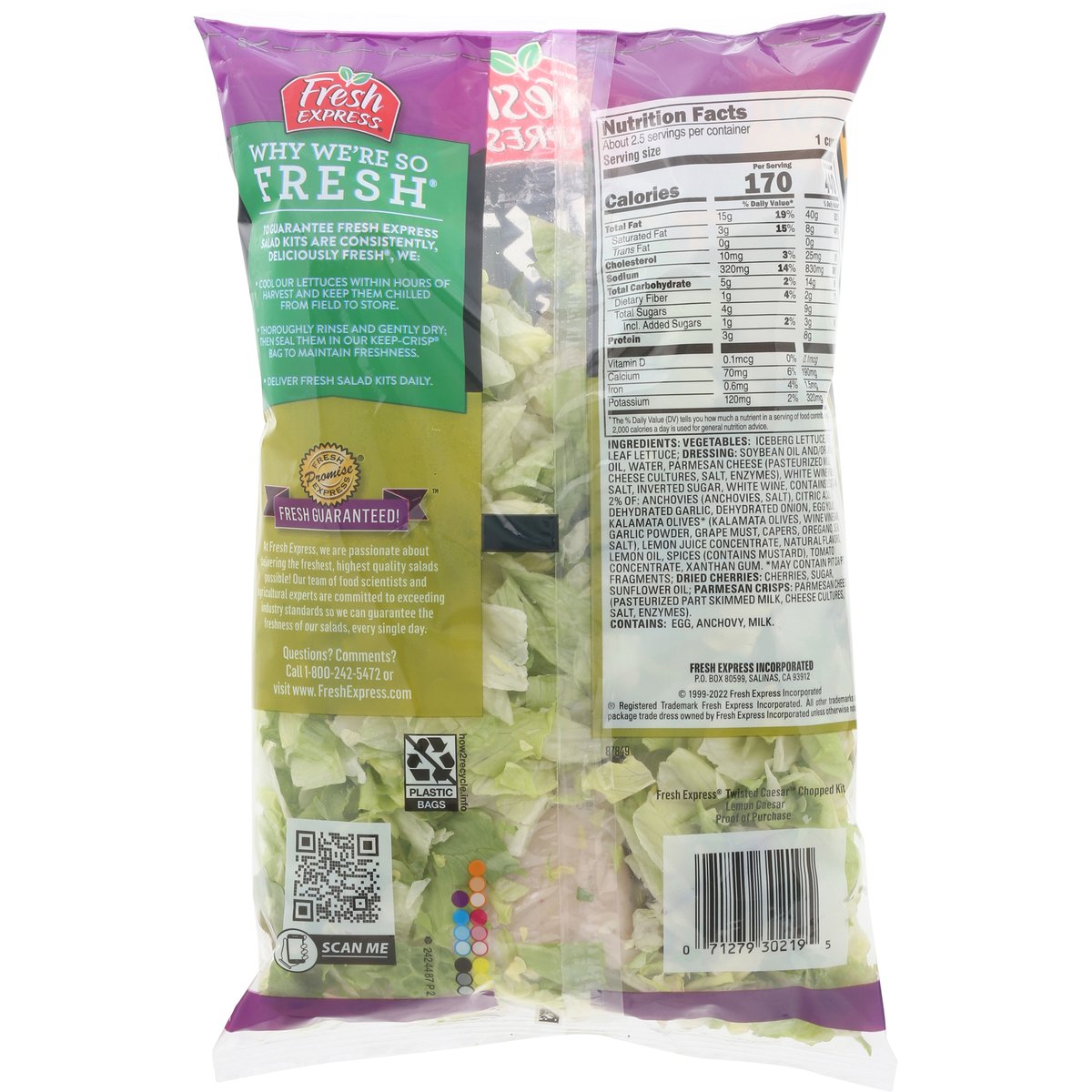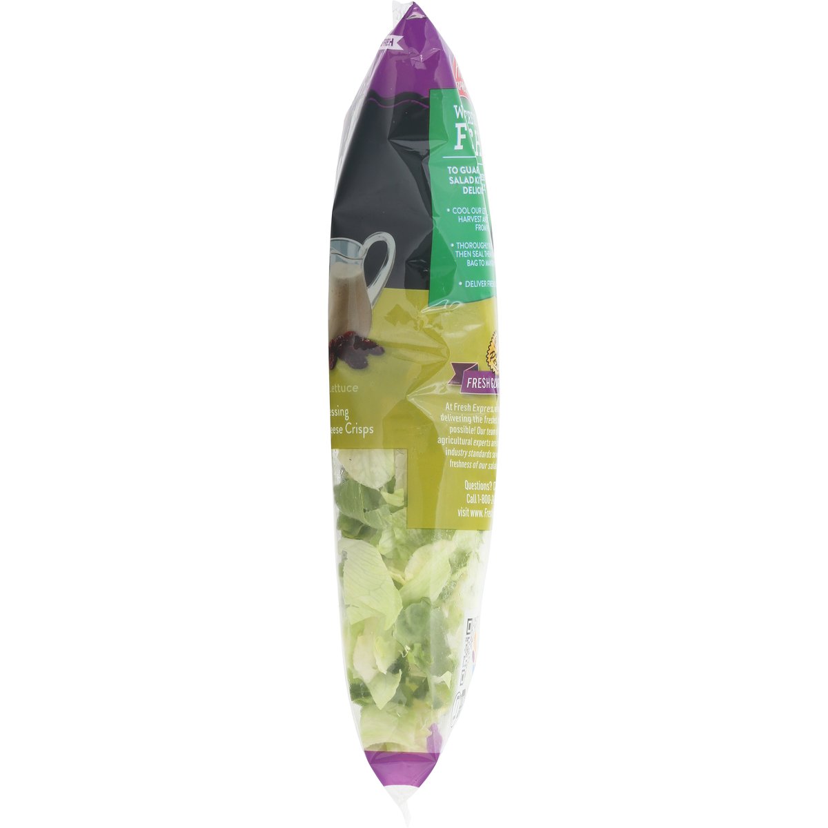 Iceberg lettuce, green leaf lettuce. Lemon white wine caesar dressing. Dried cherries. Parmesan cheese crisps. New! Thoroughly washed. Ready to eat. Why we're so fresh. To guarantee fresh express salad kits are consistently, deliciously fresh, we: Cool our lettuces within hours of harvest and keep them chilled from field to store. Thoroughly rinse and gently dry; then seal them in our keep-crisp bag to maintain freshness. Deliver fresh salad kits daily. Guaranteed fresh. Fresh Express Promise: Fresh guaranteed! At Fresh Express, we are passionate about delivering the freshest, highest quality salads possible! Our team of food scientist and agricultural experts are committed to exceeding industry standards so we can guarantee the freshness of our salads, every single day. www.FreshExpress.com. how2recycle.info. Scan me. Questions? Comments? Call 1-800-242-5472 or visit www.FreshExpress.com. Product of USA.