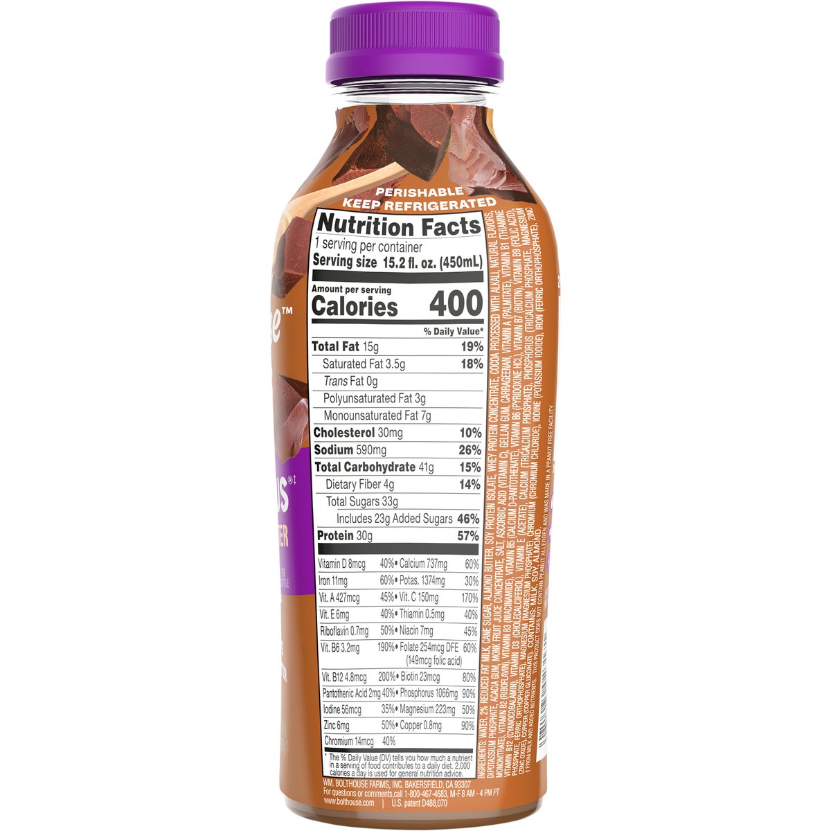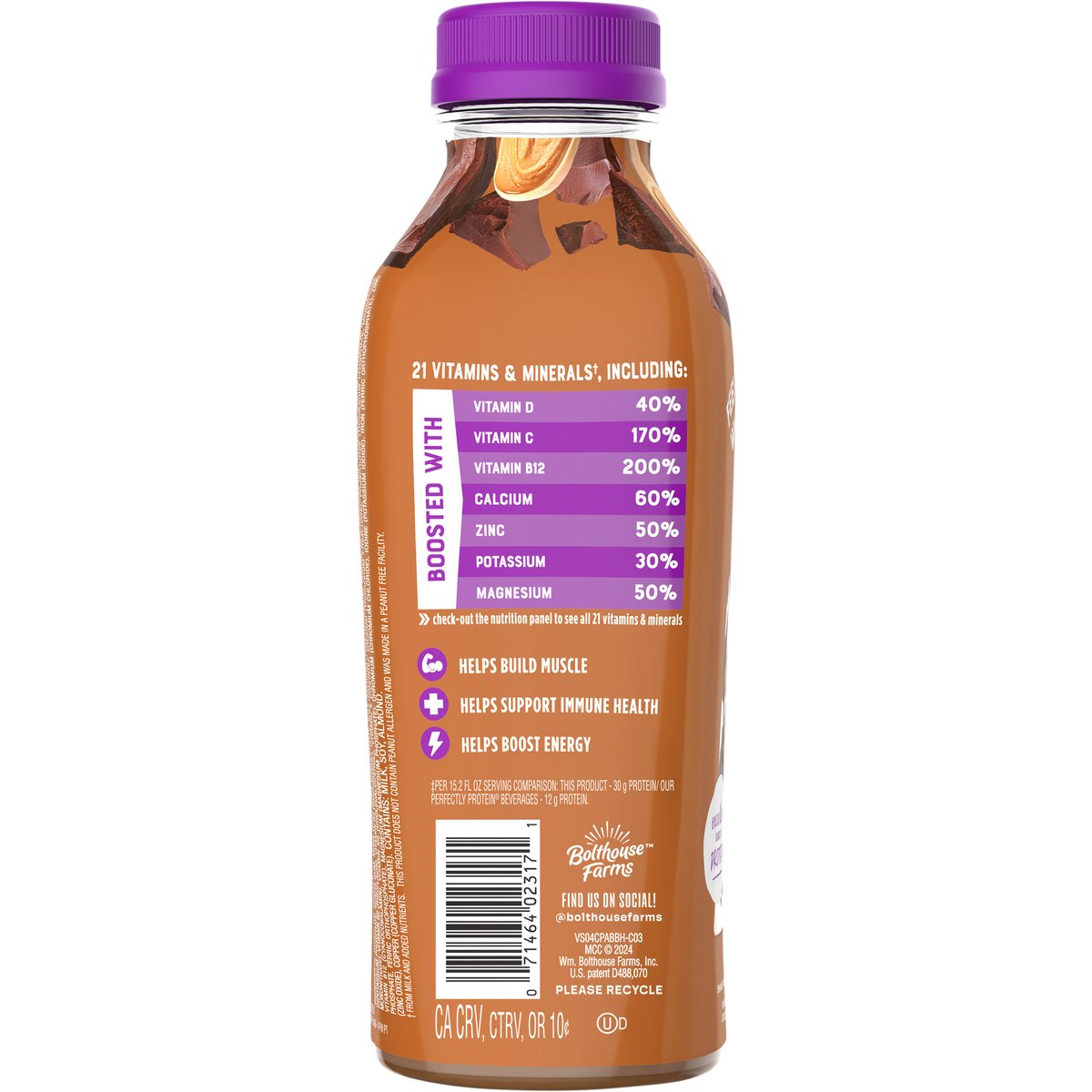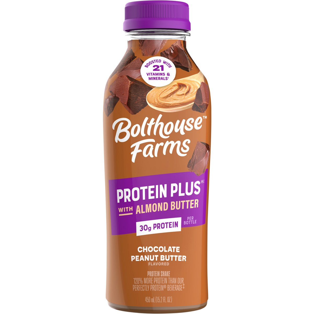 30 g protein per bottle. Protein plus (a). 21 vitamins and minerals (b). 120% more protein than our perfectly protein beverage (a). (a) Per 15.2 fl oz serving comparison. This product - 30 g protein/our perfectly protein beverages - 13 g protein. (b) From milk and added nutrients. 100 years of farming have made us big believers in cultivating more so we fill every bottle with loads of thoughtful ingredients carefully crafted into delicious blend that taste as good as they feel. Hearty almond butter peanut butter flavor & rich chocolate come together in this satisfying blend we call that the complete package. Full of swoon-worthy indulgence that fuels you. Flash pasteurized and cold-filled for quality. No artificial preservatives or colors. Find us on social @bolthousefarms. For questions or comments, call 1-800-467-4683, M-F 8 AM - 4 PM PT. Please recycle.