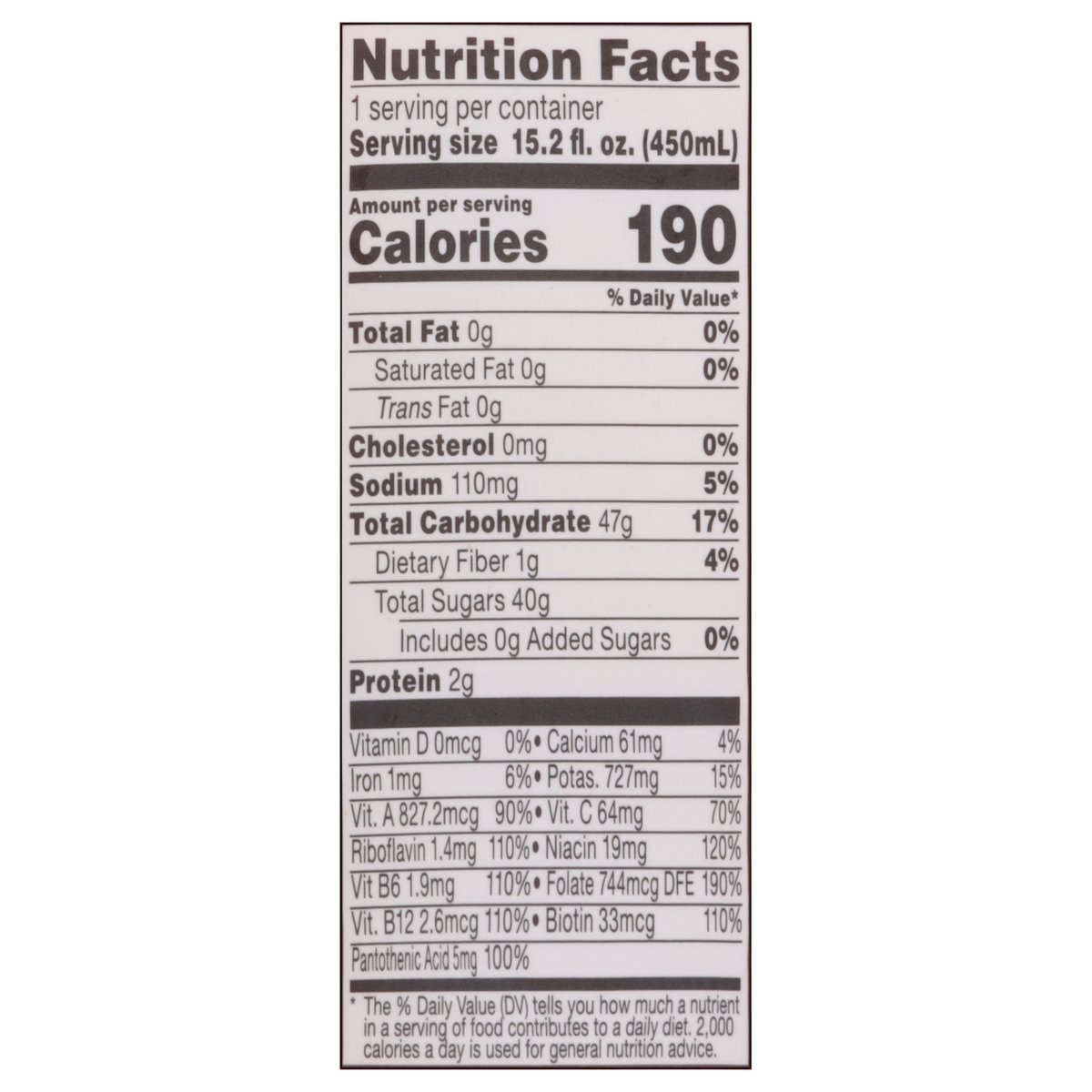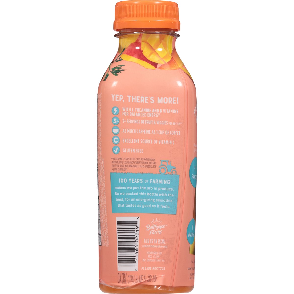Blend of from & not from concentrat juices with added ingredients. No artificial preservatives, colors, or flavors. 3-3/4 Fruit & veg servings (One servings = 1\2 cup of juice daily recommendation (MYplate Gov): 2 Cups-EQ of a variety of fruit, veg and fruit/veg juices including whole fruits & veggies, for a 2000 calorie diet) per bottle. Gluten free. No sugar added (Not a low calorie food). See nutrition facts for sugar and calorie content. With B vitamins & 80 mg caffeine per bottle. With L-theanine and B vitamins for balanced energy. Excellent source of vitamin C. Feel good about what's inside. No artificial preservatives, or colors. Flash pasteurized and cold-filled for quality. Yep, there's more! With L-theanine and B vitamins for balanced energy. 100 years of farming means we put the pro in produce. So we packed this bottle with the best, for an energizing smoothie that tastes as good as it feels. www.bolthouse.com. Find us on social! (at)bolthousefarms. Find us on social (at)bolthousefarms. For questions or comments call 1-800-467-4683, M-F 8 AM - 4 PM PT. Please recycle.