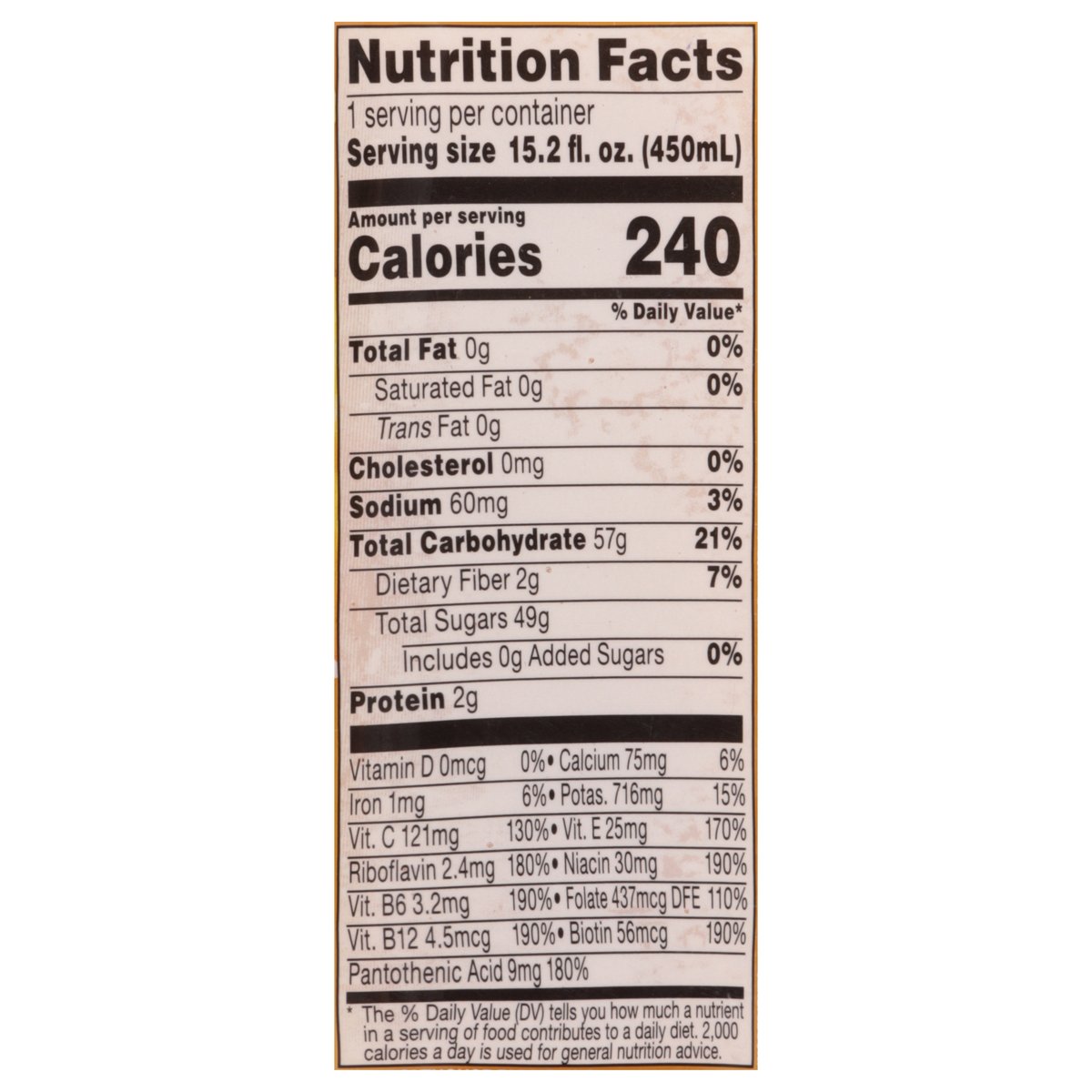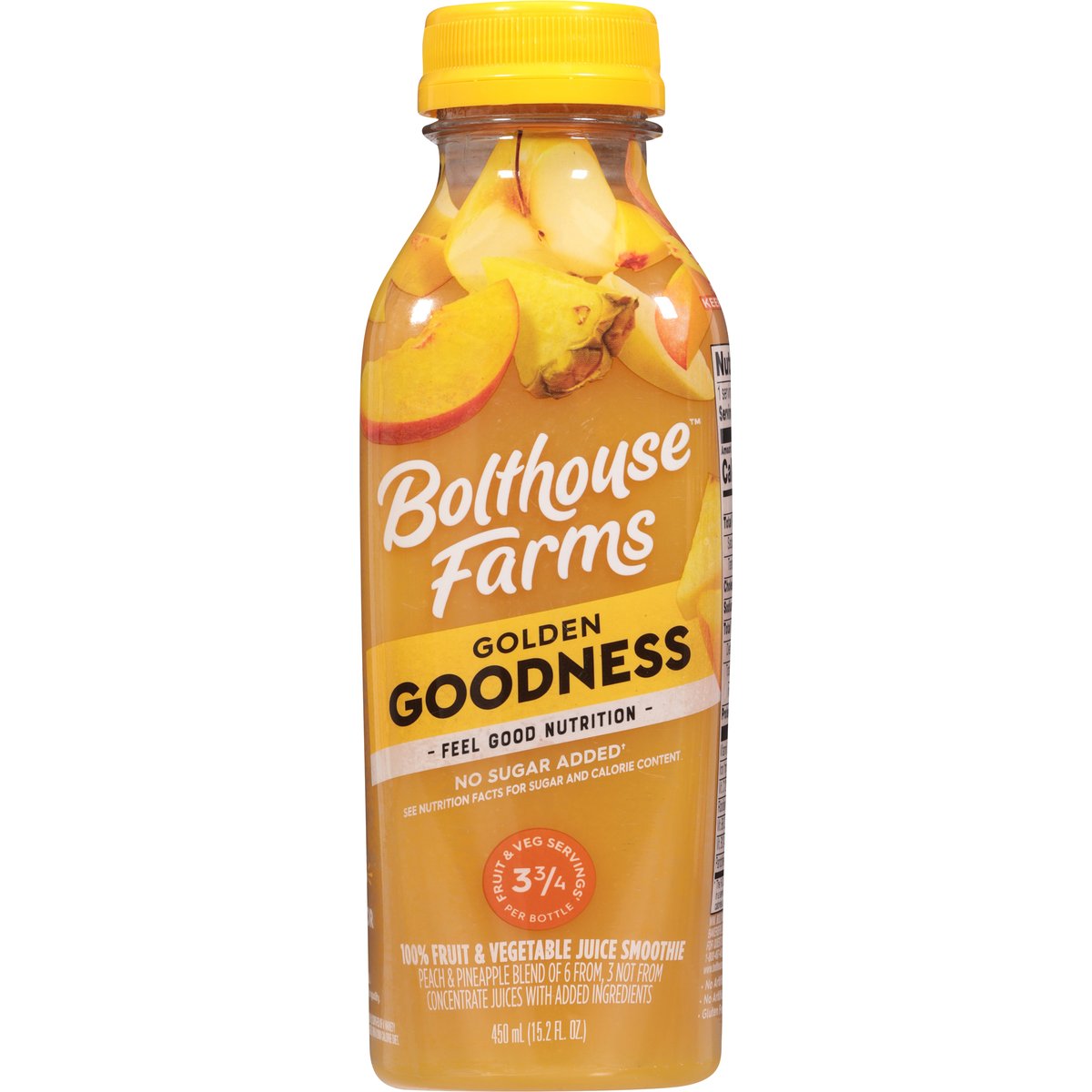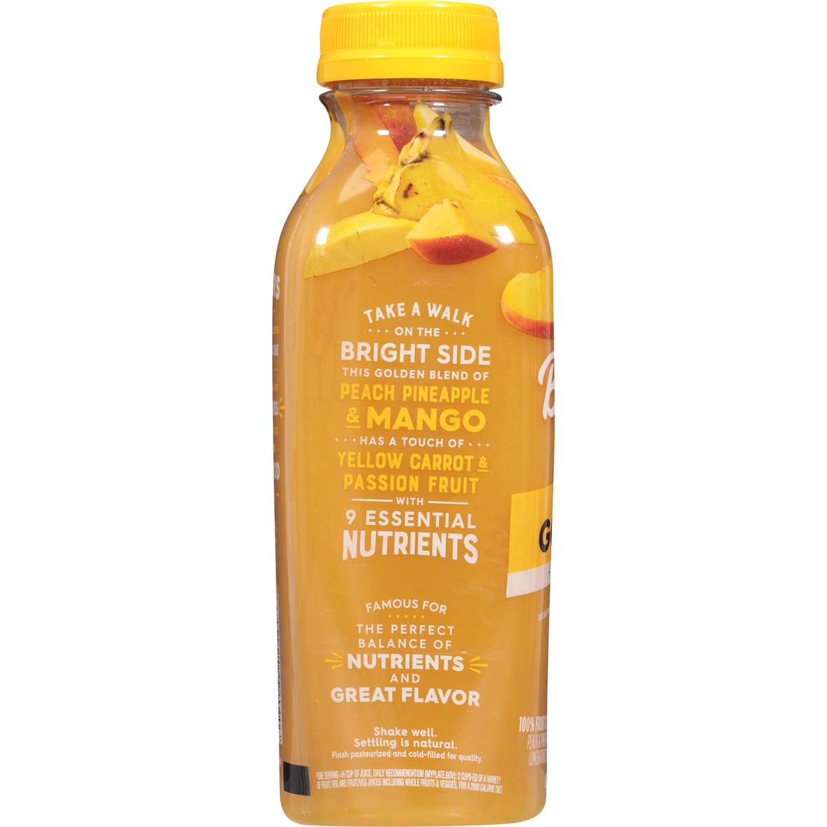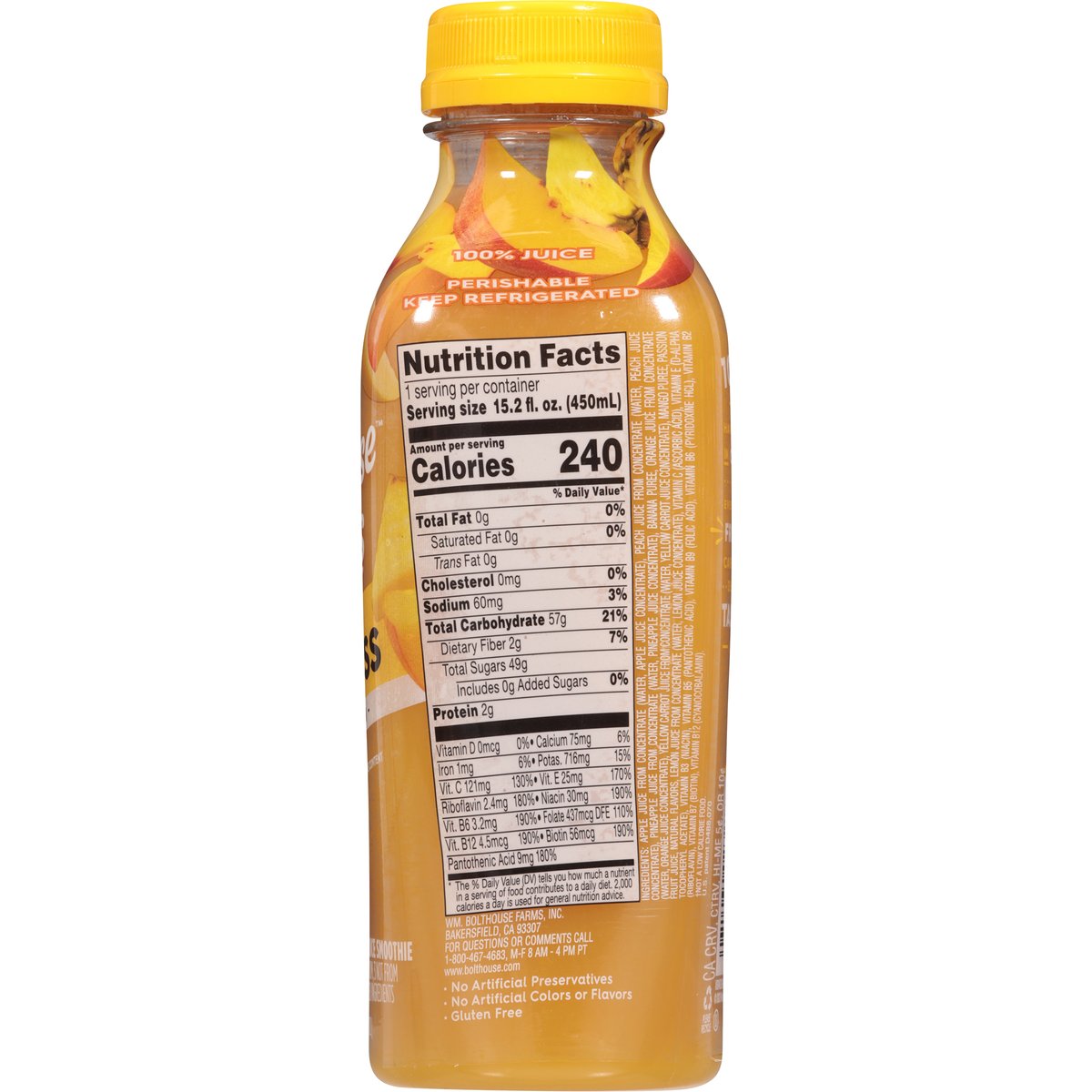No artificial colors, or flavors. Gluten free. No sugar added (Not a low calorie food). See nutrition panel for sugar and calorie content. Feel good nutrition. Take a walk on the bright side this golden blend of peach pineapple & mango has a touch of yellow carrot & passion fruit with 9 essential nutrients. Famous for the perfect balance of nutrients and great flavor. Flash pasteurized and cold-filled for quality. 100 years of farming have made us big believers in cultivating more so we fill every bottle with loads of fruits & veggies carefully crafted into delicious blends that taste as good as they feel. No artificial preservatives. www.bolthouse.com. Find us on social: (at)bolthousefarms. For questions or comments call 1-800-437-4683, M-F 8 AM - 4 PM PT. Please recycle.