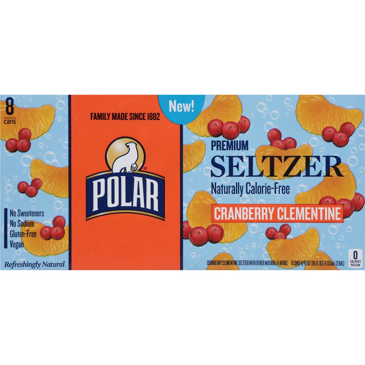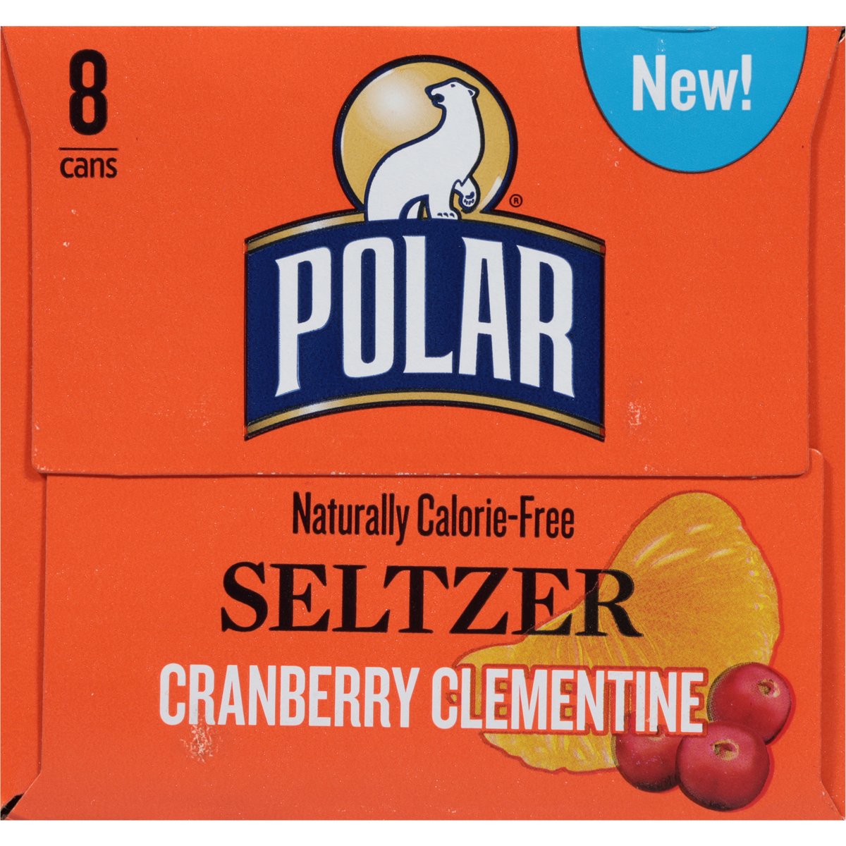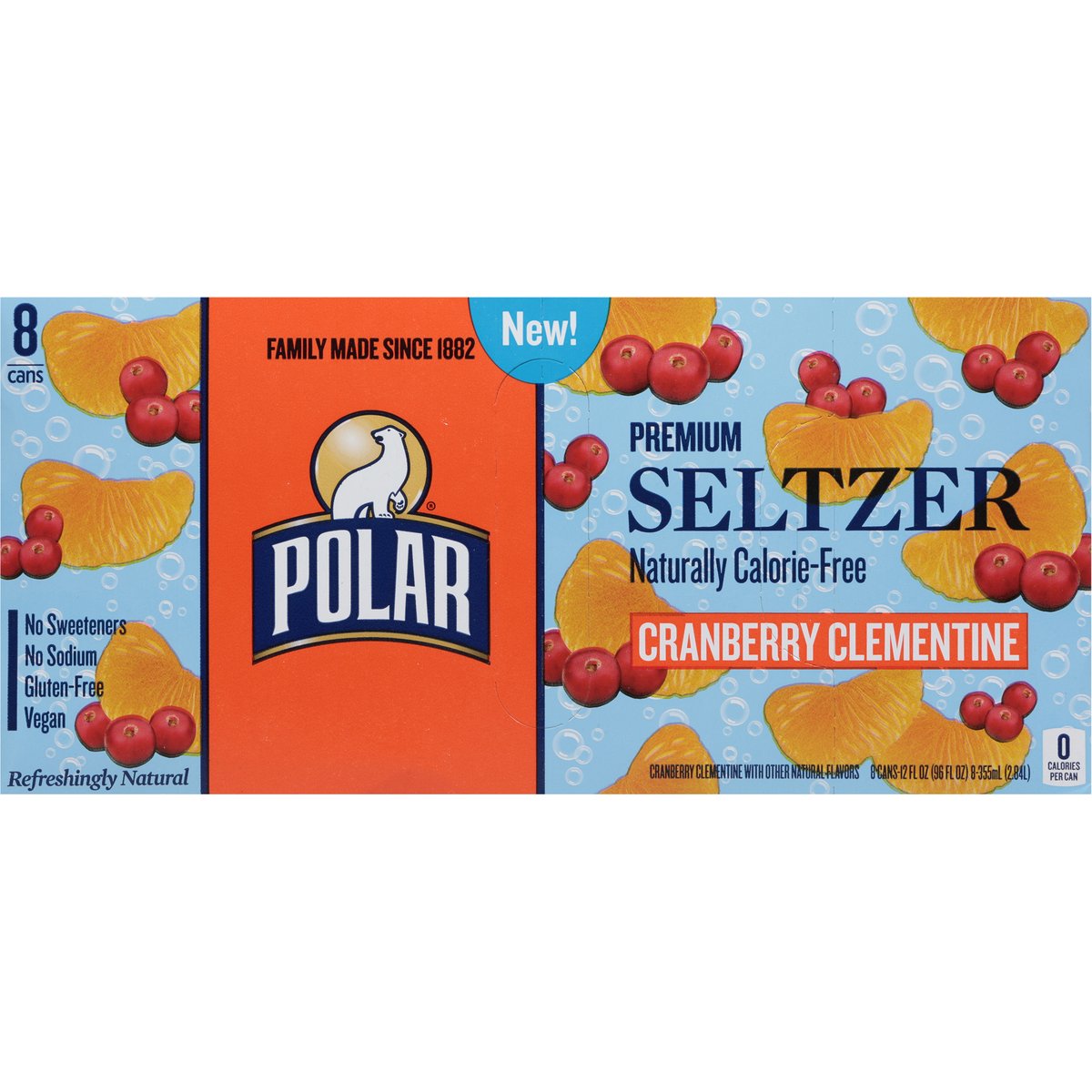 Cranberry clementine seltzer with other natural flavors. 0 calories per can. No sodium. Gluten-free. Vegan. Naturally calorie-free. New! Family made since 1882. No sweeteners. Refreshingly natural. Our family has been making seltzer since 1882 when our great-great grandfather created what he called the best tasting bubble recipe with only three ingredients-water, bubbles & great taste. We continue to craft seltzer without sugar, sweeteners, sodium or caffeine, and they are always vegan and gluten-free. PolarSeltzer.com. #PolarSeltzer. Please recycle.