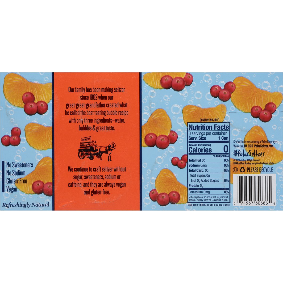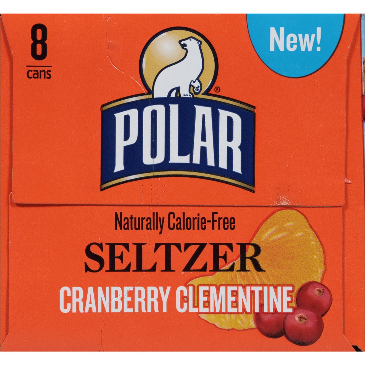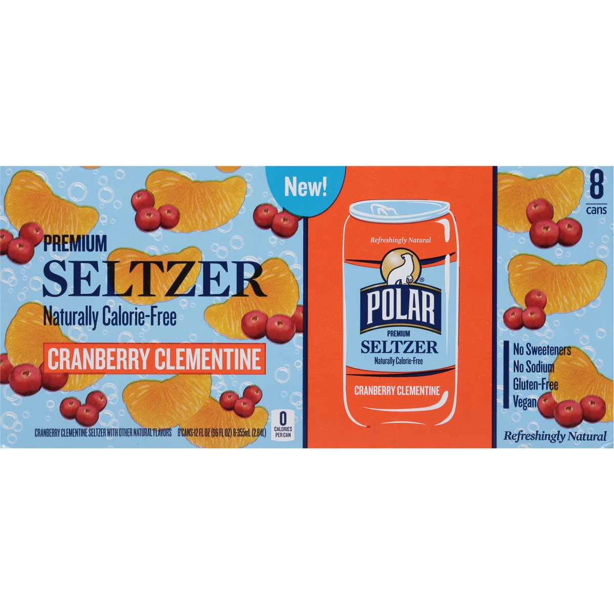 Cranberry clementine seltzer with other natural flavors. 0 calories per can. No sodium. Gluten-free. Vegan. Naturally calorie-free. New! Family made since 1882. No sweeteners. Refreshingly natural. Our family has been making seltzer since 1882 when our great-great grandfather created what he called the best tasting bubble recipe with only three ingredients-water, bubbles & great taste. We continue to craft seltzer without sugar, sweeteners, sodium or caffeine, and they are always vegan and gluten-free. PolarSeltzer.com. #PolarSeltzer. Please recycle.