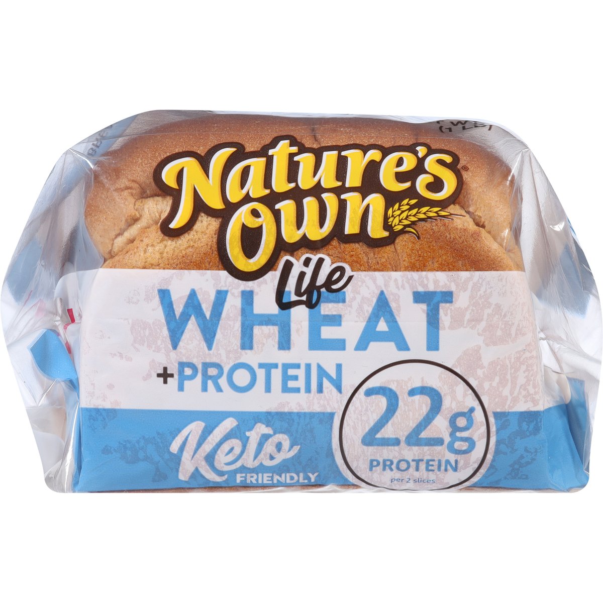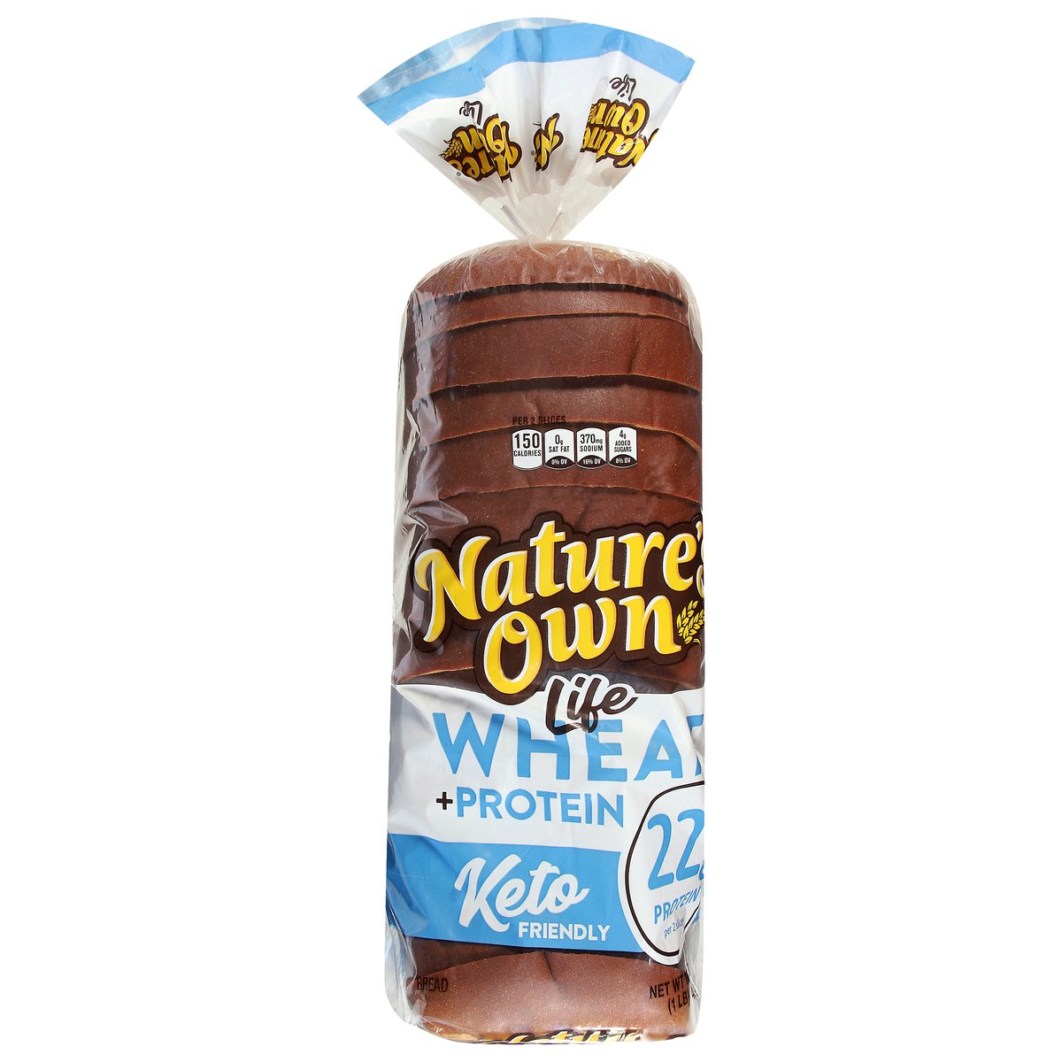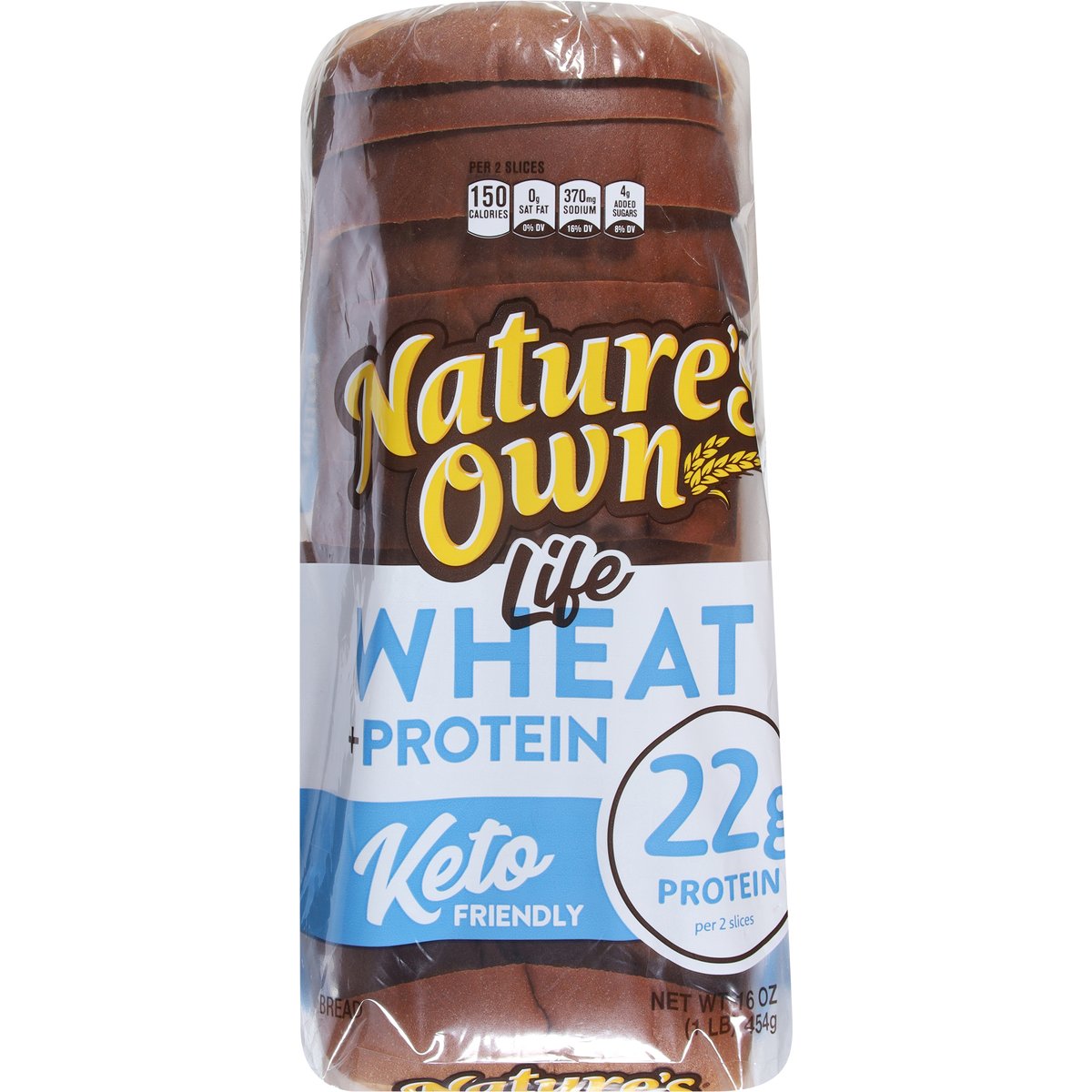 22 g protein per 2 slices. Per 2 Slices: 150 calories; 0 g sat fat (0% DV); 370 mg sodium (16% DV); 4 g added sugars (8% DV). 9 g carbs - 4.5 g fiber = 4.5 net carbs per slice. Wheat + Protein: We have worked incredibly hard to deliver a great tasting 11 g of protein per slice wheat bread that is also Keto friendly. This bread is easy on the taste buds and waistlines alike. We think you are going to really like it. Go ahead - live the good life. Keto friendly. A low fat food. A cholesterol free food. Get to know your bread. At Nature's Own, we believe in getting the most out of life. From the foods we eat to the breads we make, we want our products to not only be delicious to the last bite, but also deliver on some very specific dietary choices. That's why our line of Nature's Own Life breads are designed to do just that. Great tasting breads like our... Know Your Grains - Wheat and whole grains are nutritious and delicious! Nature's Own offers a wide range of tastes, textures, and nutritional benefits. To include whole grain and whole wheat in your diet, explore product options like: 100% Whole Wheat, 100% Whole Wheat with Honey, 100% Whole Grain and Sugar Free 100% Whole Grain. All four of which are a source of whole grains. naturesownbread.com. X: @Natures_Own. #NaturesOwn. Facebook. Questions or comments? Let's connect... naturesownbread.com or give us a call at 1-866-245-8921 Monday-Friday 8 a.m. - 5 p.m. EDT.