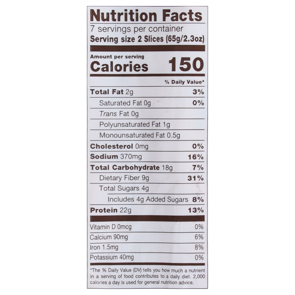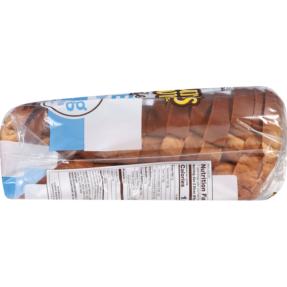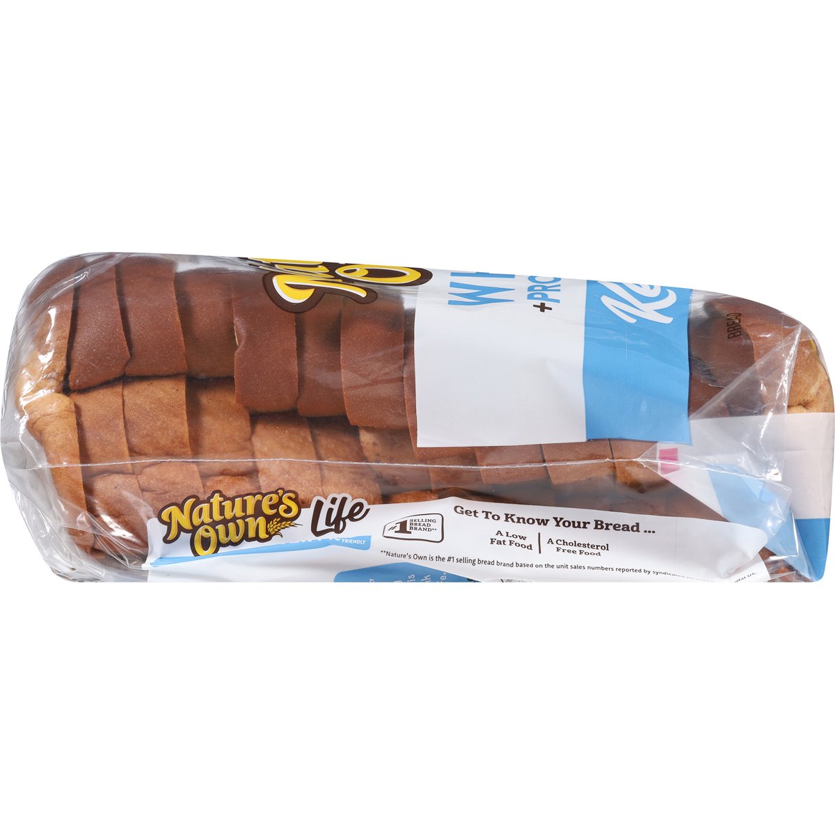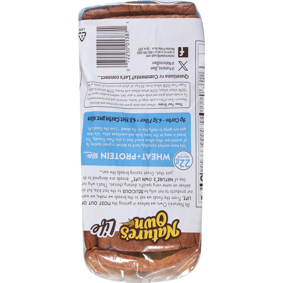 22 g protein per 2 slices. Per 2 Slices: 150 calories; 0 g sat fat (0% DV); 370 mg sodium (16% DV); 4 g added sugars (8% DV). 9 g carbs - 4.5 g fiber = 4.5 net carbs per slice. Wheat + Protein: We have worked incredibly hard to deliver a great tasting 11 g of protein per slice wheat bread that is also Keto friendly. This bread is easy on the taste buds and waistlines alike. We think you are going to really like it. Go ahead - live the good life. Keto friendly. A low fat food. A cholesterol free food. Get to know your bread. At Nature's Own, we believe in getting the most out of life. From the foods we eat to the breads we make, we want our products to not only be delicious to the last bite, but also deliver on some very specific dietary choices. That's why our line of Nature's Own Life breads are designed to do just that. Great tasting breads like our... Know Your Grains - Wheat and whole grains are nutritious and delicious! Nature's Own offers a wide range of tastes, textures, and nutritional benefits. To include whole grain and whole wheat in your diet, explore product options like: 100% Whole Wheat, 100% Whole Wheat with Honey, 100% Whole Grain and Sugar Free 100% Whole Grain. All four of which are a source of whole grains. naturesownbread.com. X: @Natures_Own. #NaturesOwn. Facebook. Questions or comments? Let's connect... naturesownbread.com or give us a call at 1-866-245-8921 Monday-Friday 8 a.m. - 5 p.m. EDT.