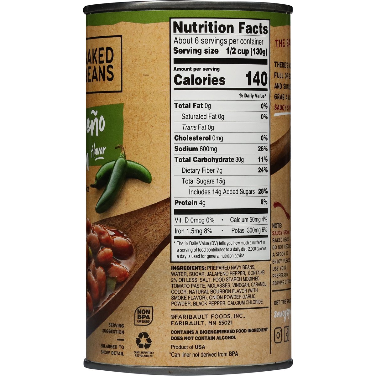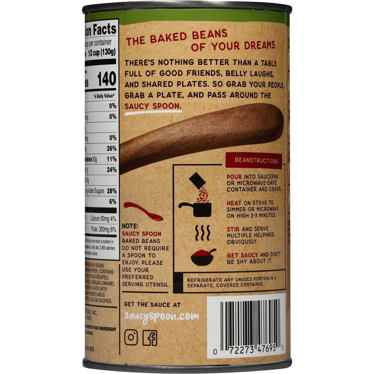 Spice things up with jalapenos and bourbon flavor. Gluten free. No fat. Vegetarian. Excellent source of fiber. See nutrition information for sodium content. Contains a bioengineered food ingredient. Focused on flavor. The baked beans of your dreams. There’s nothing better than a table full of good friends, belly laughs, and shared plates. So grab your people. Grab a plate, and pass around the saucy spoon. Does not contain alcohol. saucyspoon.com. Instagram. Facebook. Get the sauce at saucyspoon.com. Non-BPA can lining*. Cans: Infinitely recyclable. *Can liner not derived from BPA. Cans: Infinitely recyclable. Product of USA.