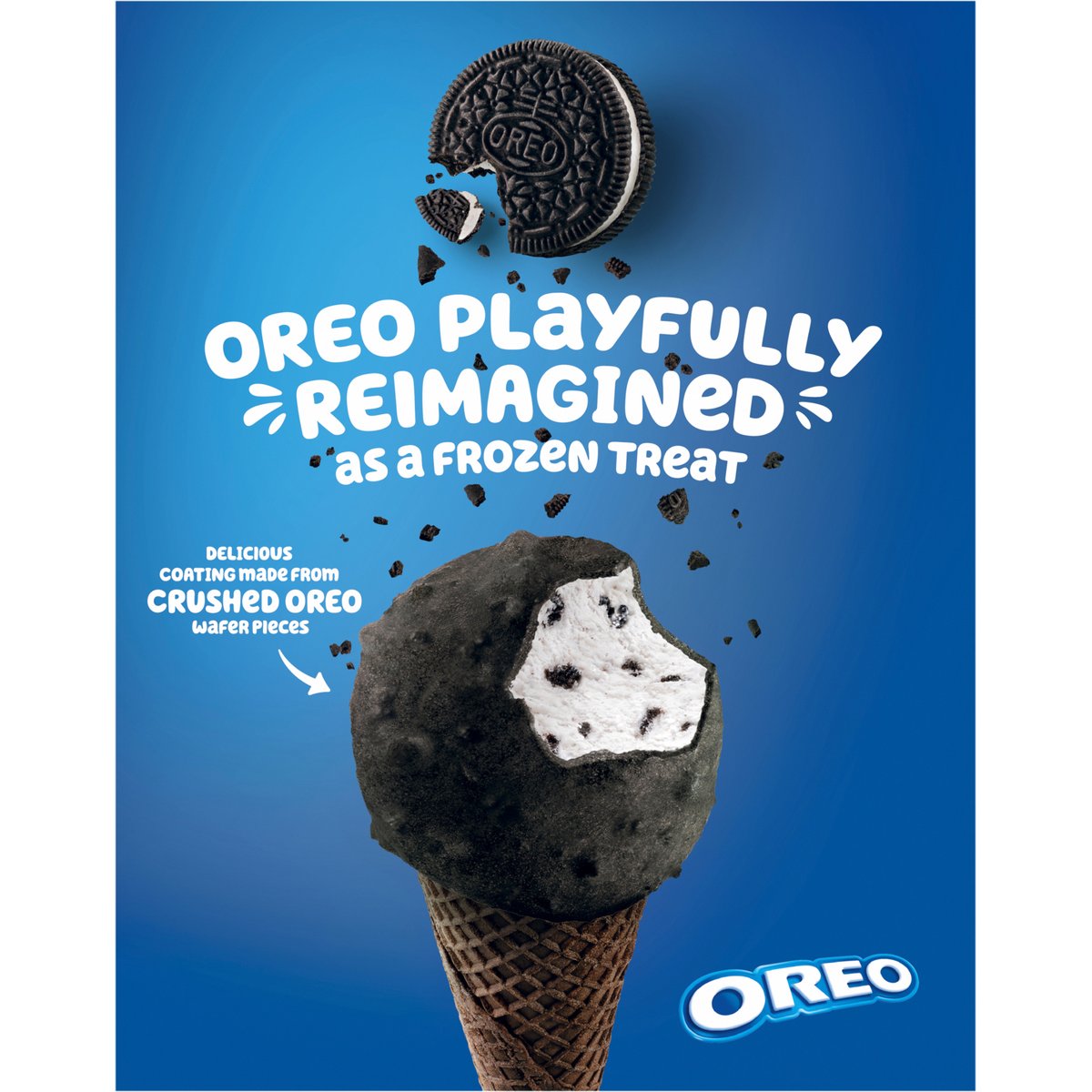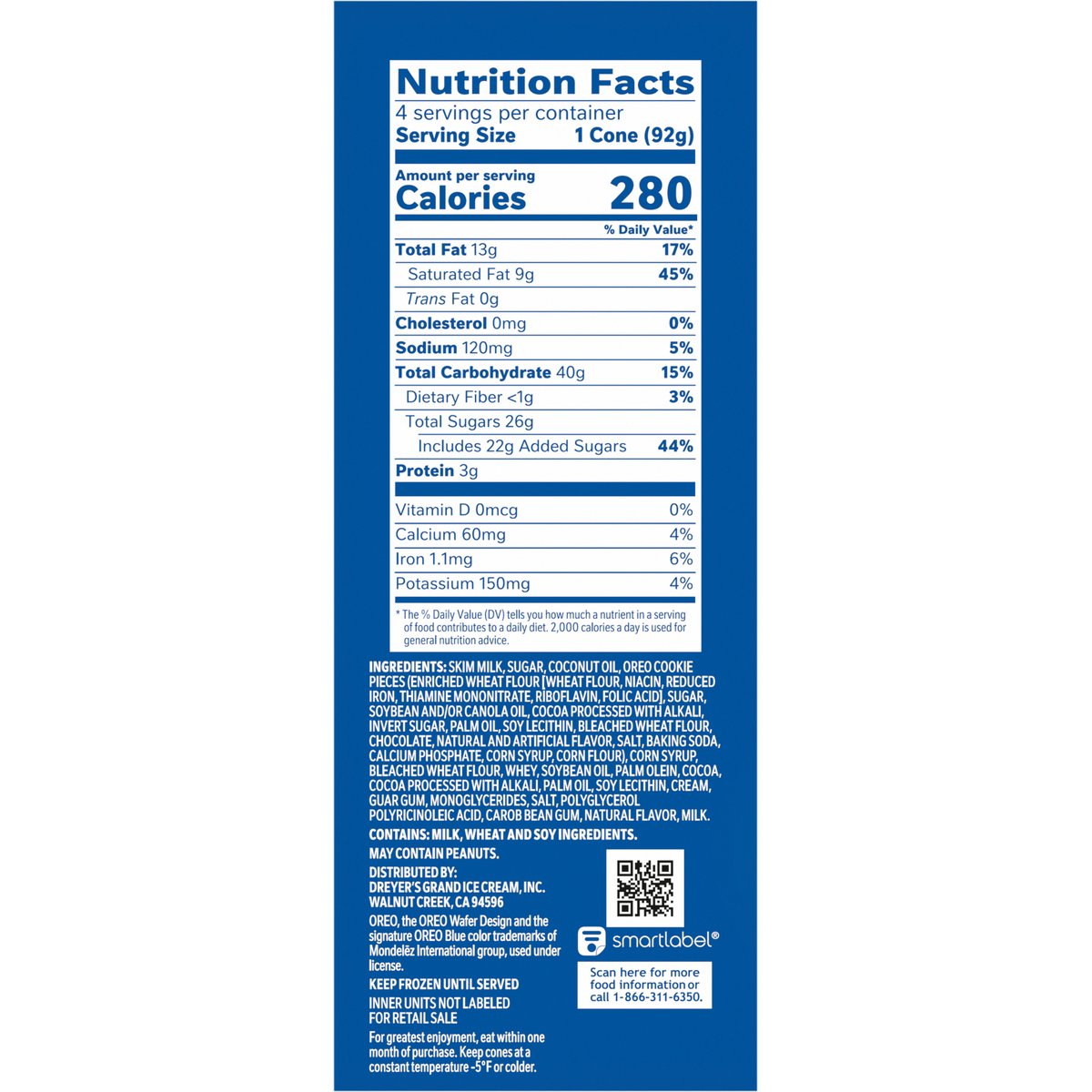 Chocolatey cones filled with Oreo frozen dairy dessert. 280 calories per 1 cone. See nutrition information for saturated fat content. Oreo playfully reimagined as a frozen treat. Delicious coating made from crushed Oreo wafer pieces. Enjoy America's favorite cookie as a tasty frozen treat Crispy chocolatey cones are filled with creme-flavored frozen dairy dessert packed with Oreo cookie pieces, then dipped in a delicious coating made from crushed Oreo wafer pieces. Inner units not labeled for retail sale. oreofrozentreats.com. SmartLabel: Scan for more food information or call 1-866-311-6350. Questions/Comments? Go to oreofrozentreats.com. It's a cool new way to enjoy Oreo! Try our other delicious treats. Please recycle this carton. Please recycle this carton.